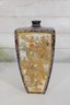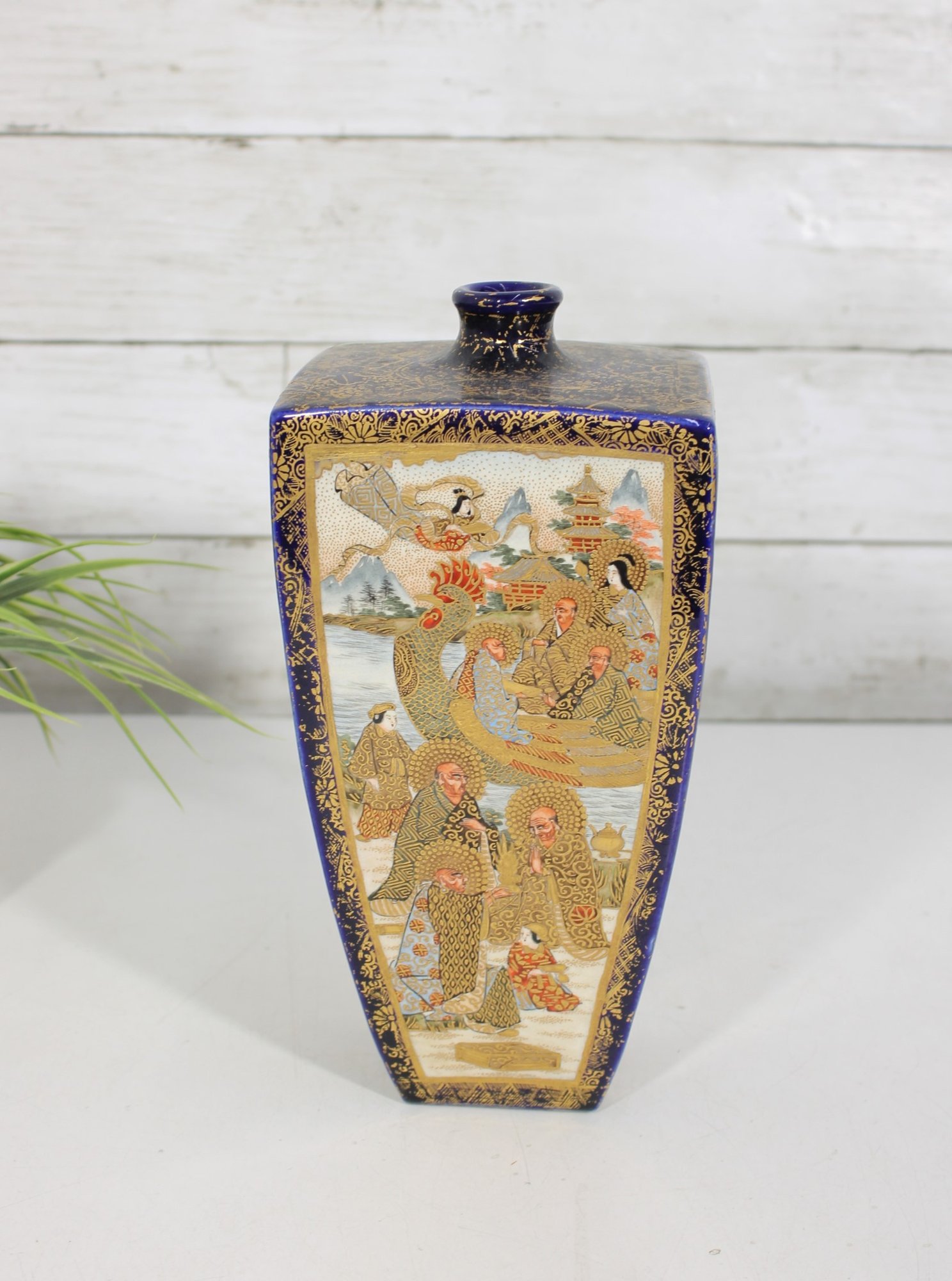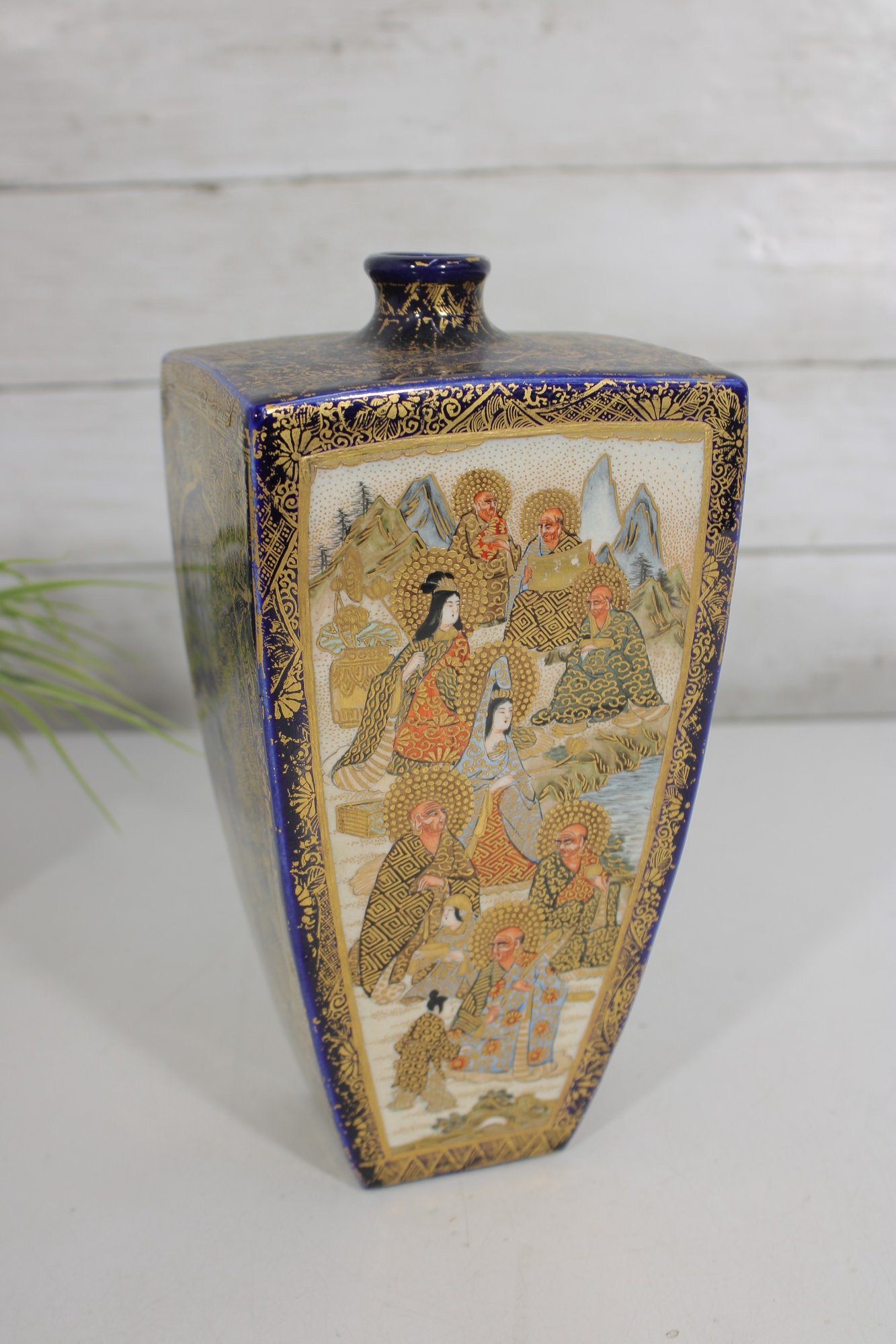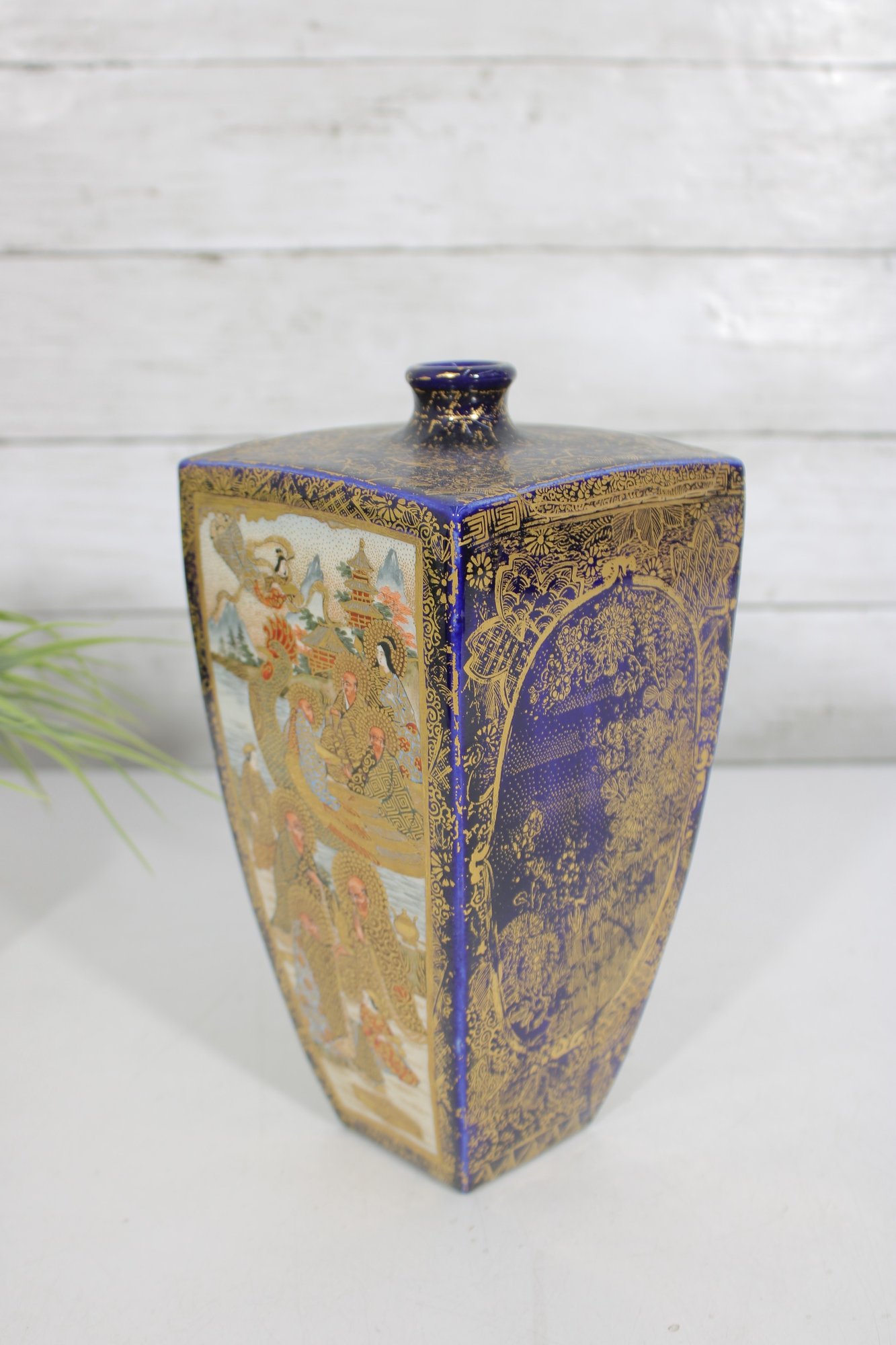 The contrast between the vivid blue background and the elaborate gold enamel work highlights the exceptional craftsmanship associated with Satsuma ware. The narrow neck and geometric tapering body give the piece a refined and architectural silhouette.