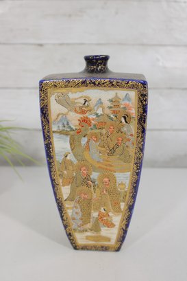 Fine Japanese Meiji period Satsuma vase of elegant tapered form, richly decorated with intricate hand-painted figural scenes and extensive gilt detailing. The vase features shaped panels depicting finely rendered figures in traditional settings, surrounded by densely patterned gold decoration on a deep cobalt blue ground.