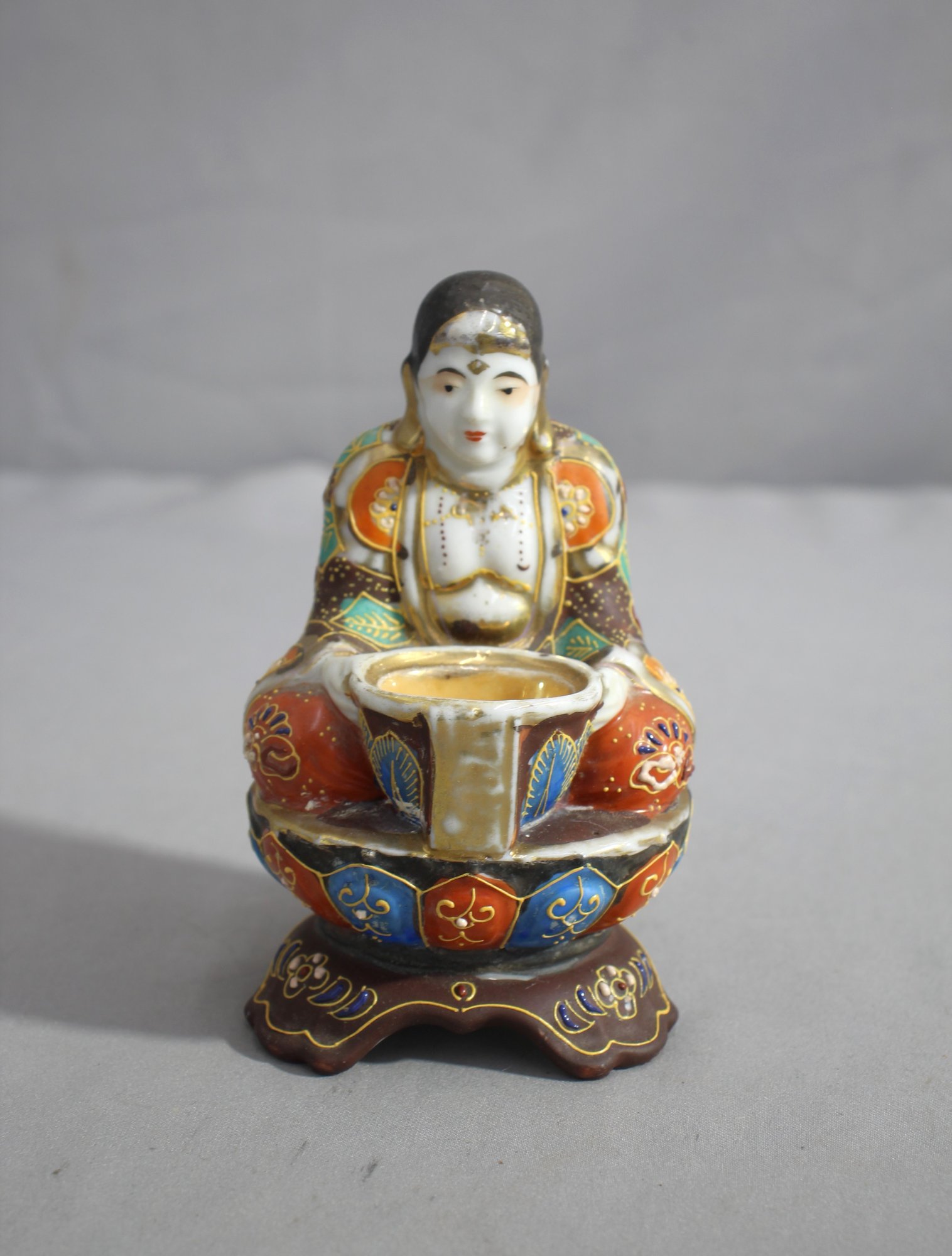 The burner sits atop a floriform base with upturned edges, adorned with cobalt blue and vibrant red enamels, accented by swirling gold motifs that complement the overall design. The central vessel, designed for holding incense, adds both functionality and a touch of elegance to the piece.