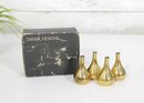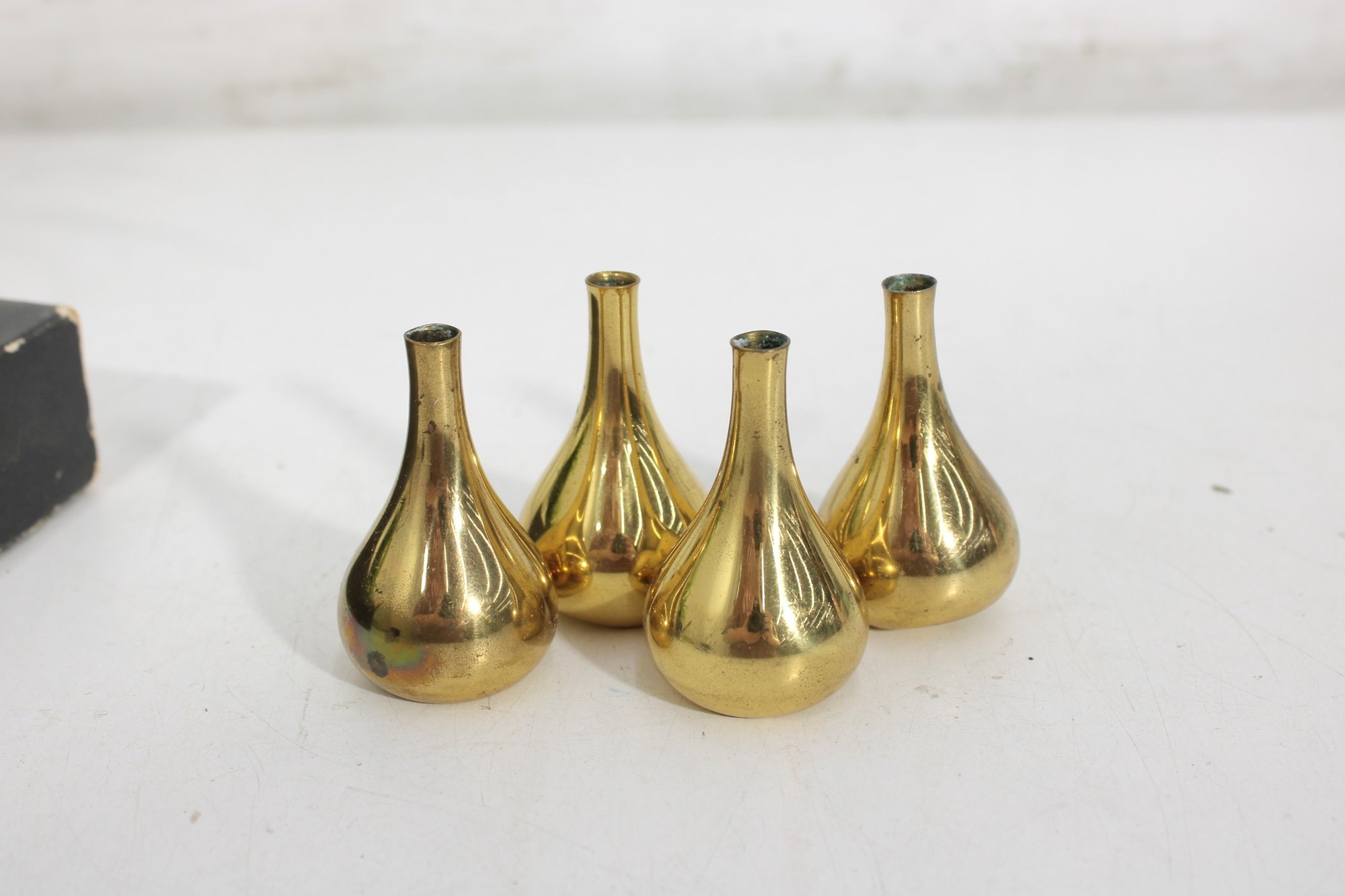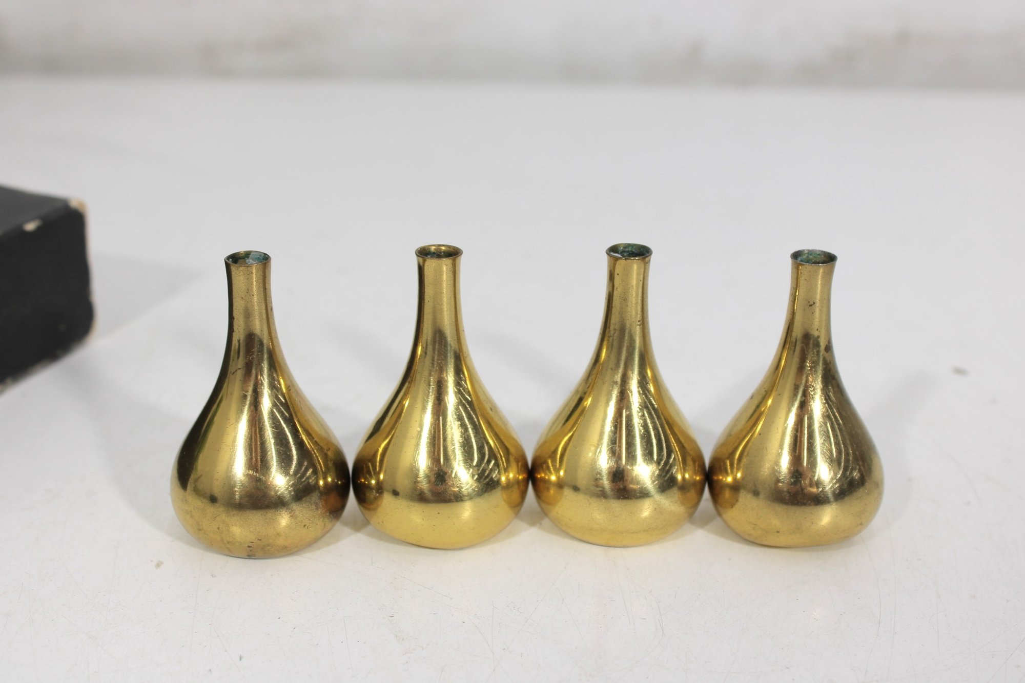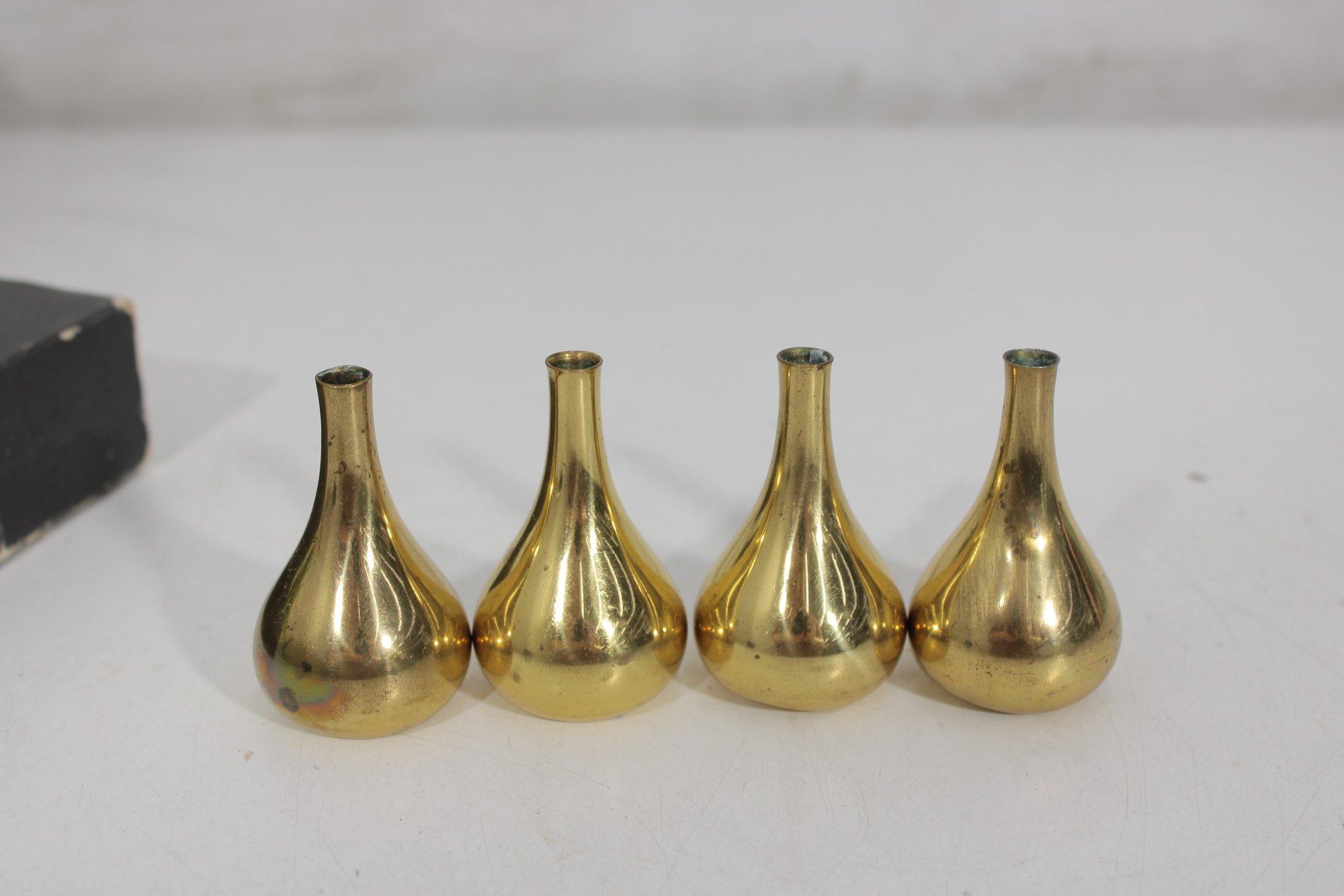 Set of four vintage brass candle holders designed by Jens H. Quistgaard for Dansk Designs. These iconic mid-century modern pieces feature a sculptural teardrop form with a polished brass finish, embodying Quistgaard’s signature minimalist yet elegant aesthetic.