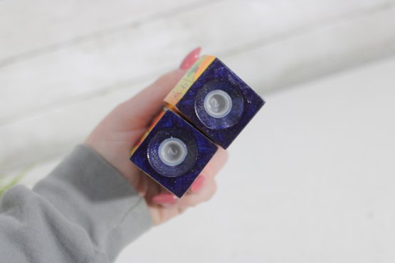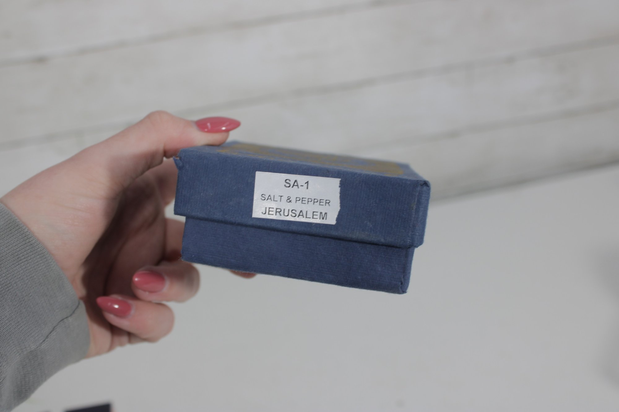 The set comes with its original box labeled “Jerusalem,” adding to its collectible appeal. Each shaker has a removable stopper on the bottom for easy filling.
