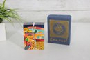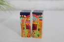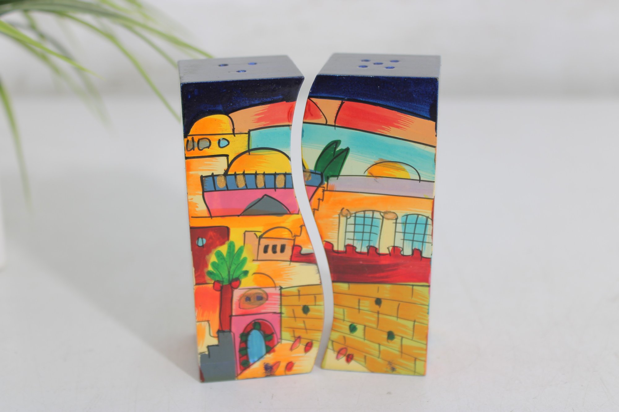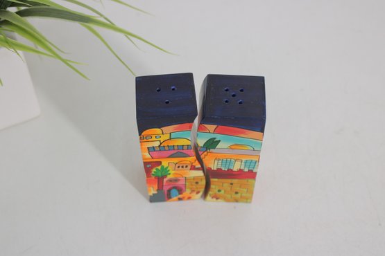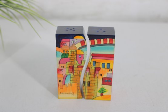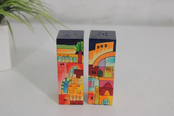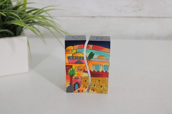 Vibrant and collectible salt and pepper shaker set featuring a charming Jerusalem cityscape design. This unique pair forms a complete panoramic scene when placed together, showcasing colorful buildings, palm trees, and a bright sky in a folk-art style.