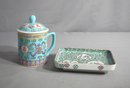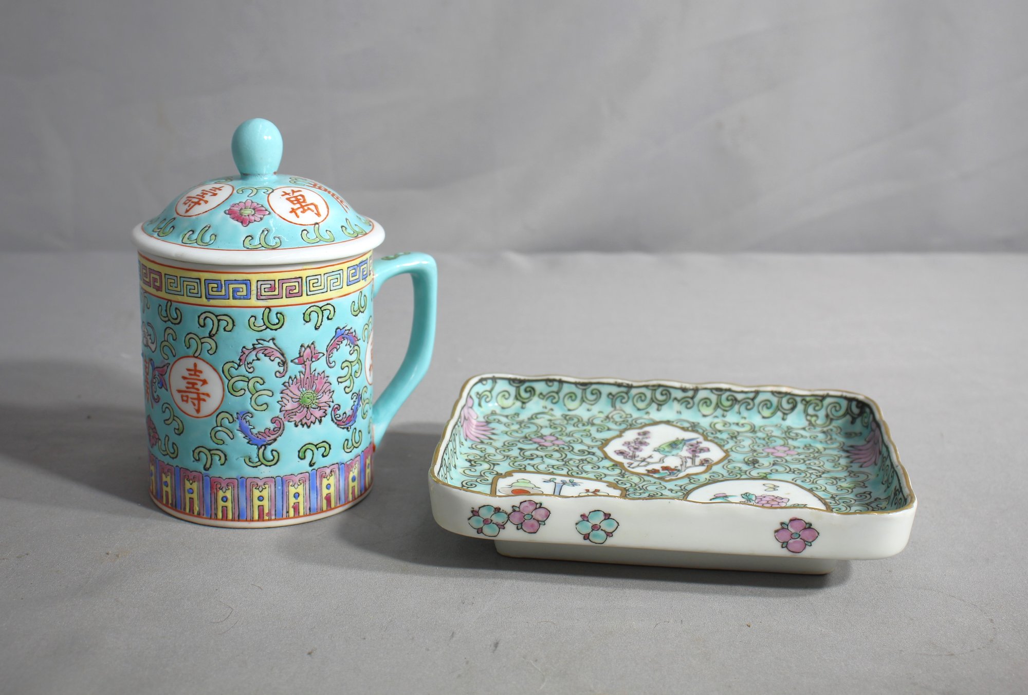 The mug, adorned with a turquoise famille rose pattern, exudes elegance with its intricate floral motifs and character inscriptions, symbolic of traditional Chinese blessings. The matching square plate echoes this design, featuring a delicate famille rose medallion center, framed by an ornate, swirling turquoise border accented with pink florals and gilt edges. This set not only embodies the rich heritage of Chinese ceramics but also serves as a functional piece of art.