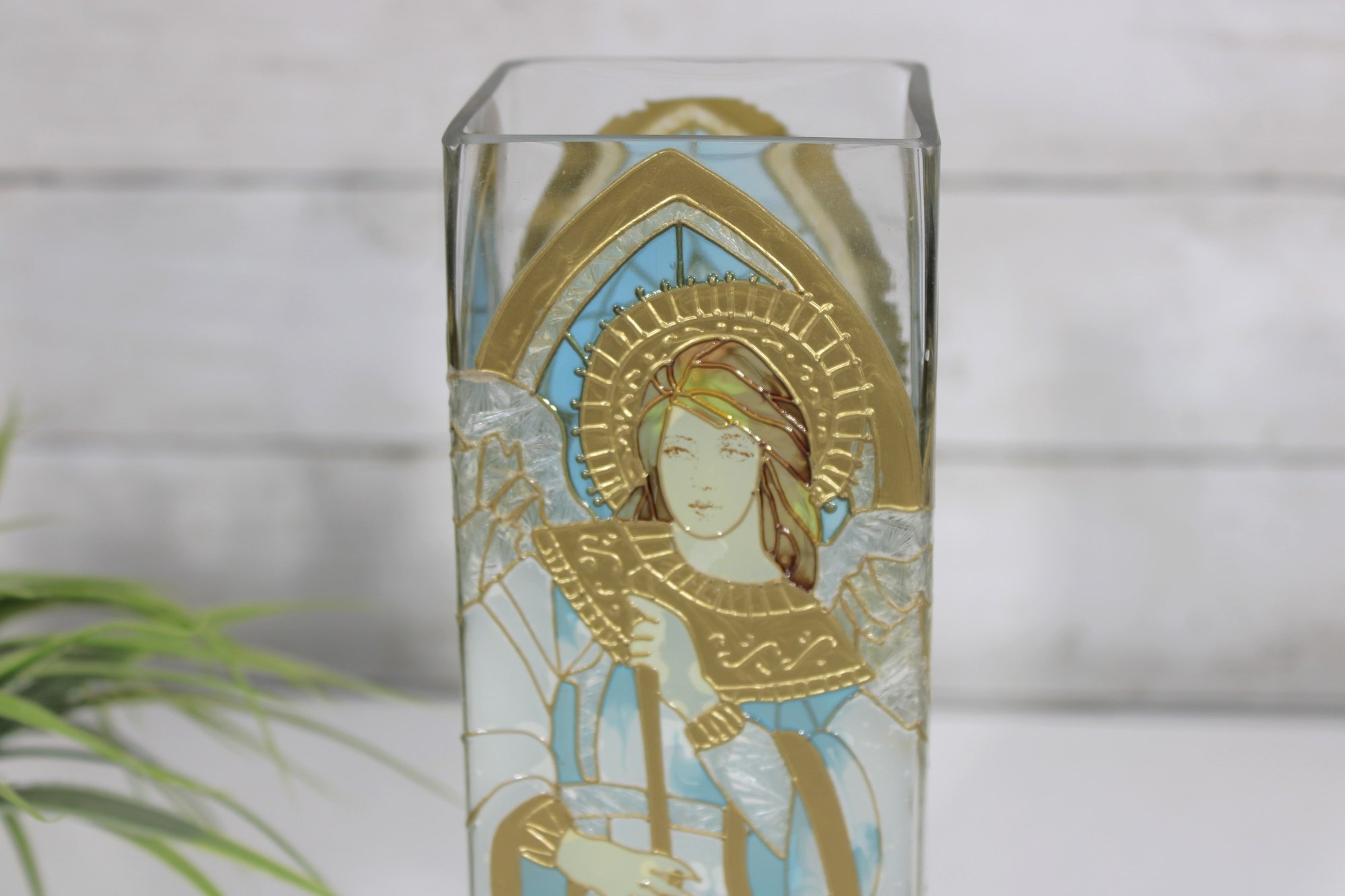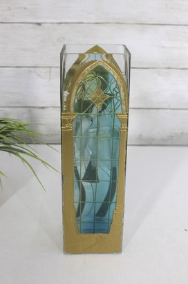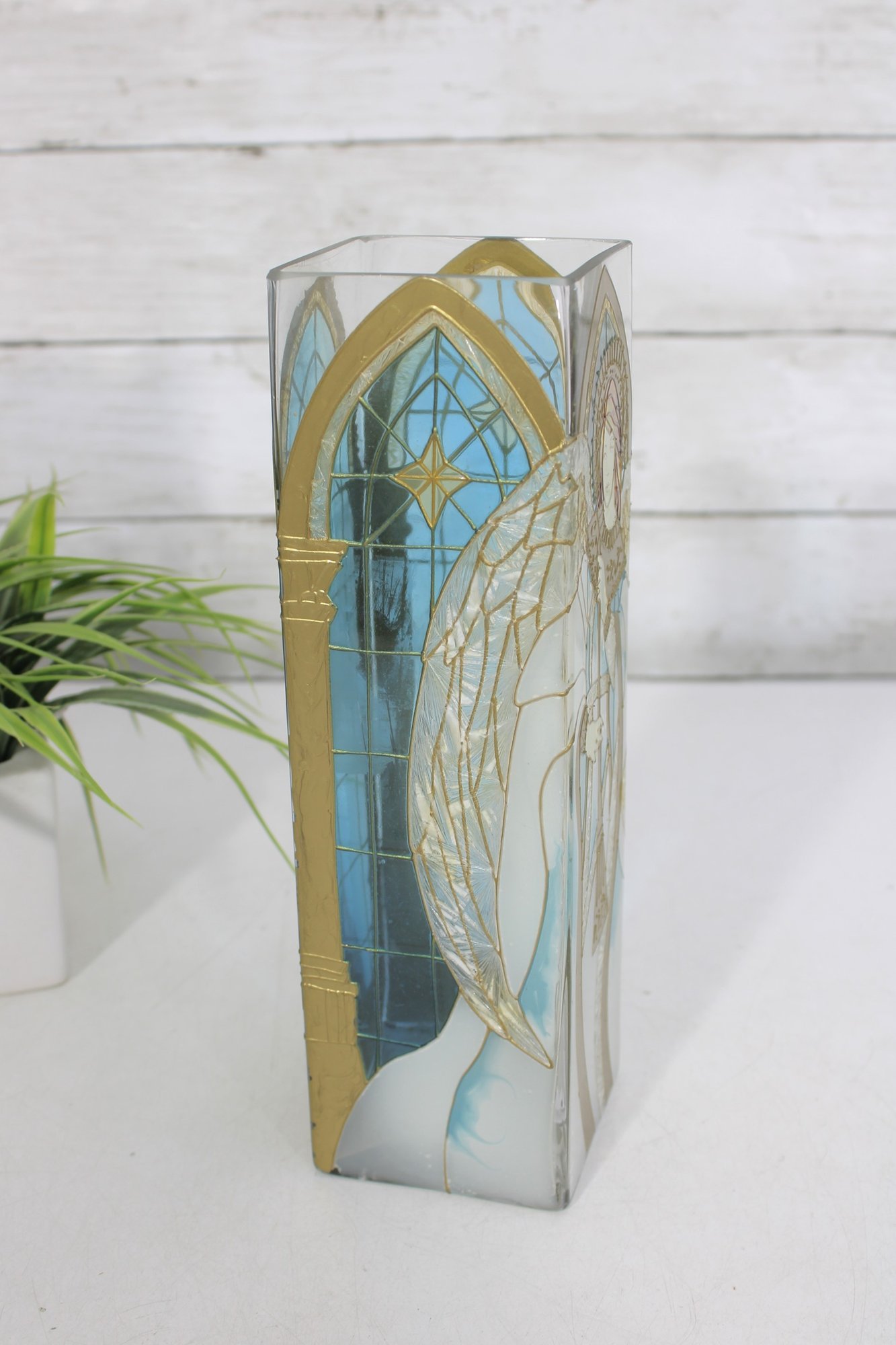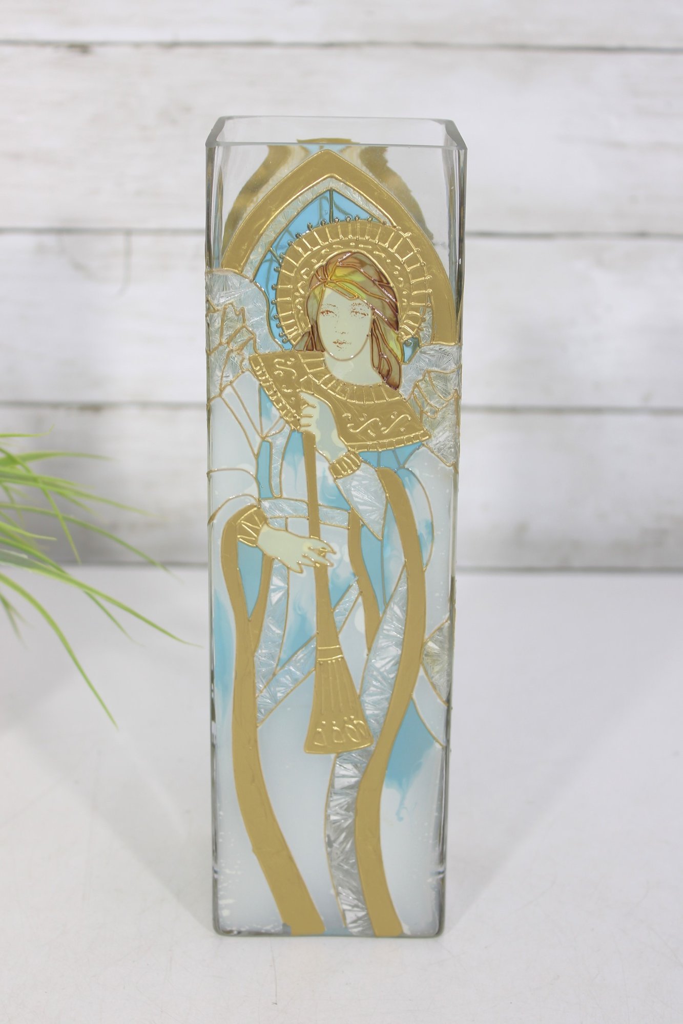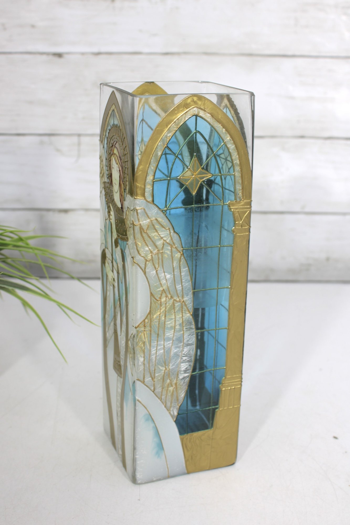 Joan Baker Designs hand-painted square vase featuring a beautiful stained glass–style angel motif accented with soft blues, gold tones, and intricate detailing. The graceful figure stands beneath an arched window design, giving the piece a serene, spiritual presence that makes it perfect for decorative display.