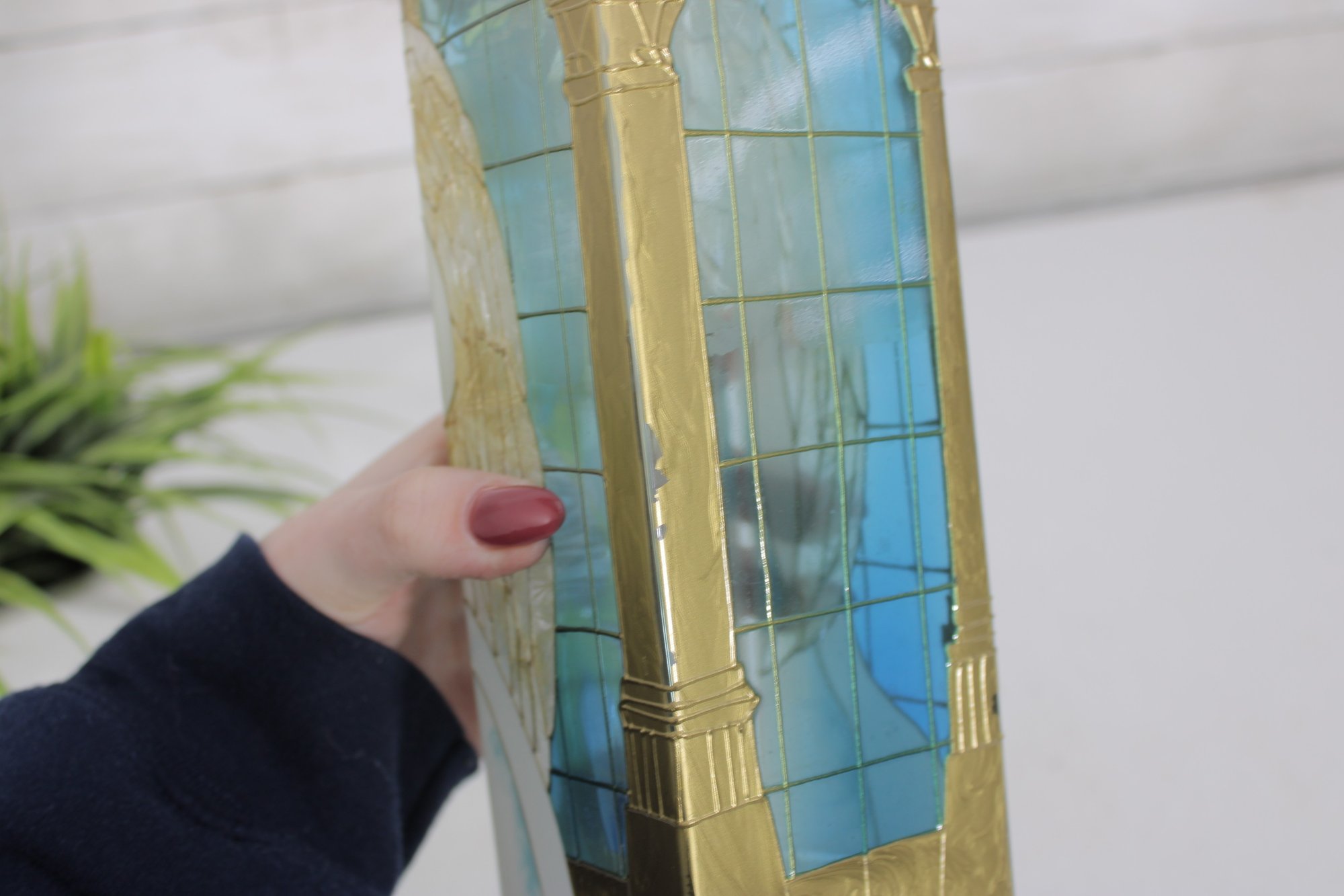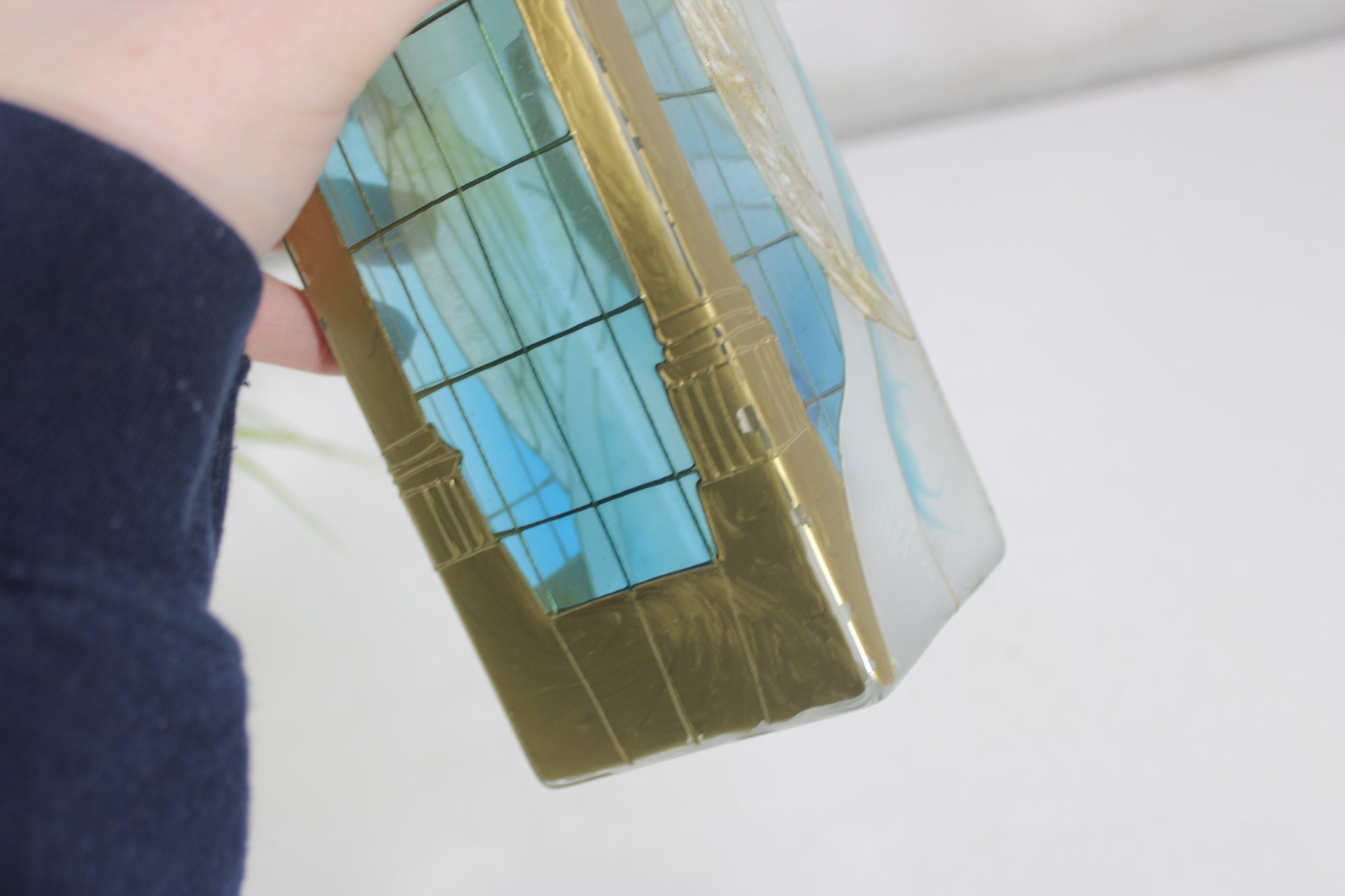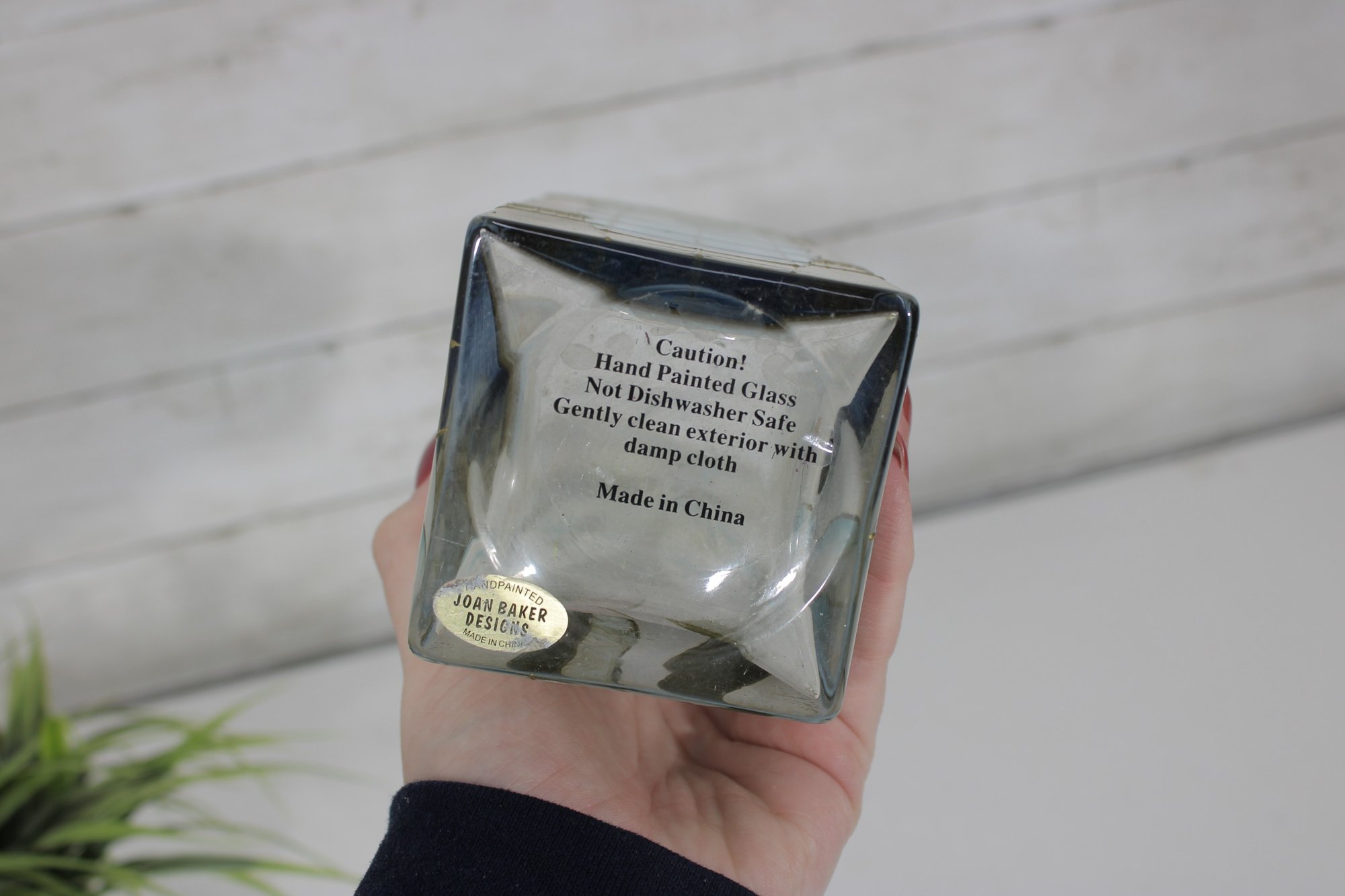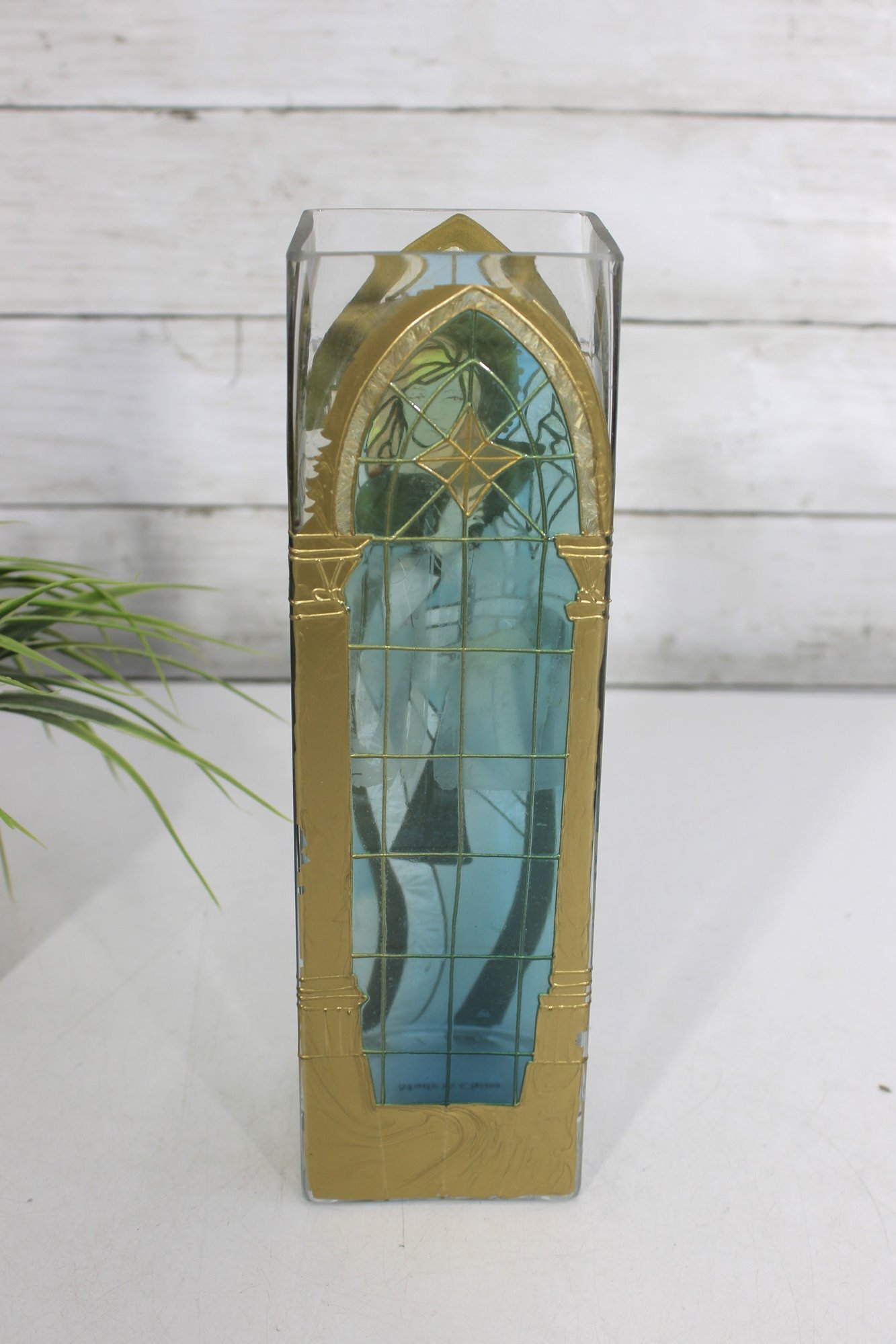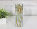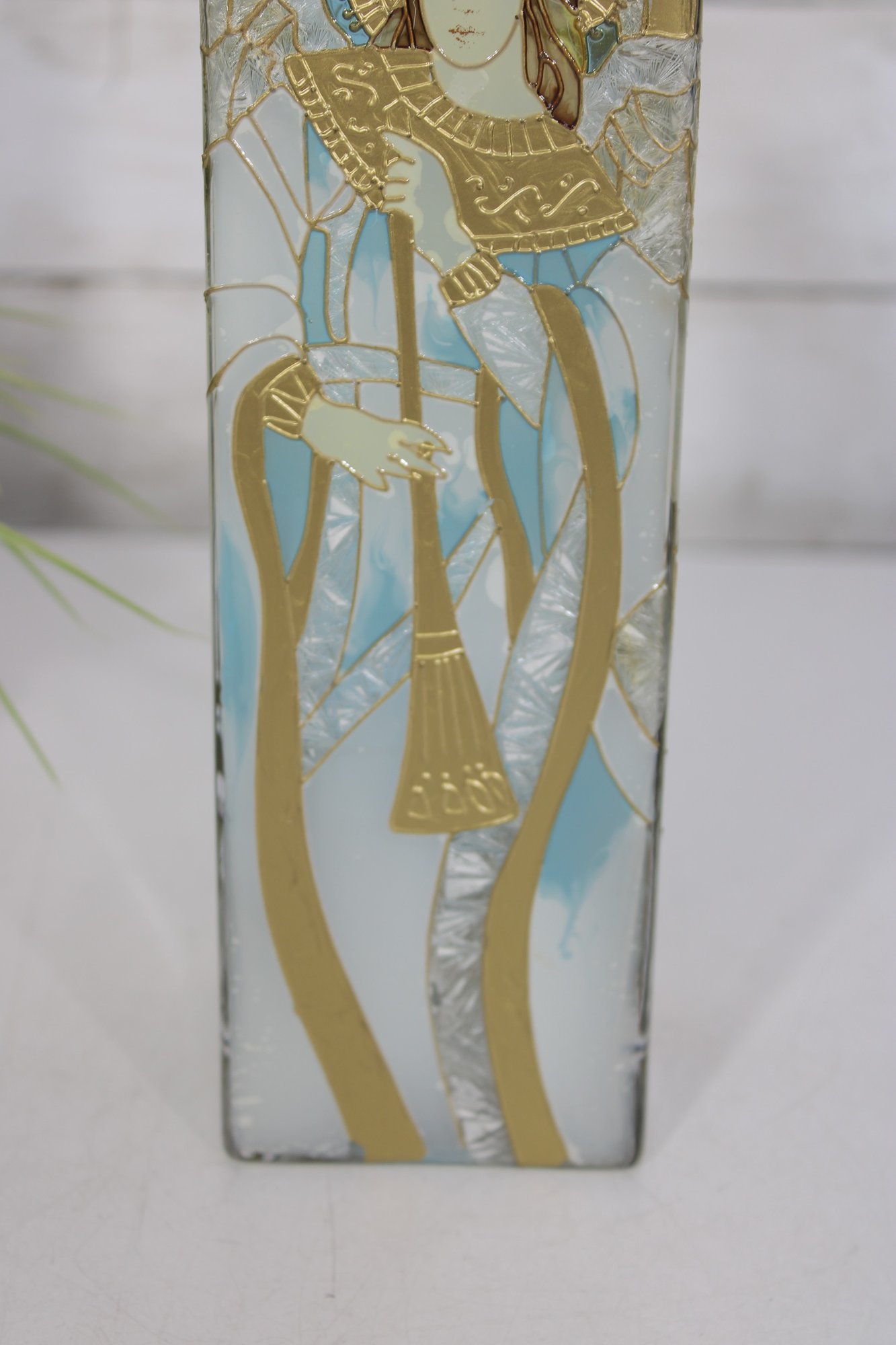 Joan Baker Designs hand-painted square vase featuring a beautiful stained glass–style angel motif accented with soft blues, gold tones, and intricate detailing. The graceful figure stands beneath an arched window design, giving the piece a serene, spiritual presence that makes it perfect for decorative display.
