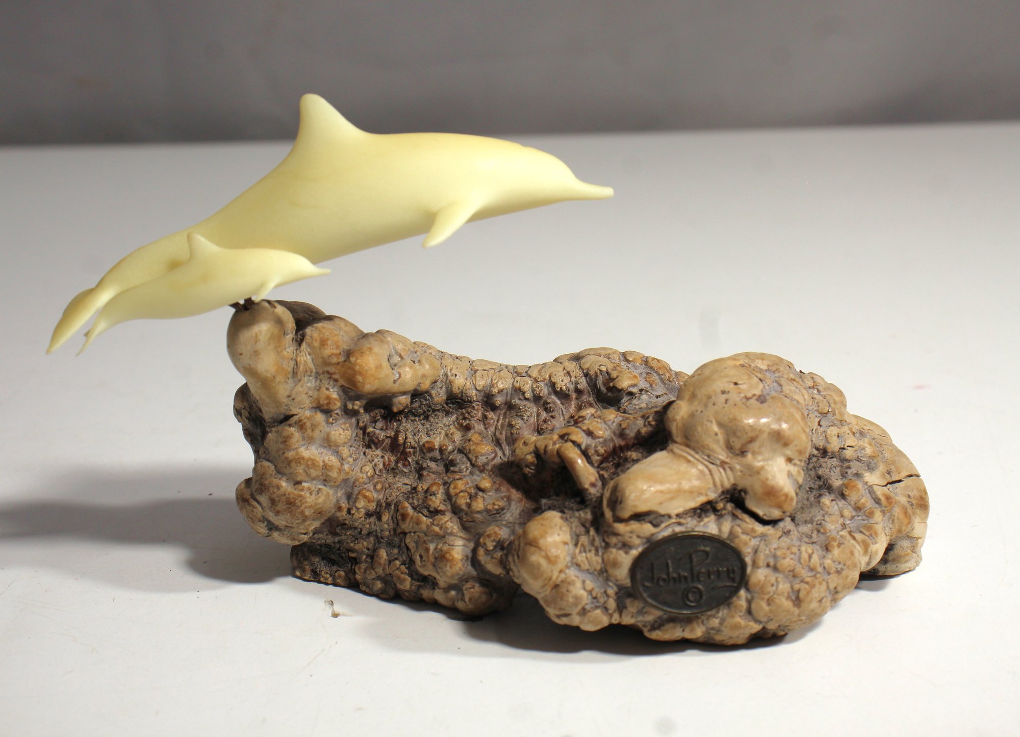 The natural wood base enhances the overall aesthetic, with its unique grain and texture creating a lovely contrast to the sleek dolphin forms. The artist's mark, a signature plaque reading "John Perry," is affixed to the base, authenticating the sculpture.