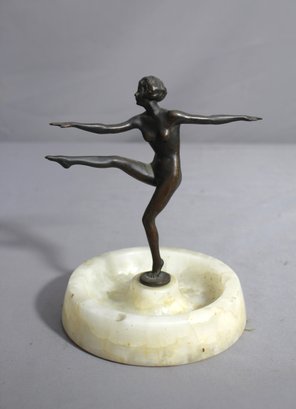 This striking Josef Lorenzl sculpture, featuring a delicate bronze figure of a dancer on a genuine onyx ashtray base, exemplifies the grace and style of the Art Deco period. The dancer is poised in a dynamic pose, capturing the fluidity and expressiveness characteristic of Lorenzl's work. The bronze figure shows a lovely patina that highlights its finely detailed craftsmanship. The circular onyx base serves as both a functional ashtray and a pedestal that enhances the sculpture's aesthetic appeal.