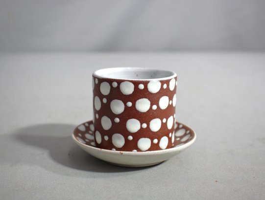 a charming addition to any collection of vintage ceramics. The set features a bold and playful polka dot design in white against a rich brown background, giving it a distinct mid-century modern appeal. The cup's cylindrical shape and the matching saucer's elegant form make this set not only aesthetically pleasing but also functional.
