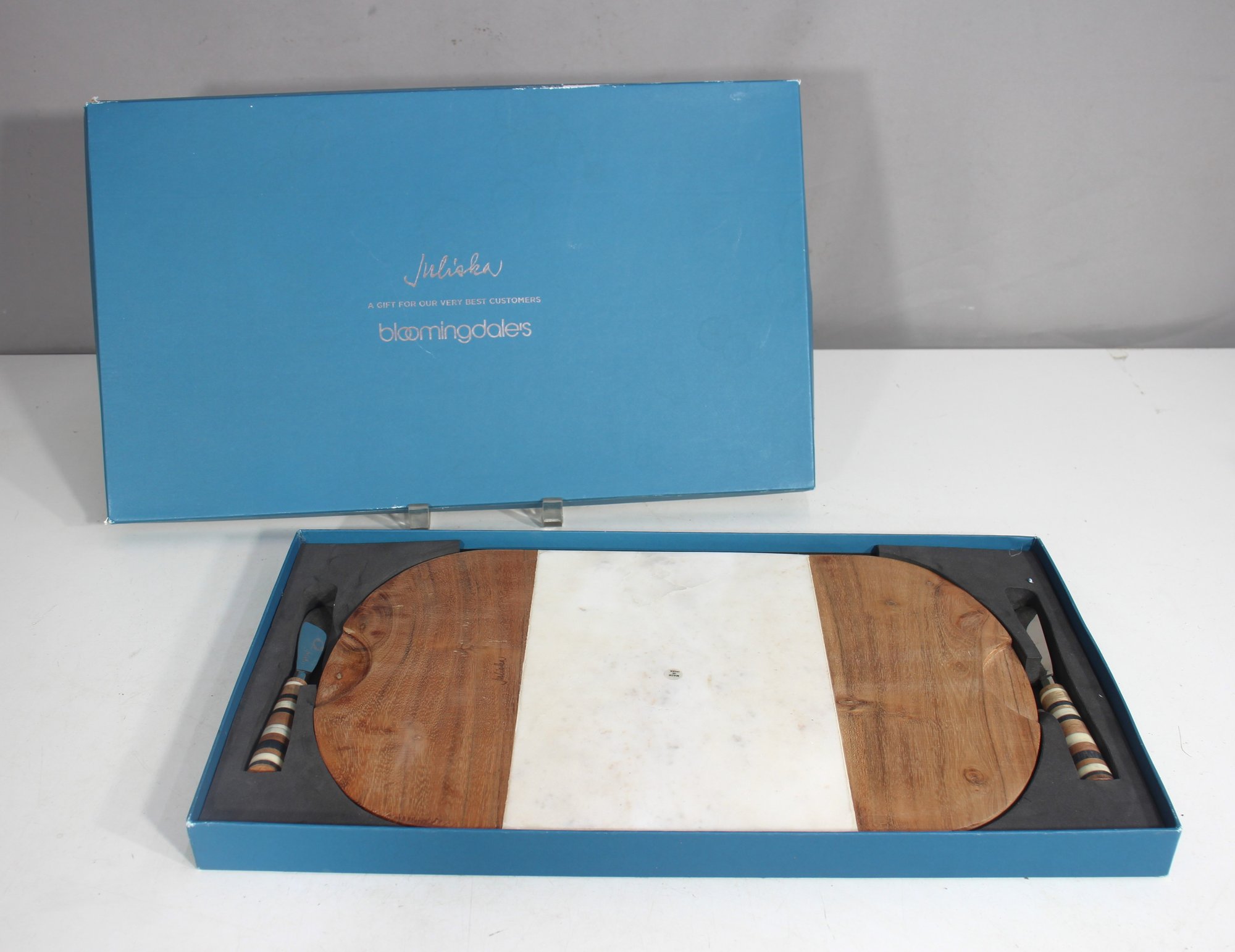 a stunning Juliska x Bloomingdale's limited-edition cheese board set, gifted exclusively to top-tier customers. This luxury charcuterie board set combines white marble and rich wood for a sophisticated, high-end look.