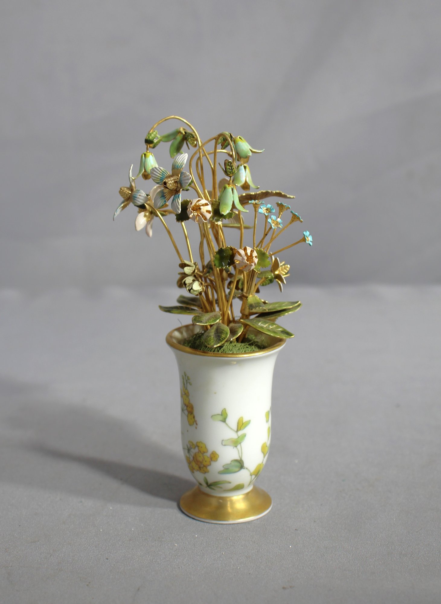 Ascending from within, a meticulously crafted bouquet made from brass presents an array of enamel flowers in soft, pastel hues, accented with a sprinkle of celestial blue.