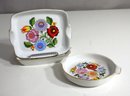 A beautiful 2-piece set of hand-painted porcelain dishes, featuring the vibrant and intricate Kalocsa floral motif. These pieces, crafted with fine details and colorful blooms, capture the essence of traditional Hungarian design. The rectangular dish showcases bold florals, while the circular handled dish complements with a lovely arrangement of colorful flowers. Both pieces are accented with delicate gold trim along the edges, making them perfect for collectors or decorative display.