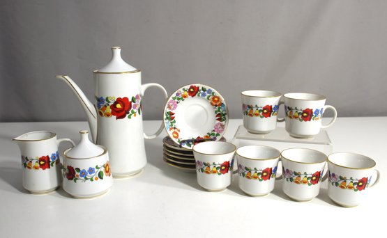 features a vibrant floral design, with red, blue, yellow, and orange flowers adorning each piece. The set includes six coffee cups, six saucers, a creamer, a sugar bowl with lid, and a tall coffee pot with a graceful spout and lid. The edges of each piece are accented with a subtle gold trim, adding a touch of elegance to the delicate floral motif.