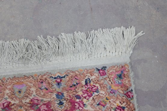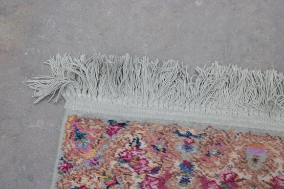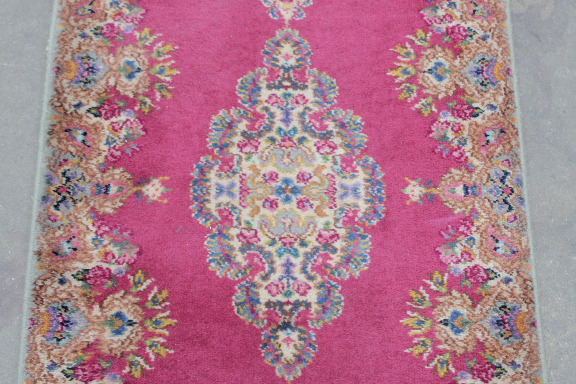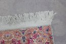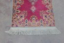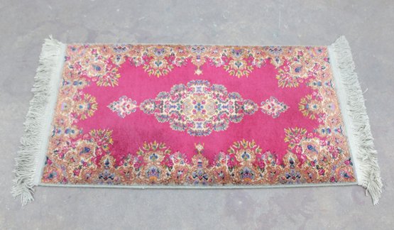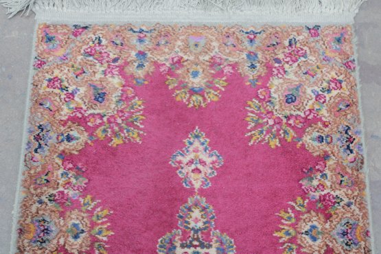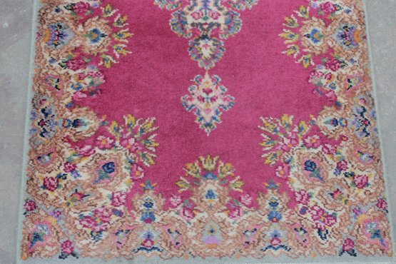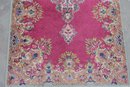 This beautiful rug features a vibrant red field with an intricate central medallion, surrounded by detailed floral and scroll motifs in soft gold, ivory, and blue tones. The ornate border and fine detailing reflect the traditional Kirman style, making it a standout accent piece for any room.