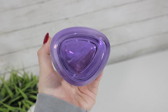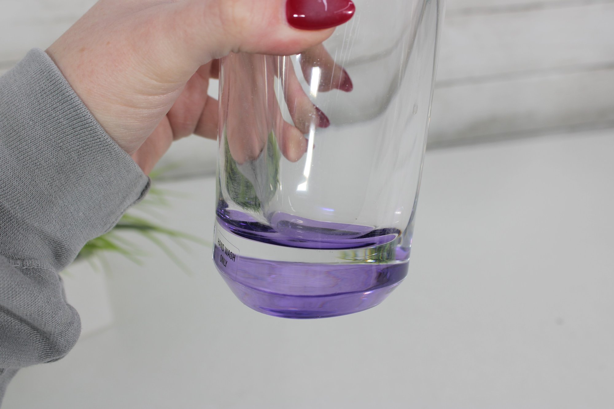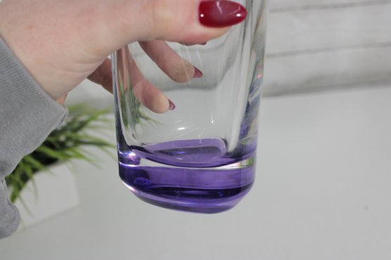 this stunning TRE vase designed by Karim Rashid for Orrefors Crystal. Showcasing a sleek, modern silhouette, this piece features a clear crystal body accented by a rich violet base and rim, creating a bold yet elegant contrast.