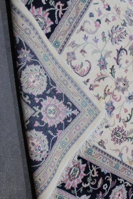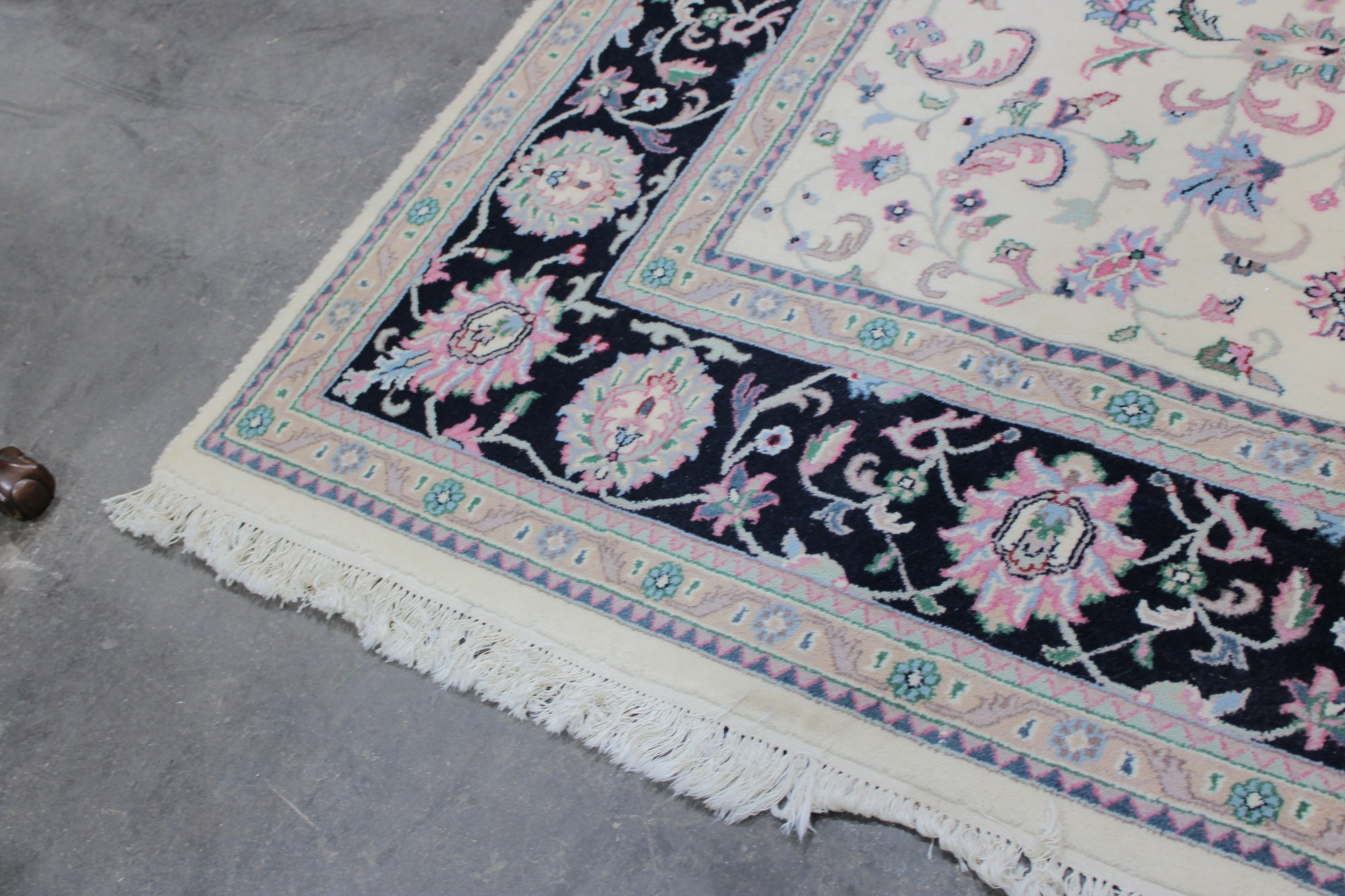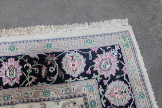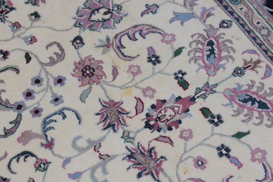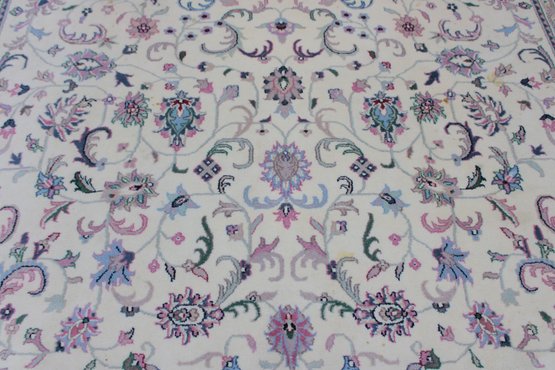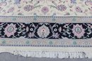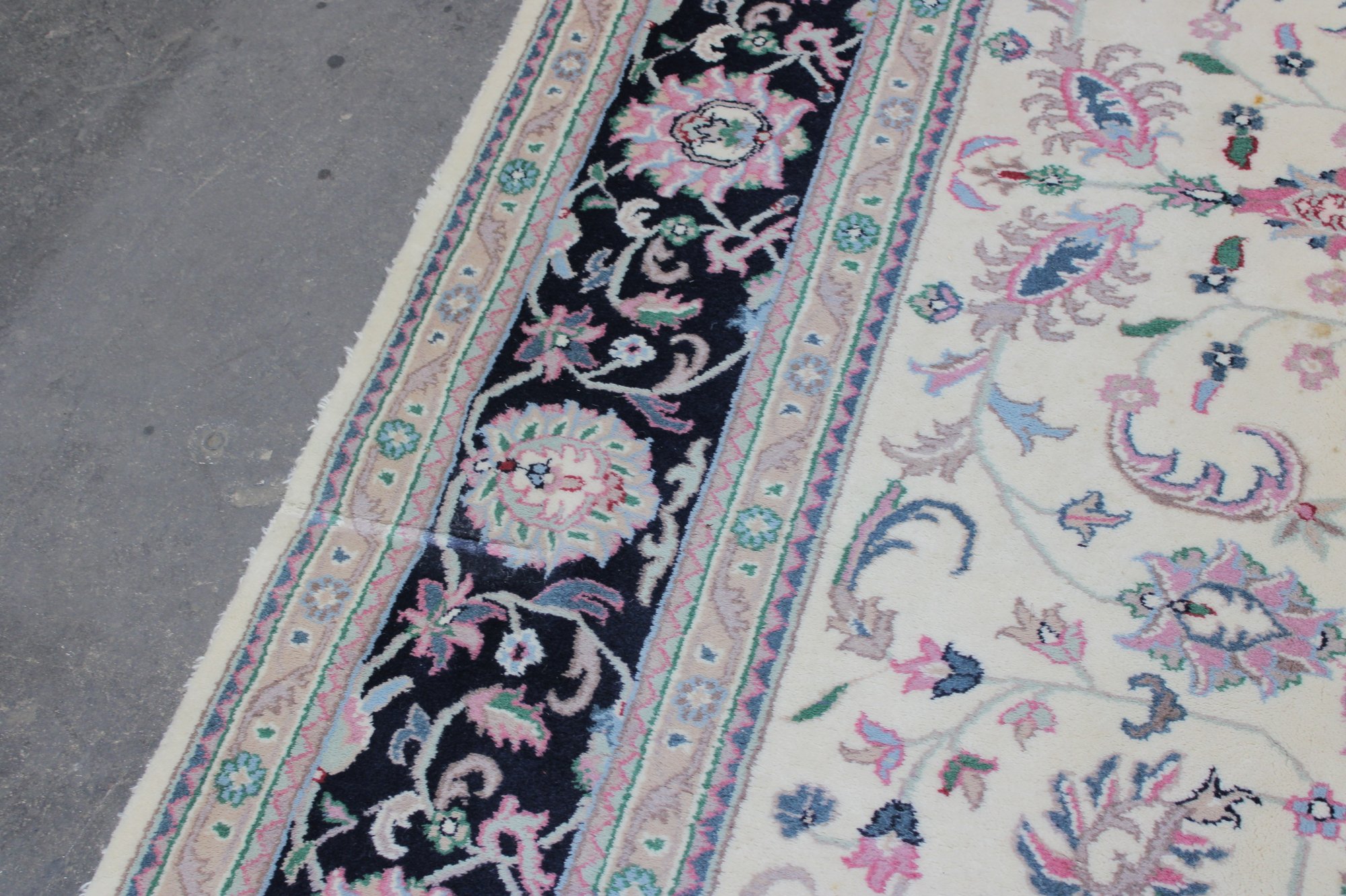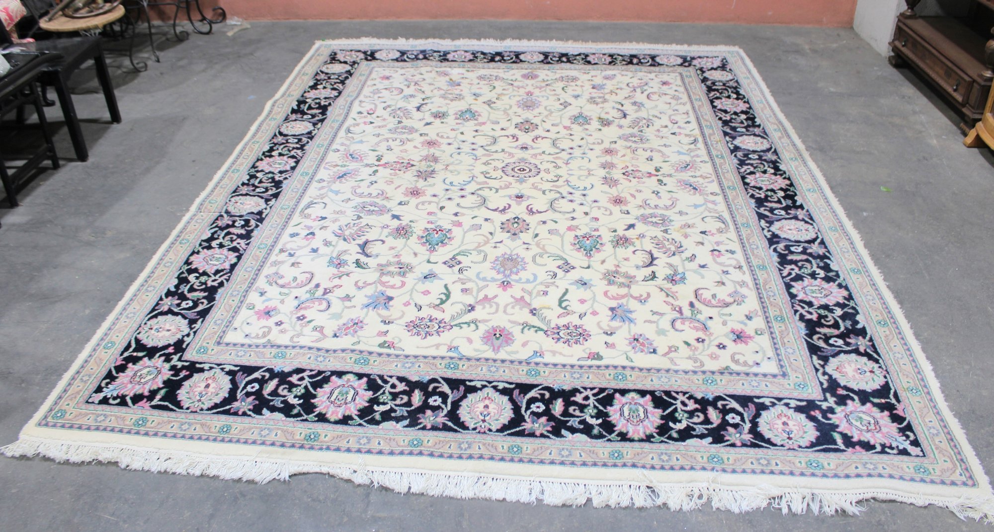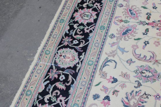 Beautiful Kashan carpet measuring approximately 9 feet 1 inch by 12 feet, showcasing a timeless Persian-inspired floral design. The elegant ivory field is filled with delicate scrolling vines and blossoms, framed by a striking dark border adorned with detailed floral motifs in soft pastel tones.