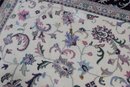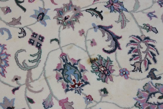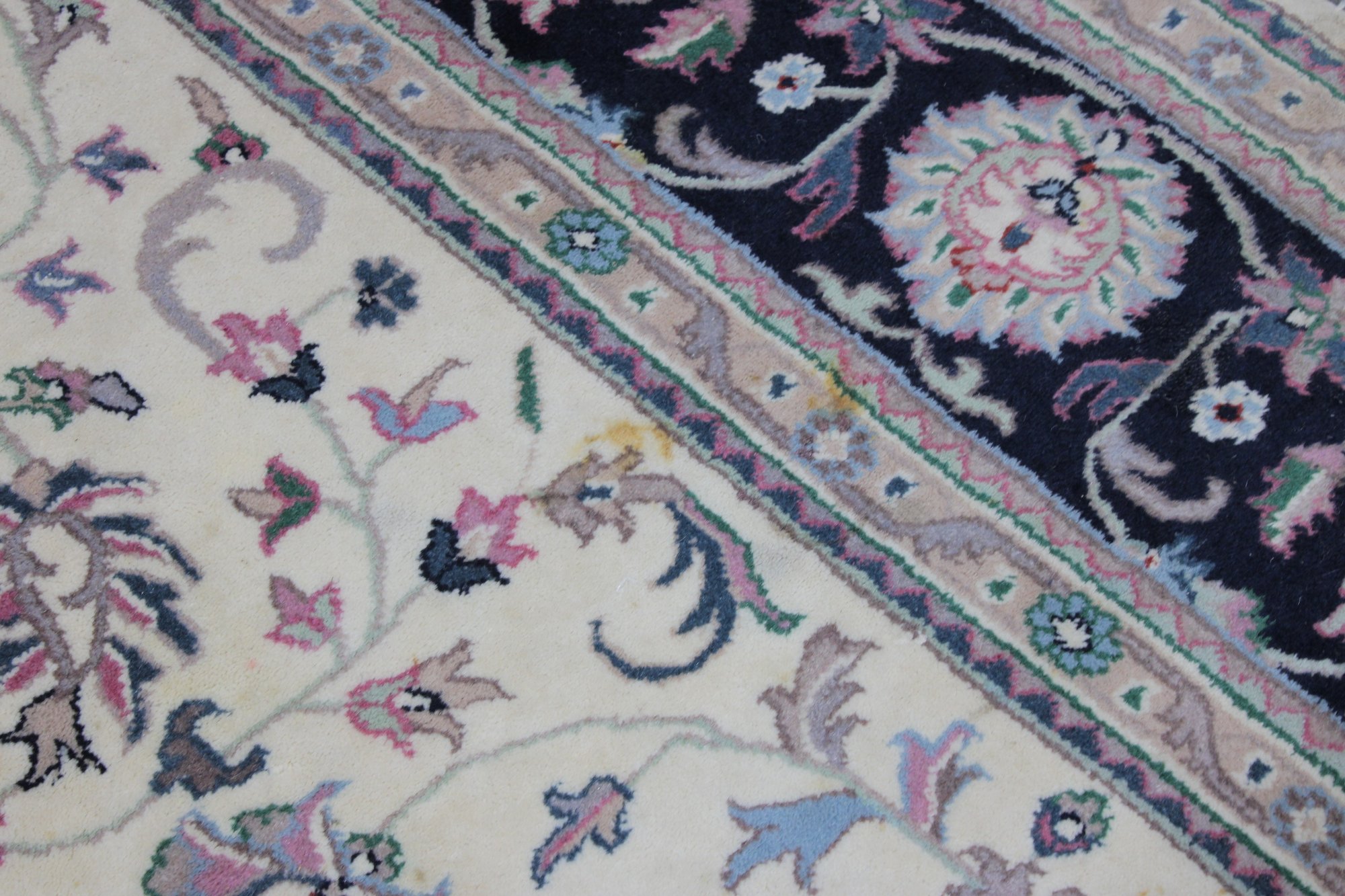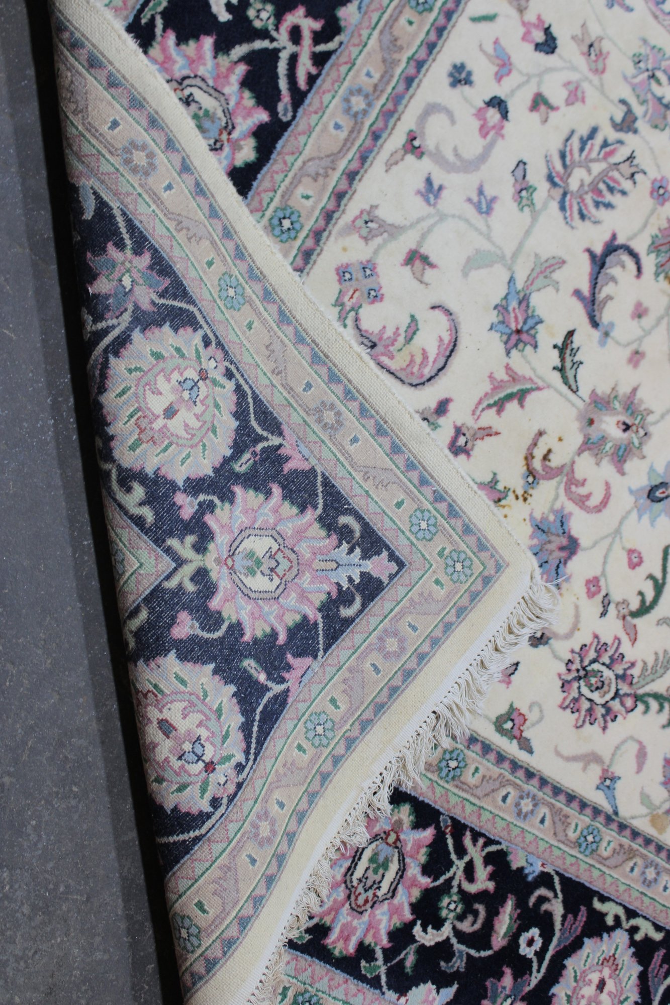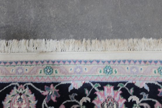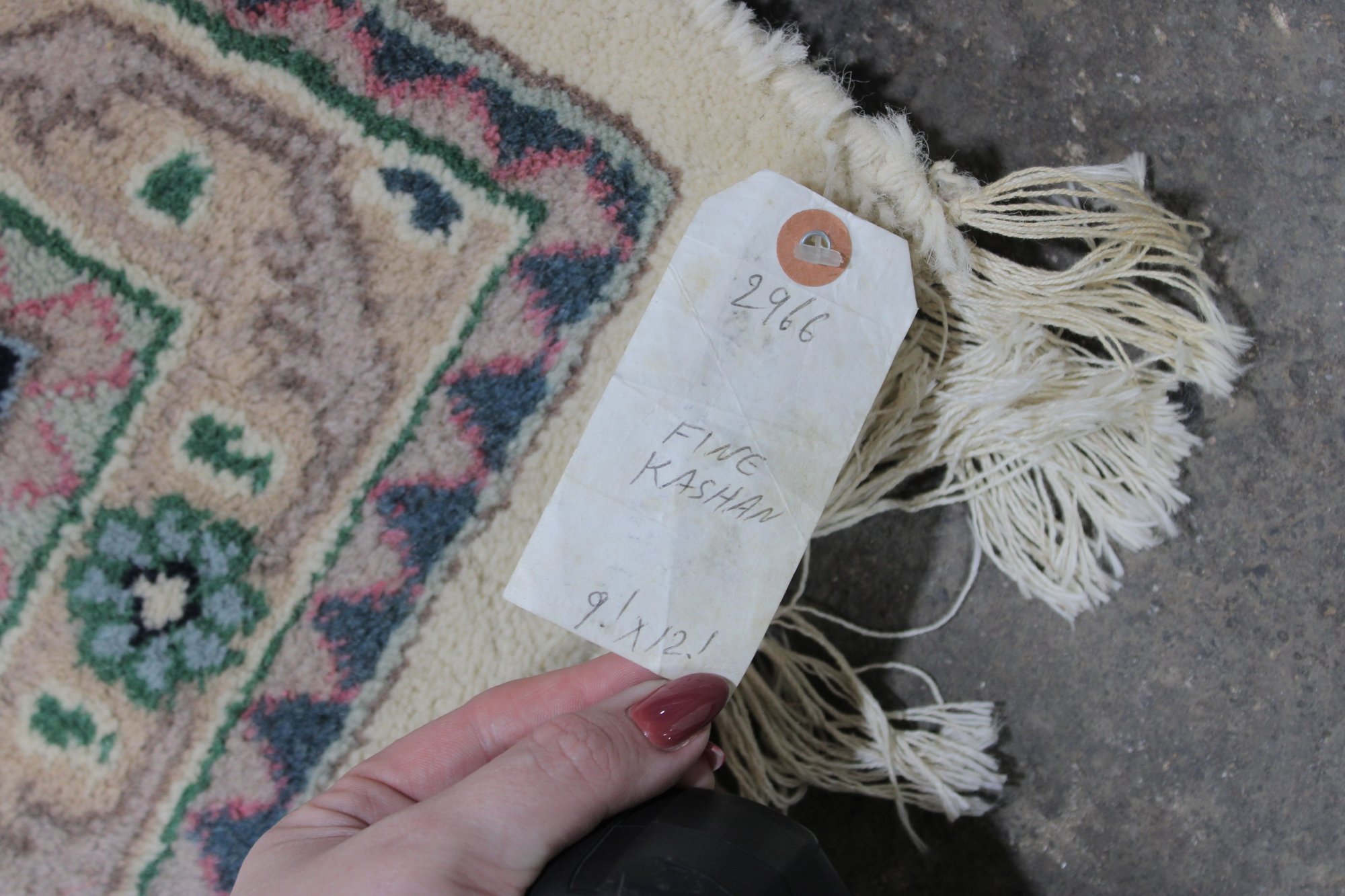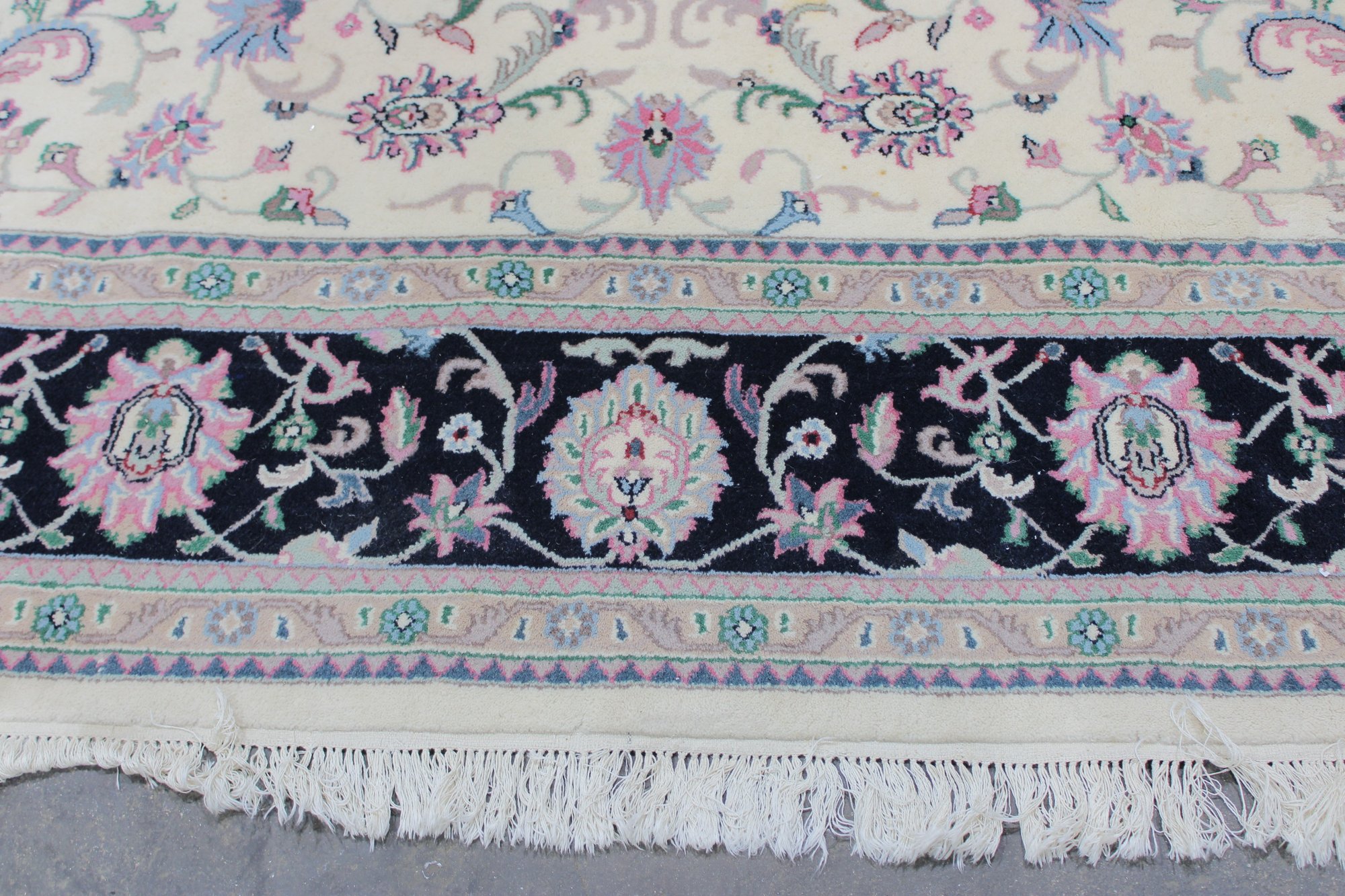 Beautiful Kashan carpet measuring approximately 9 feet 1 inch by 12 feet, showcasing a timeless Persian-inspired floral design. The elegant ivory field is filled with delicate scrolling vines and blossoms, framed by a striking dark border adorned with detailed floral motifs in soft pastel tones.