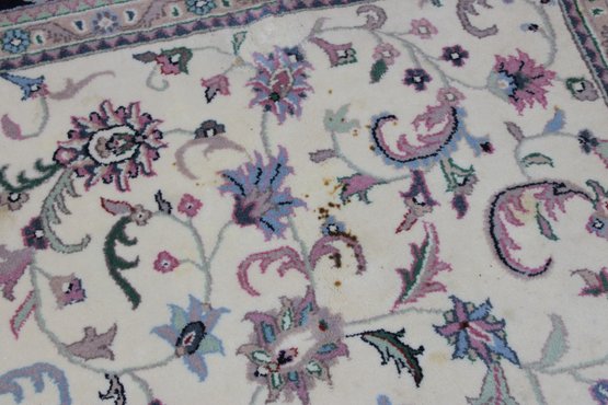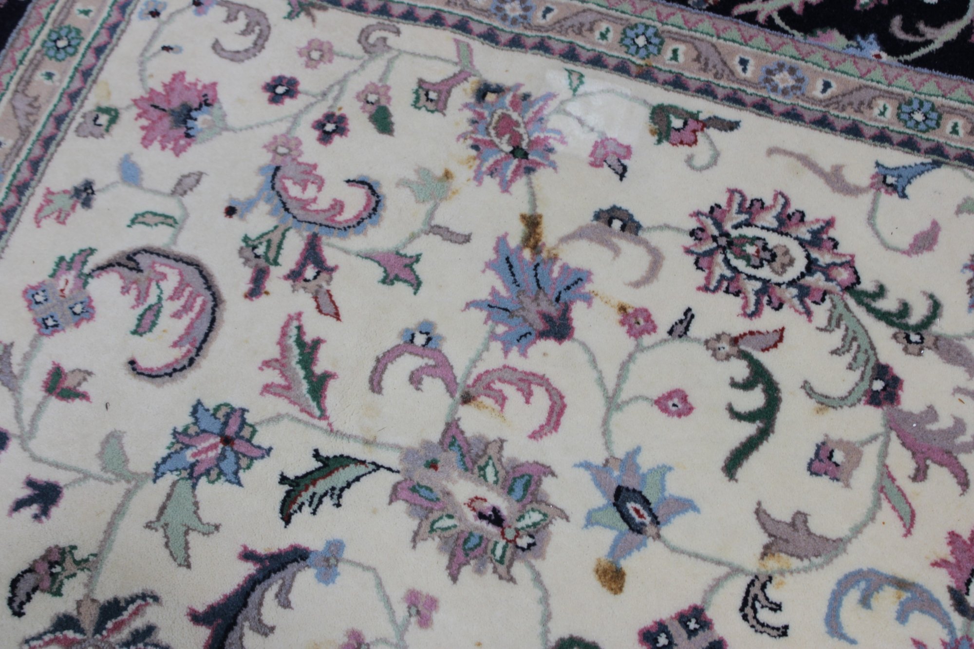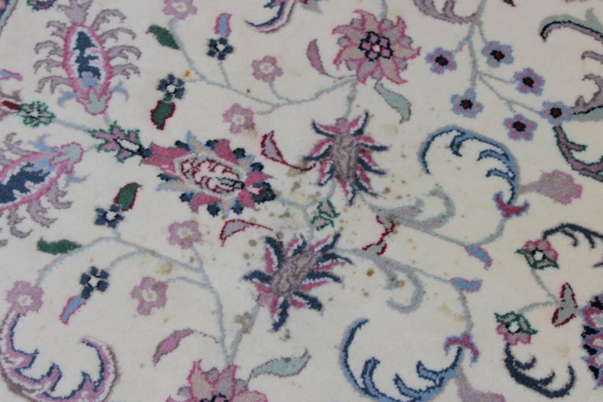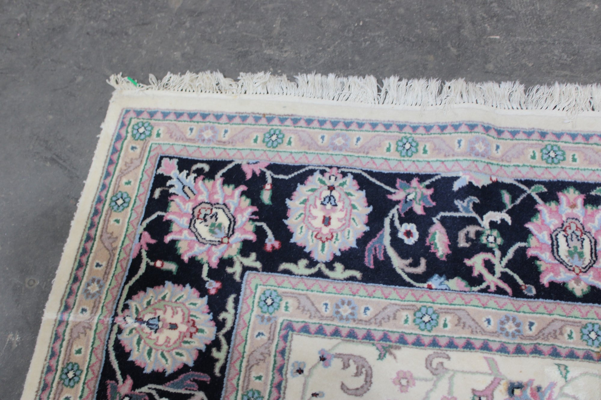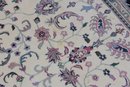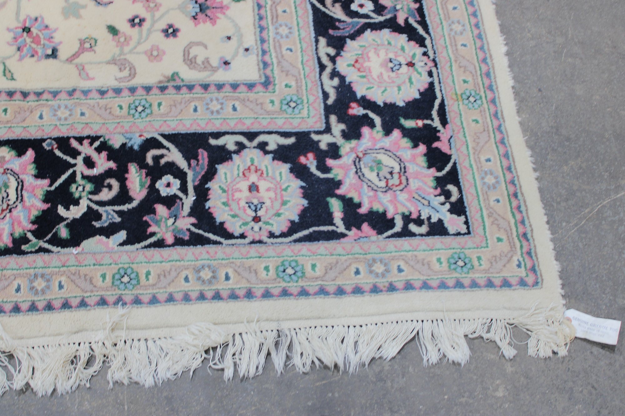 Beautiful Kashan carpet measuring approximately 9 feet 1 inch by 12 feet, showcasing a timeless Persian-inspired floral design. The elegant ivory field is filled with delicate scrolling vines and blossoms, framed by a striking dark border adorned with detailed floral motifs in soft pastel tones.