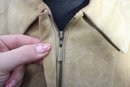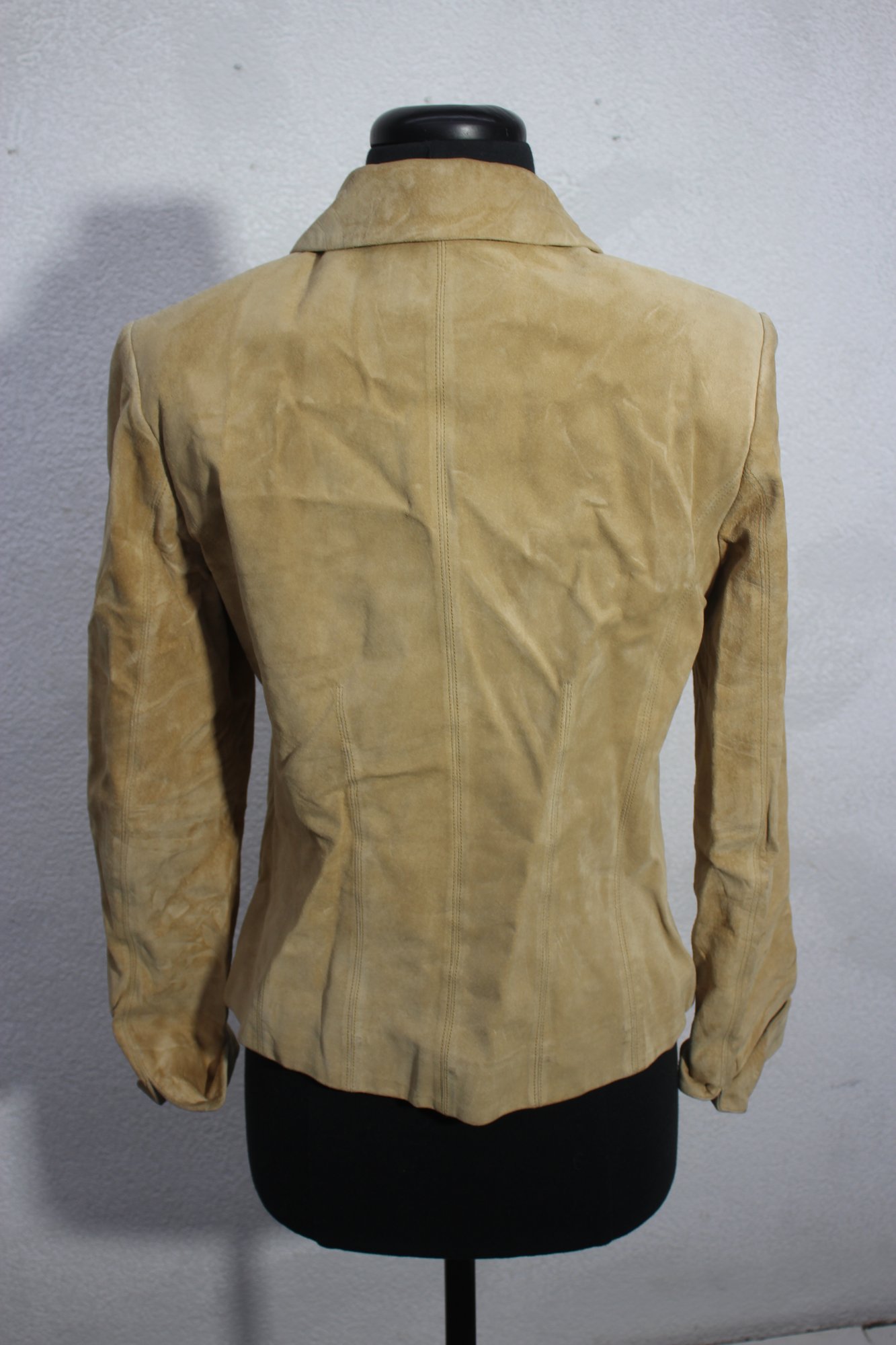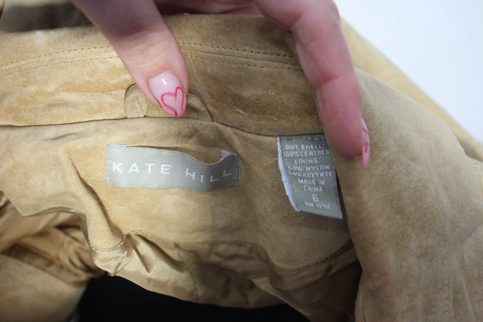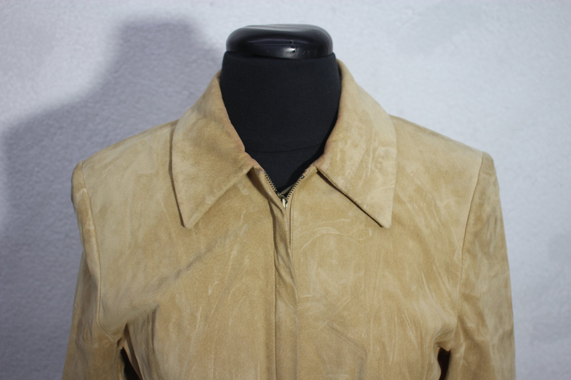 Enhance your wardrobe with this Kate Hill beige suede leather jacket, featuring a sleek zip-up design and timeless elegance. This versatile and stylish piece is perfect for casual or dressy occasions.