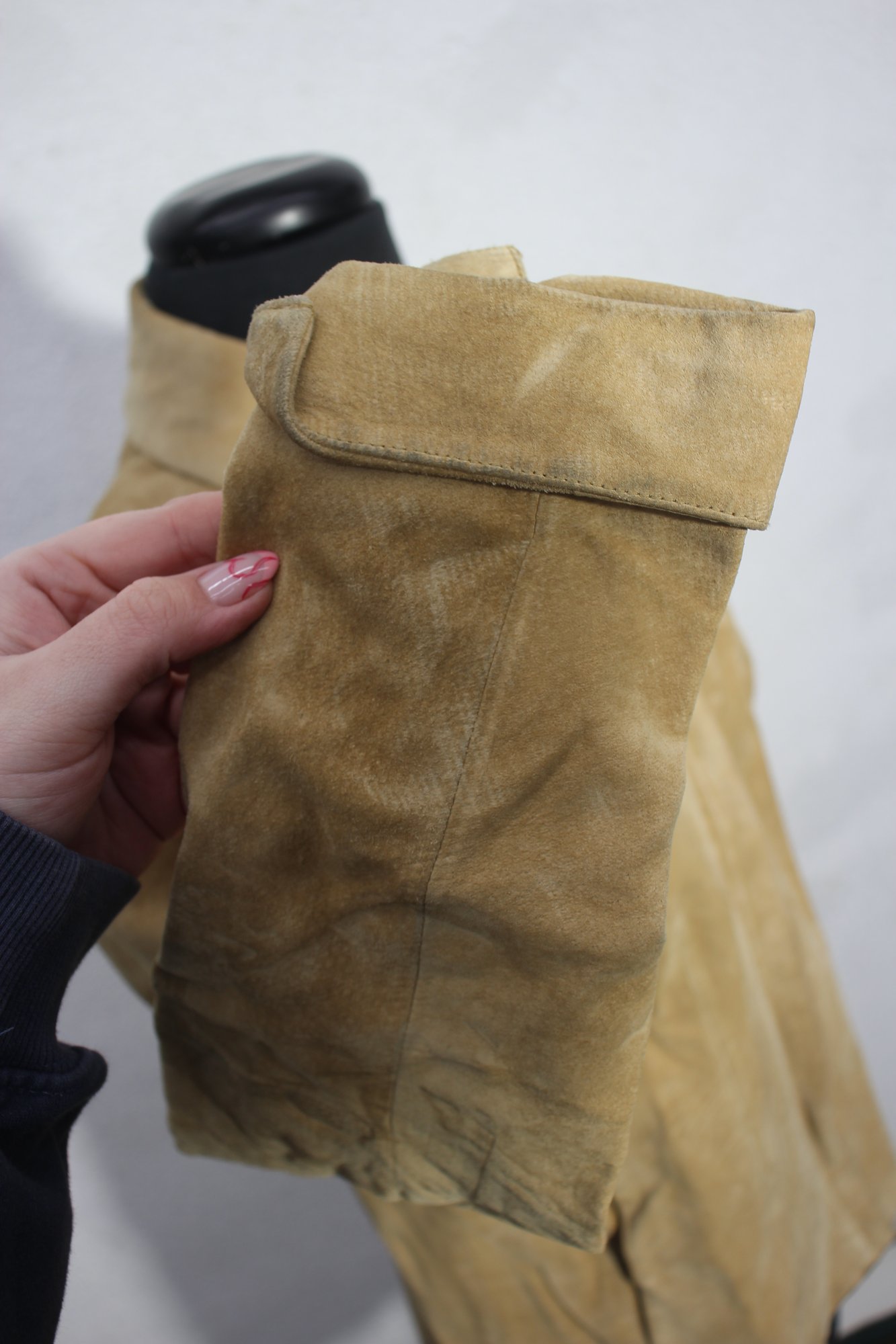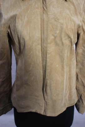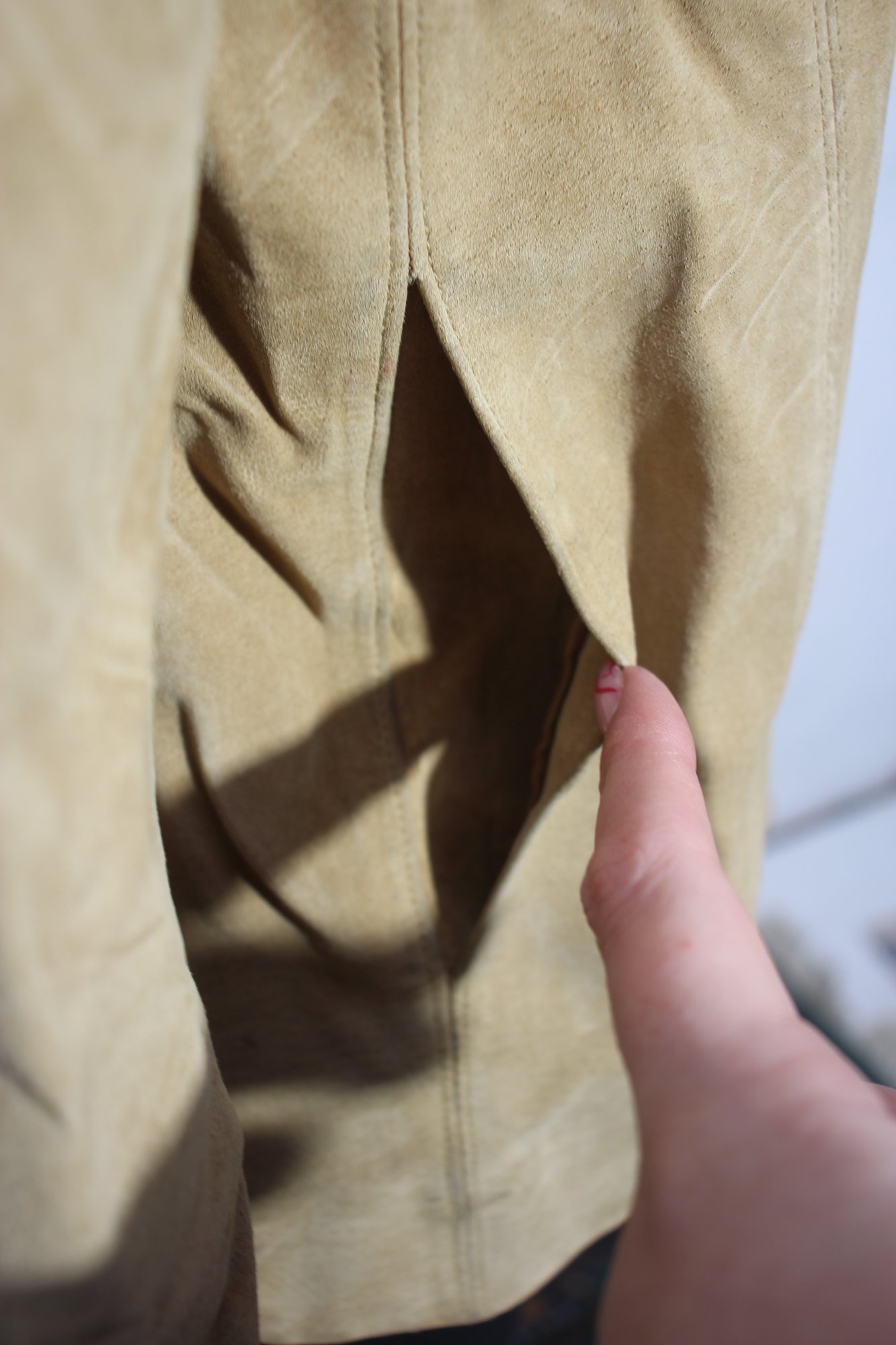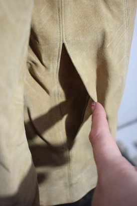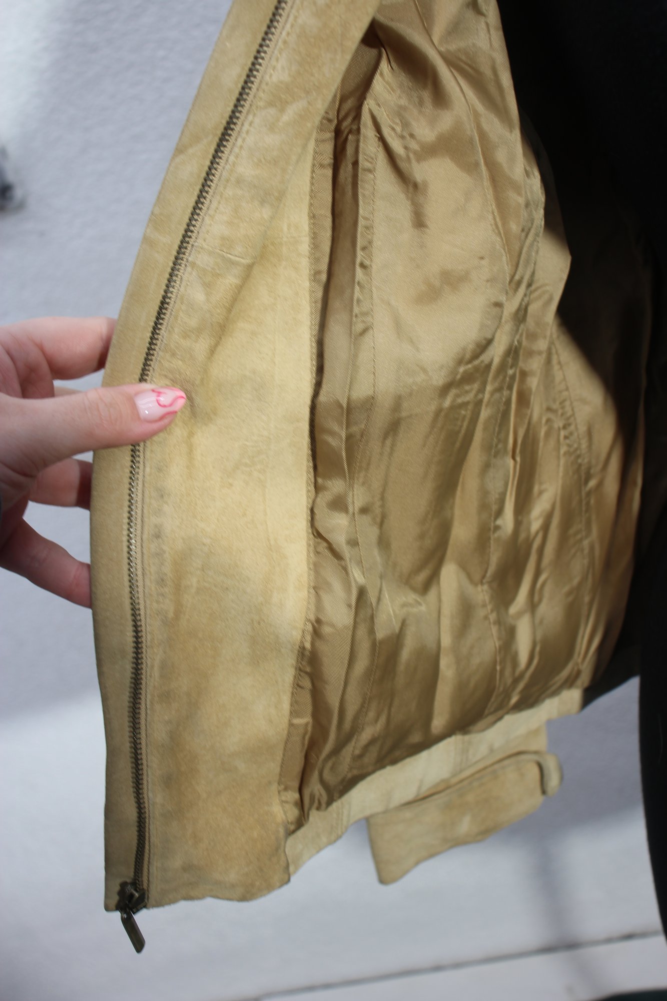 Enhance your wardrobe with this Kate Hill beige suede leather jacket, featuring a sleek zip-up design and timeless elegance. This versatile and stylish piece is perfect for casual or dressy occasions.