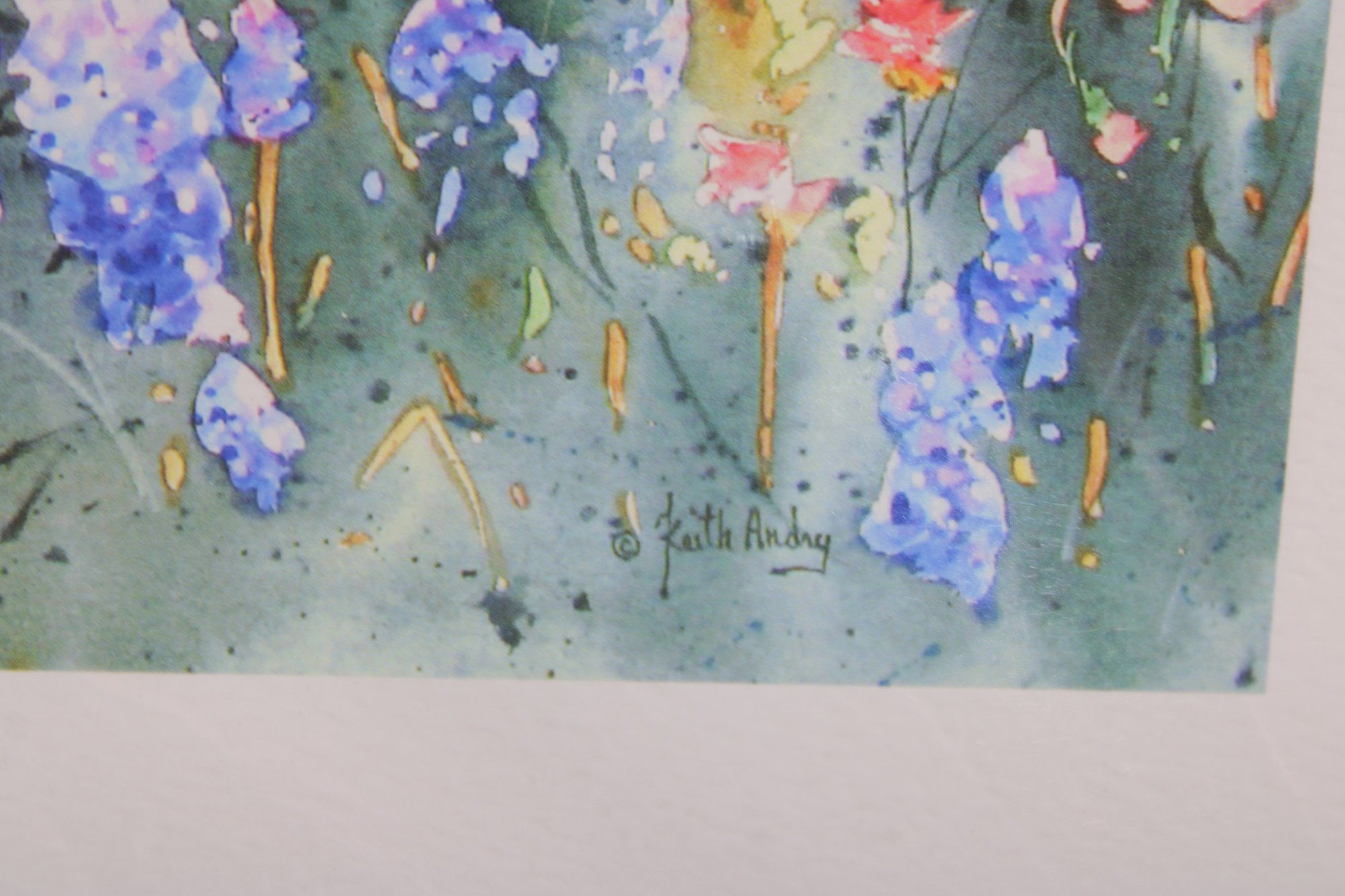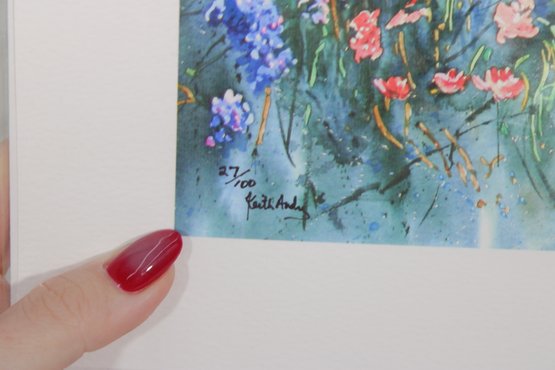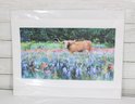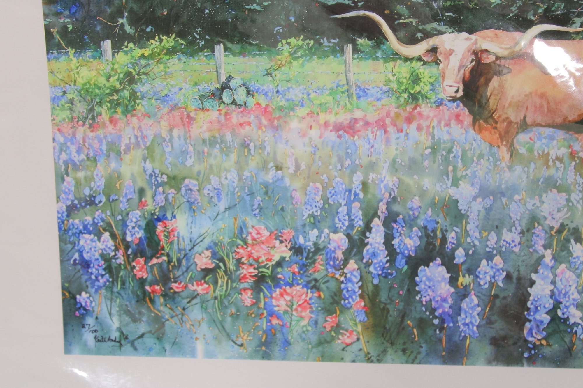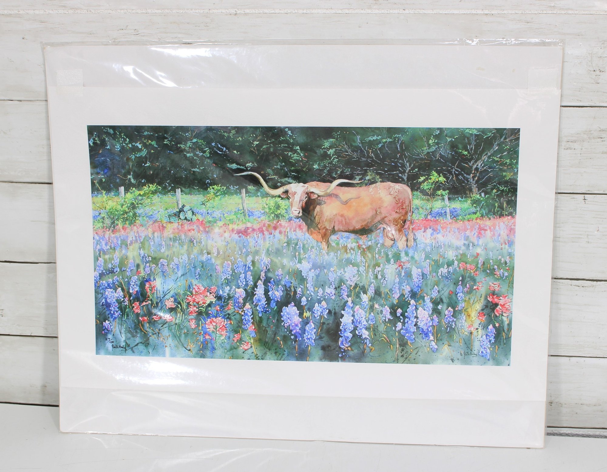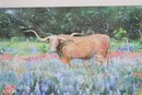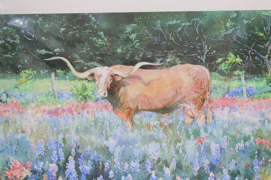Beautiful limited edition print by artist Kim Andry, featuring a striking Texas Longhorn standing in a vibrant field of bluebonnets and wildflowers. This colorful composition captures the essence of the Texas landscape with rich, painterly detail and a lively palette.