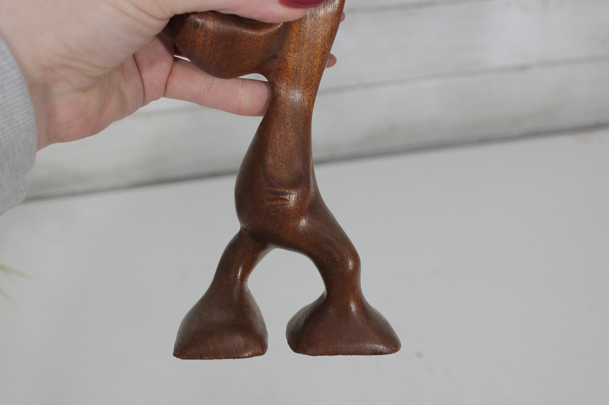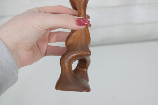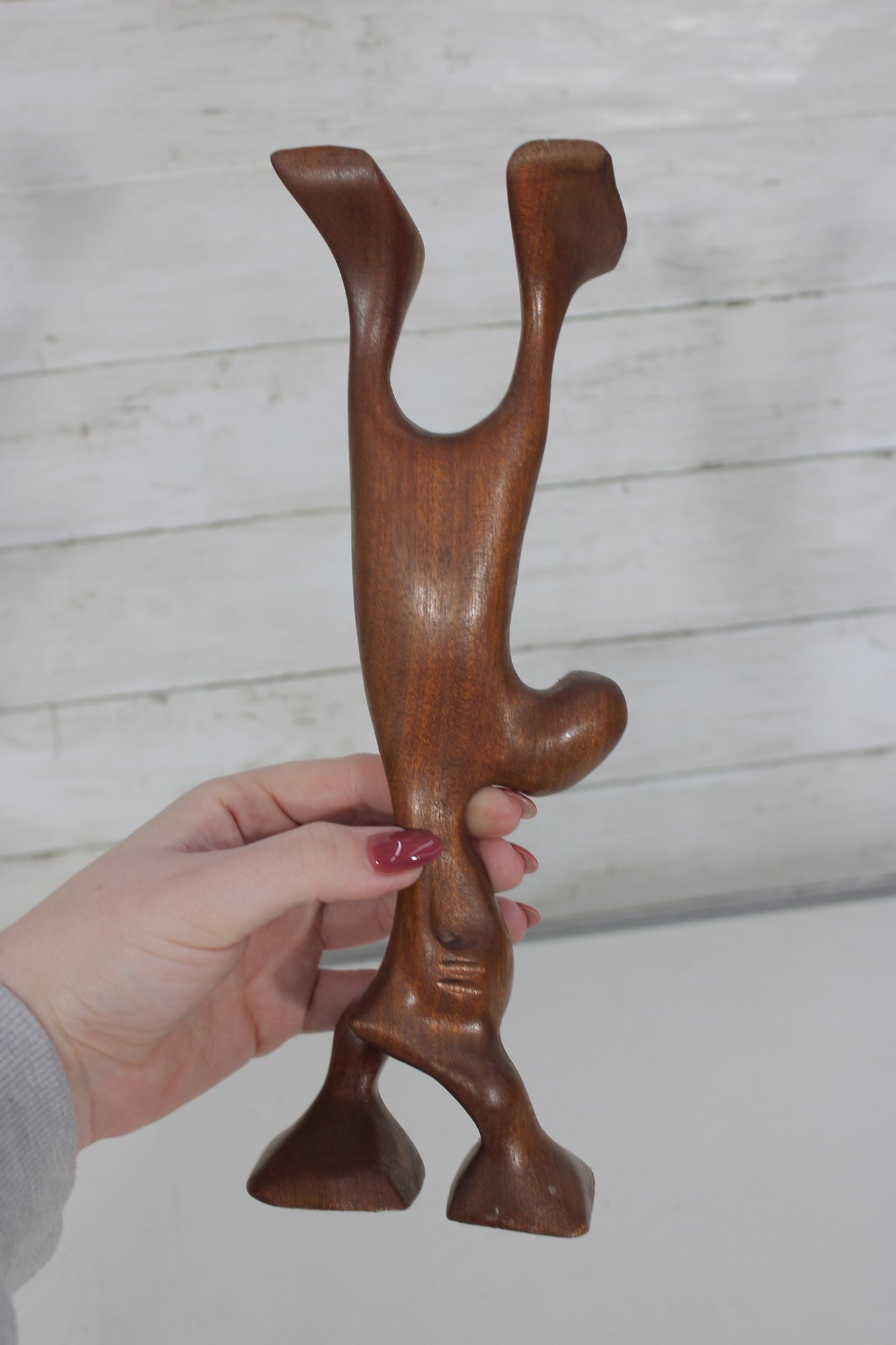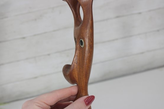 Signed on the underside (see photos), the sculpture makes a striking decorative accent for collectors of Danish modern art, mid-century décor, or abstract figural carvings. Its warm wood tones and playful character make it an eye-catching display piece for shelves, desks, or curated art groupings.