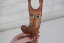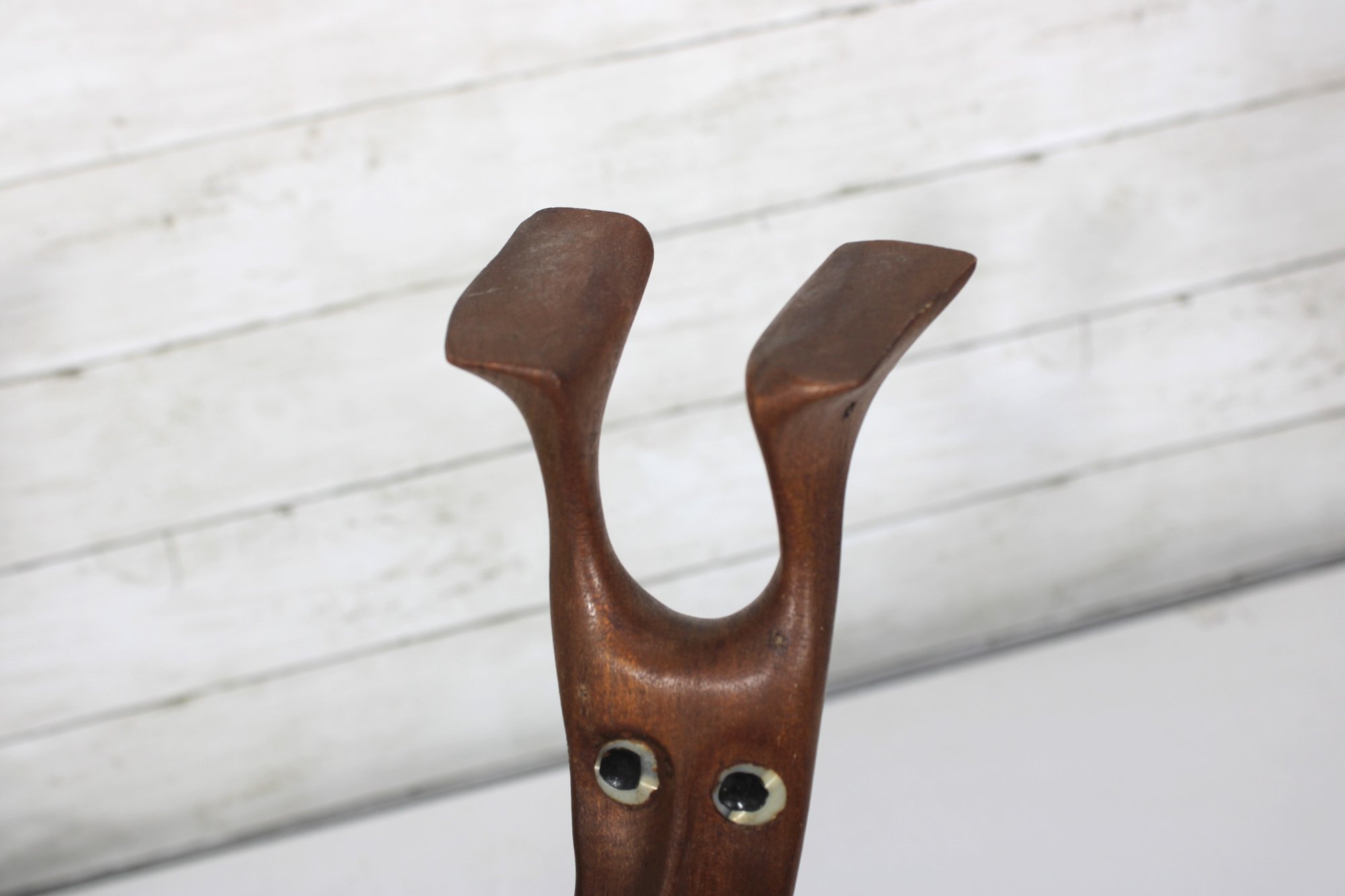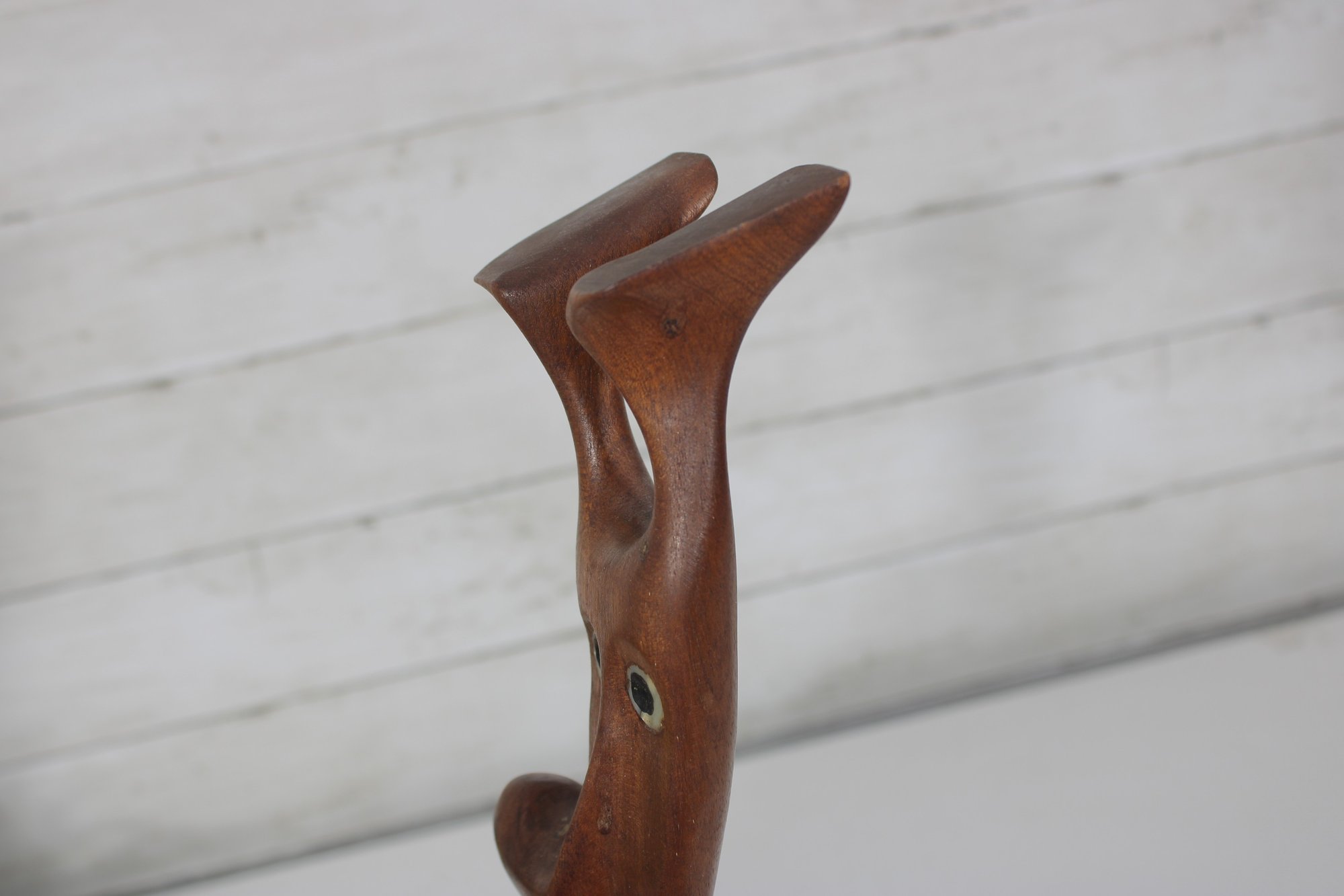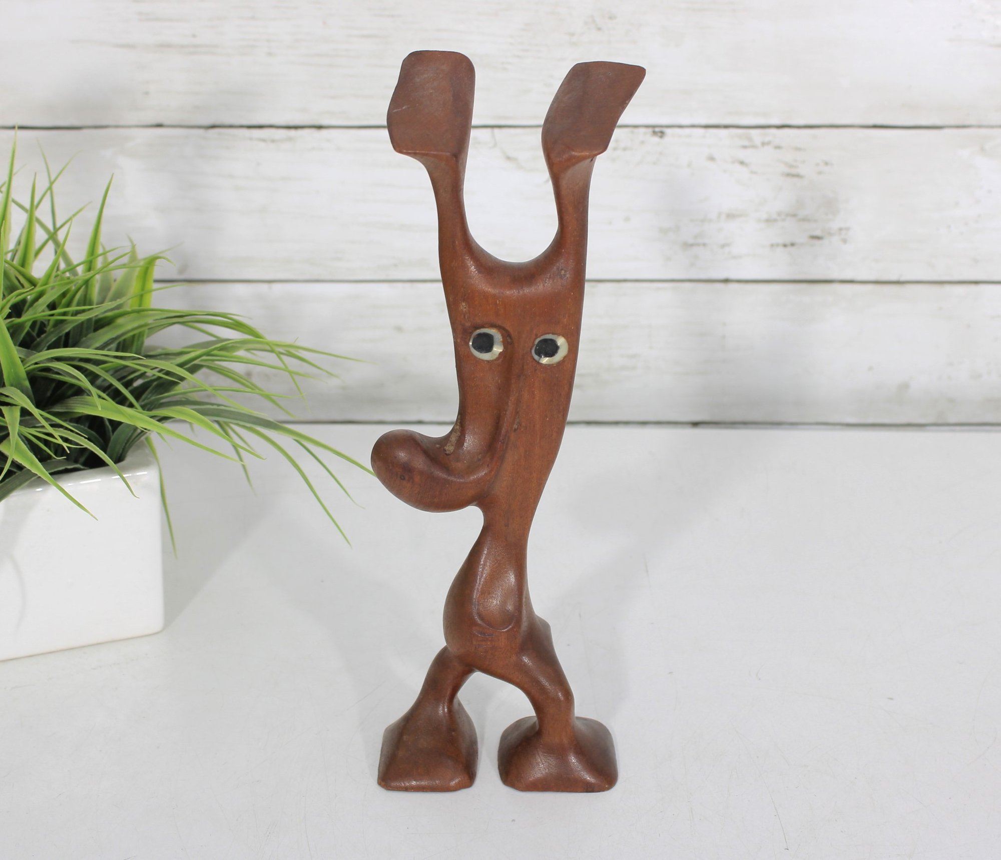 Signed on the underside (see photos), the sculpture makes a striking decorative accent for collectors of Danish modern art, mid-century décor, or abstract figural carvings. Its warm wood tones and playful character make it an eye-catching display piece for shelves, desks, or curated art groupings.