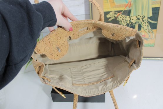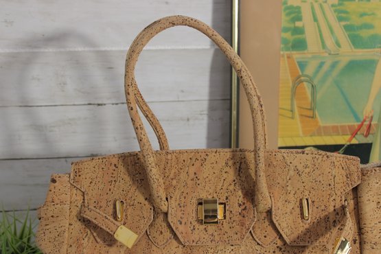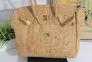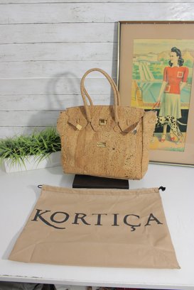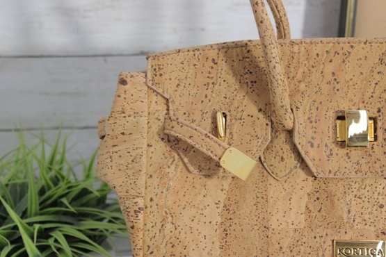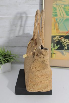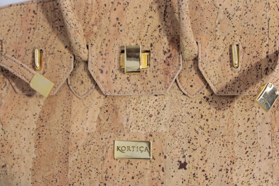 Stylish and unique KORTICA handbag crafted from natural cork, offering an eco-friendly and vegan alternative to leather. This structured tote features a chic satchel-inspired design with decorative strap details and polished gold-tone hardware for a luxe finish.