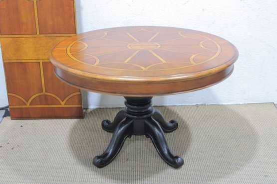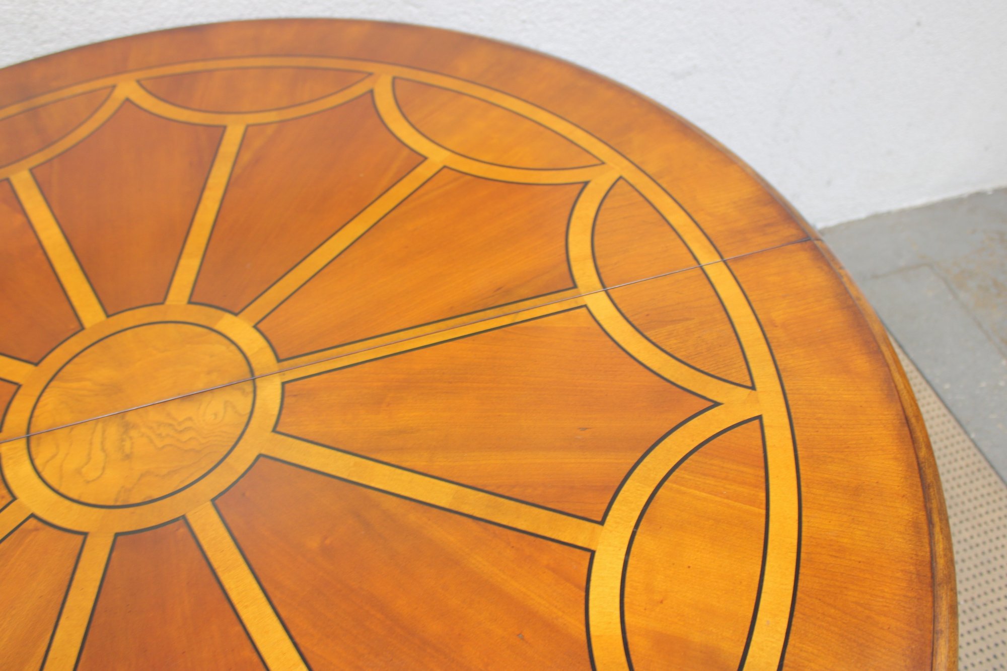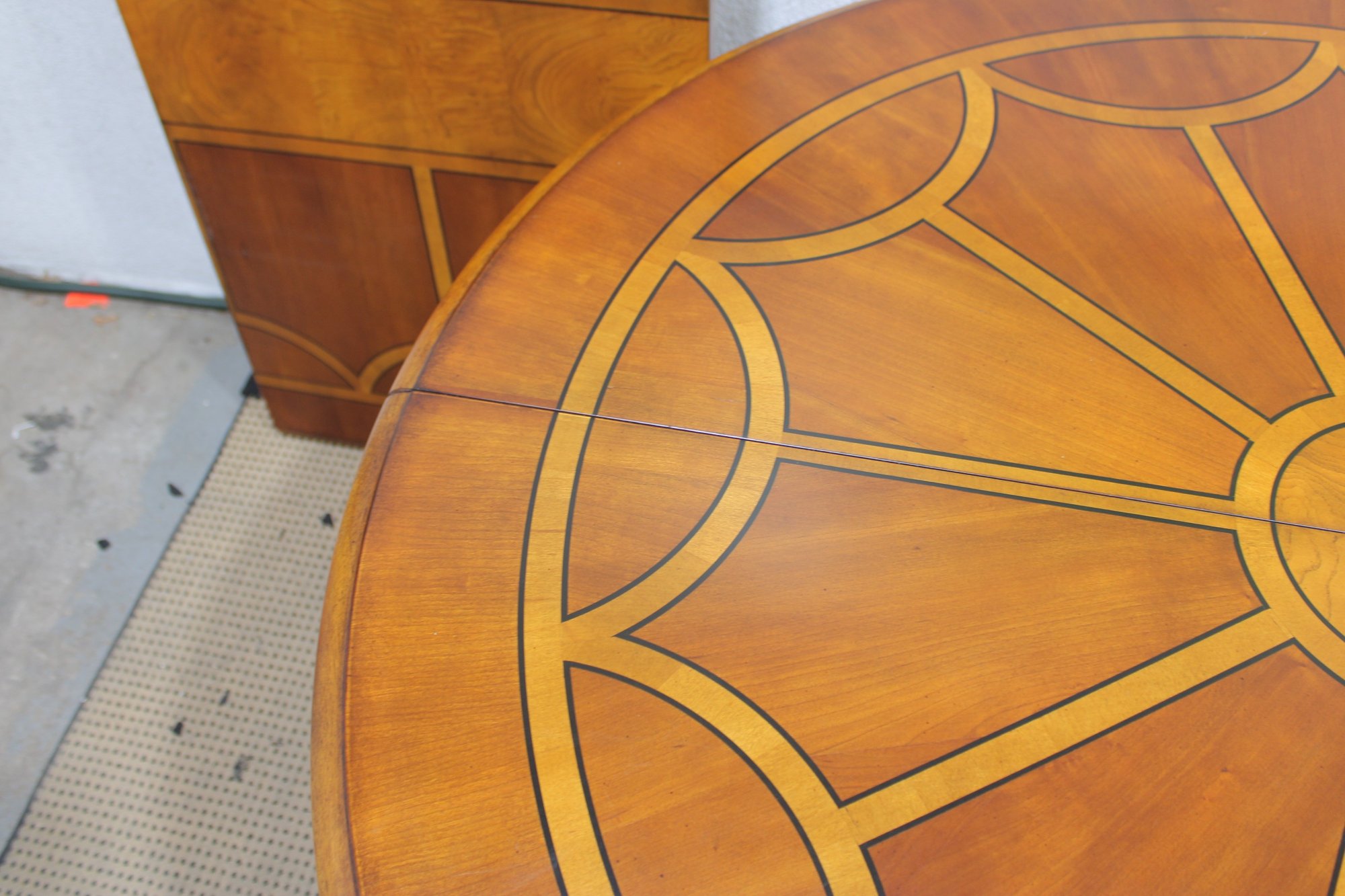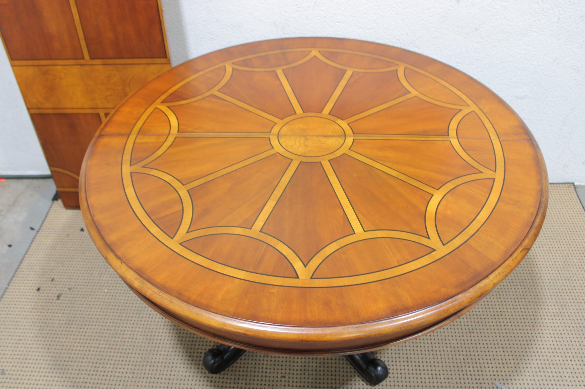 Stunning round inlaid dining table featuring an eye-catching decorative veneer top with geometric and curved banding that creates a sunburst-style design. The rich wood tones paired with the contrasting inlay lines give this piece a refined, high-end presence perfect for a formal dining room or statement breakfast space.