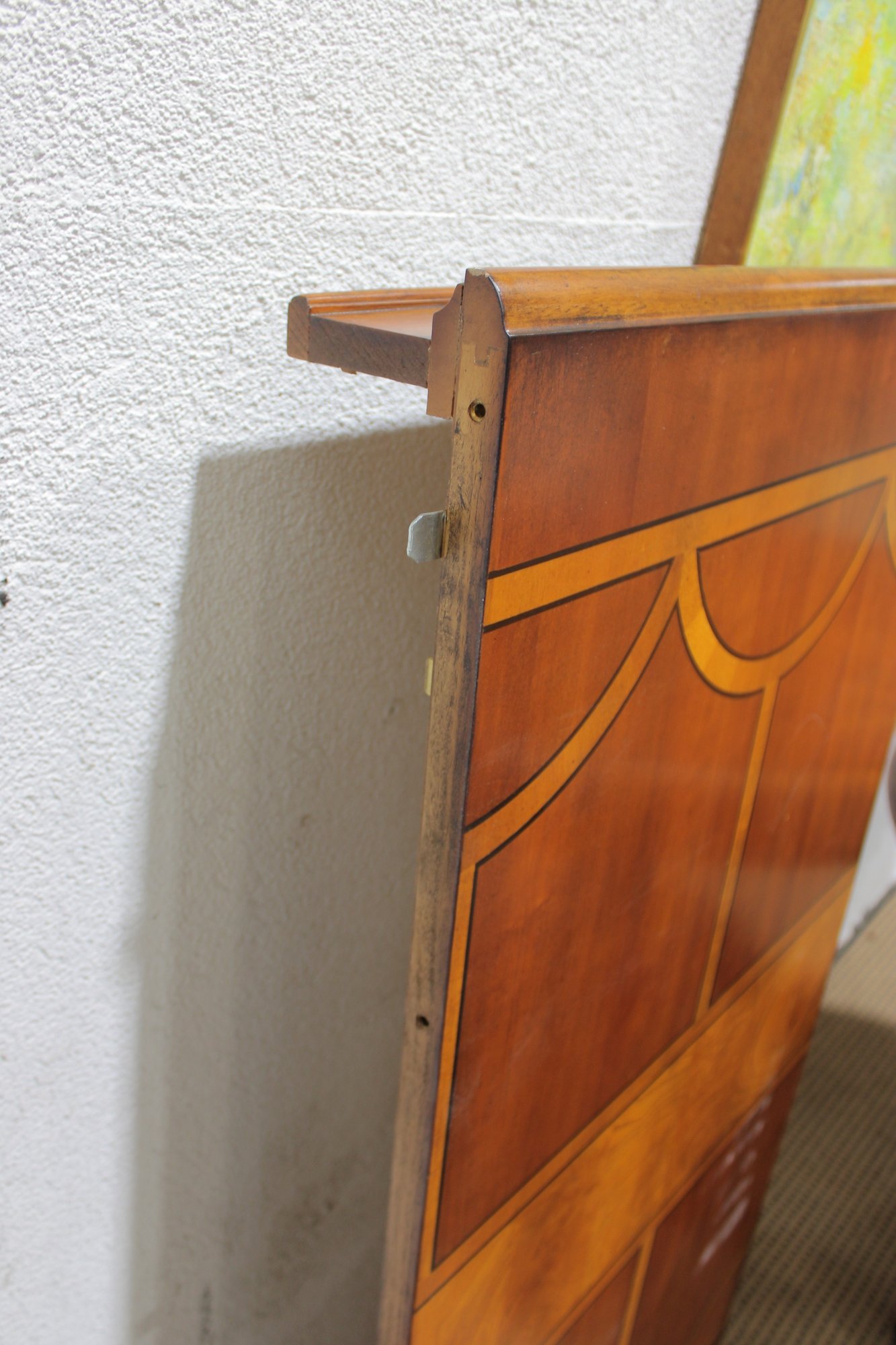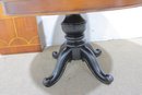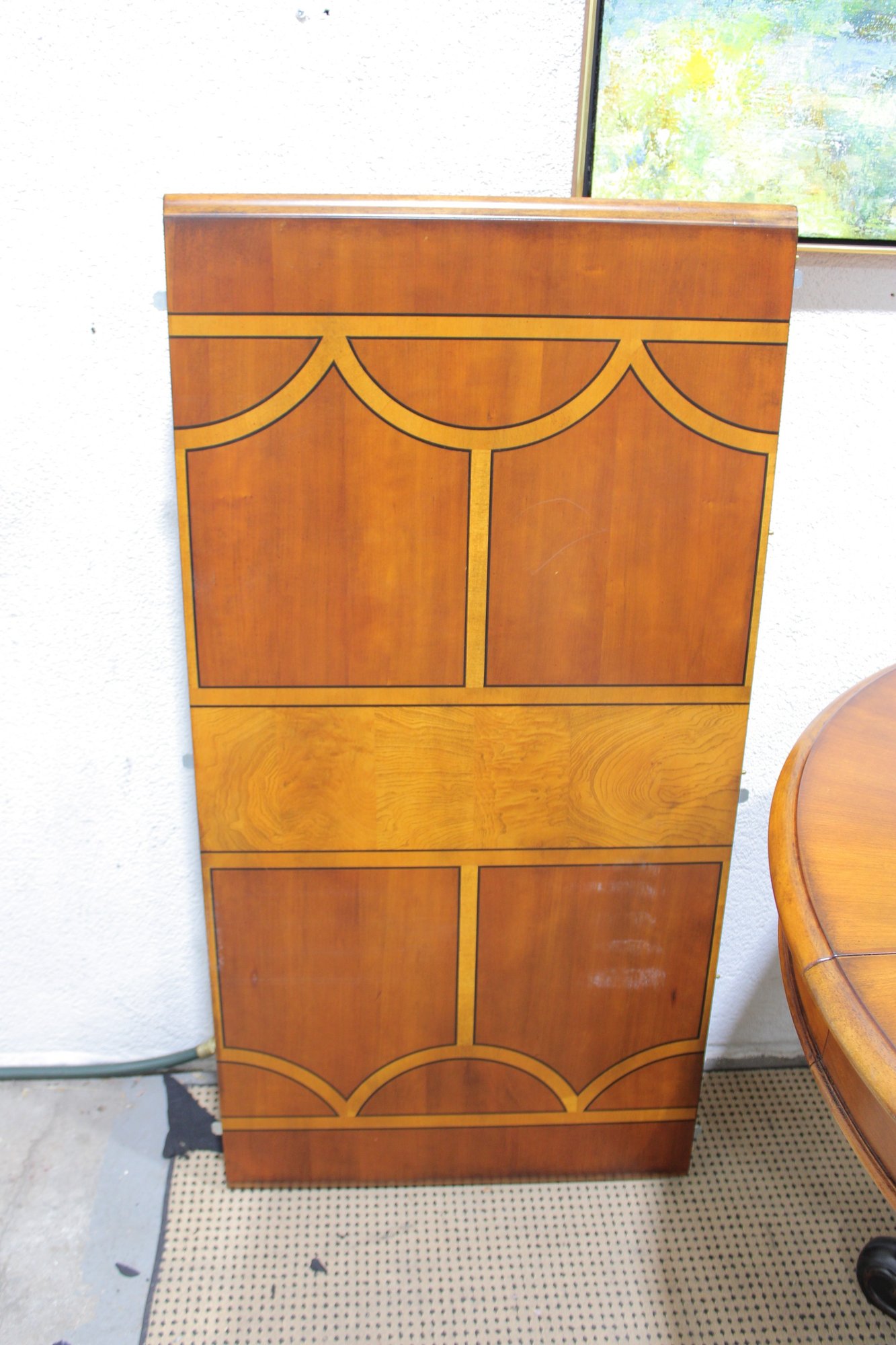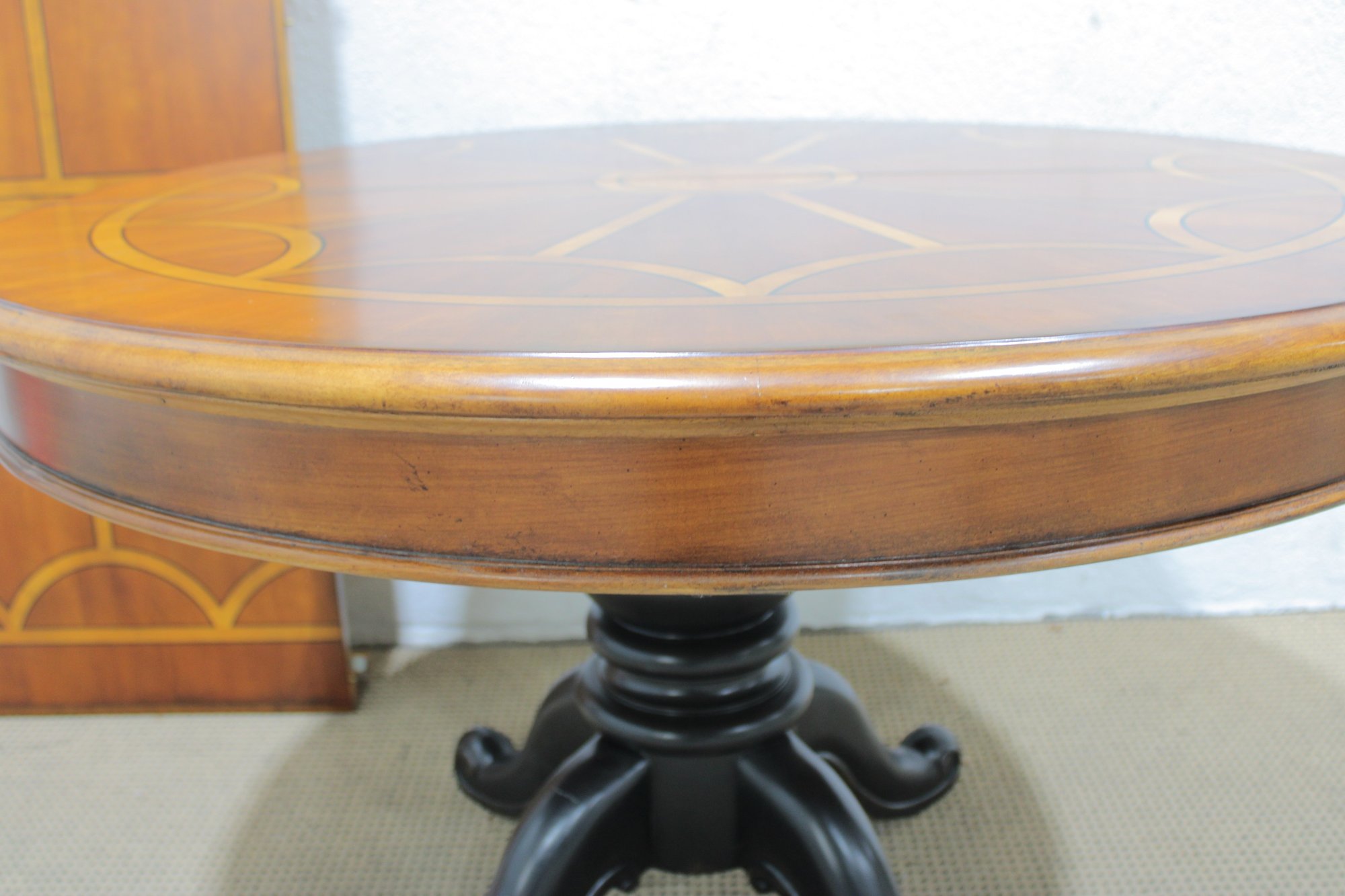 Stunning round inlaid dining table featuring an eye-catching decorative veneer top with geometric and curved banding that creates a sunburst-style design. The rich wood tones paired with the contrasting inlay lines give this piece a refined, high-end presence perfect for a formal dining room or statement breakfast space.