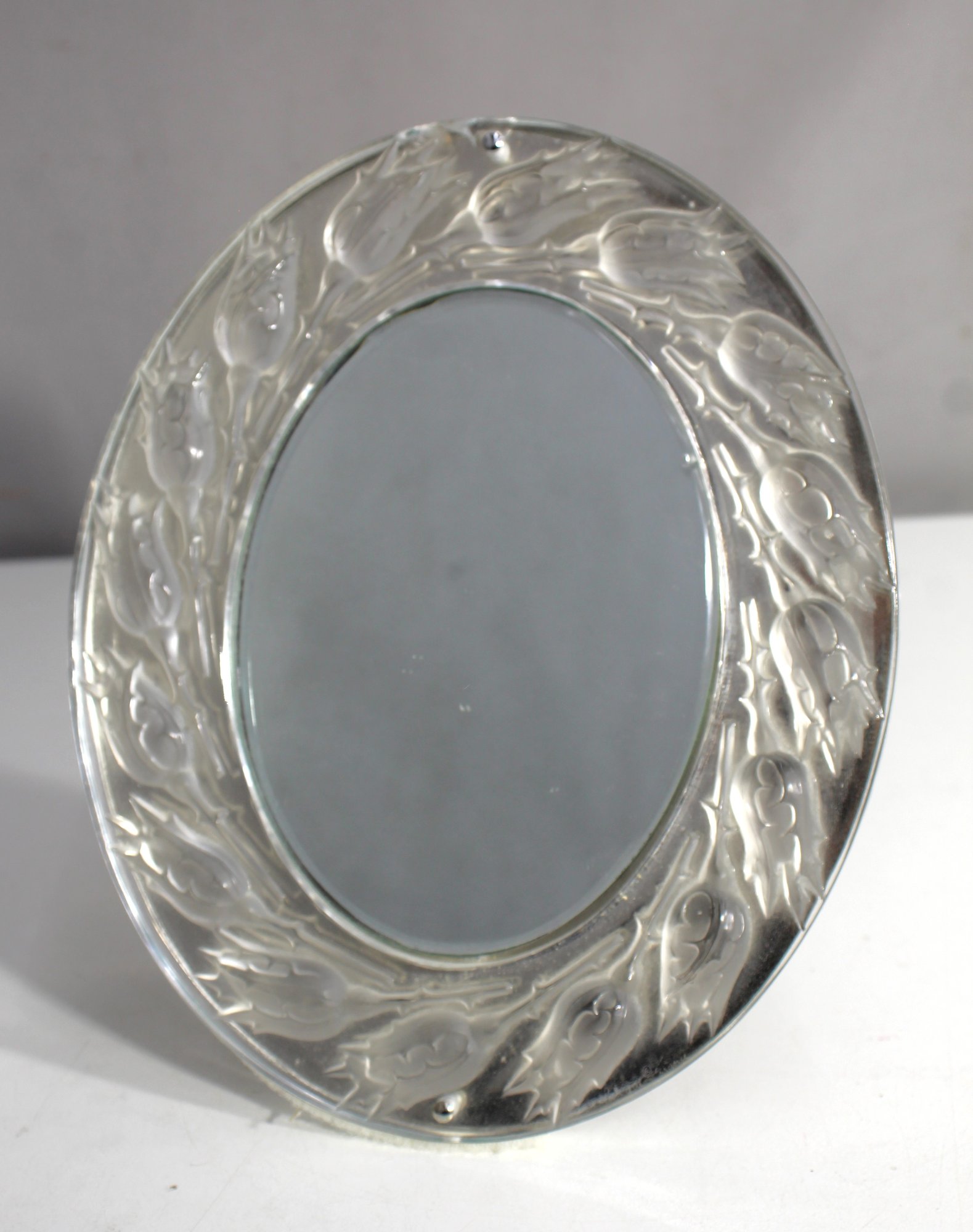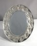 This stunning Lalique "Boutons De Roses" table mirror features a beautifully crafted crystal frame adorned with rosebud motifs, embodying the elegance and artistry for which Lalique is renowned. Measuring 9.5 inches by 8 inches, this piece combines crystal and metal for a timeless, sophisticated look. Please note, there is a small chip on the frame (see photos), which does not detract from its overall charm and visual appeal. This mirror is an exquisite collector's item or decorative addition for any vanity or table, ideal for lovers of fine French crystal.