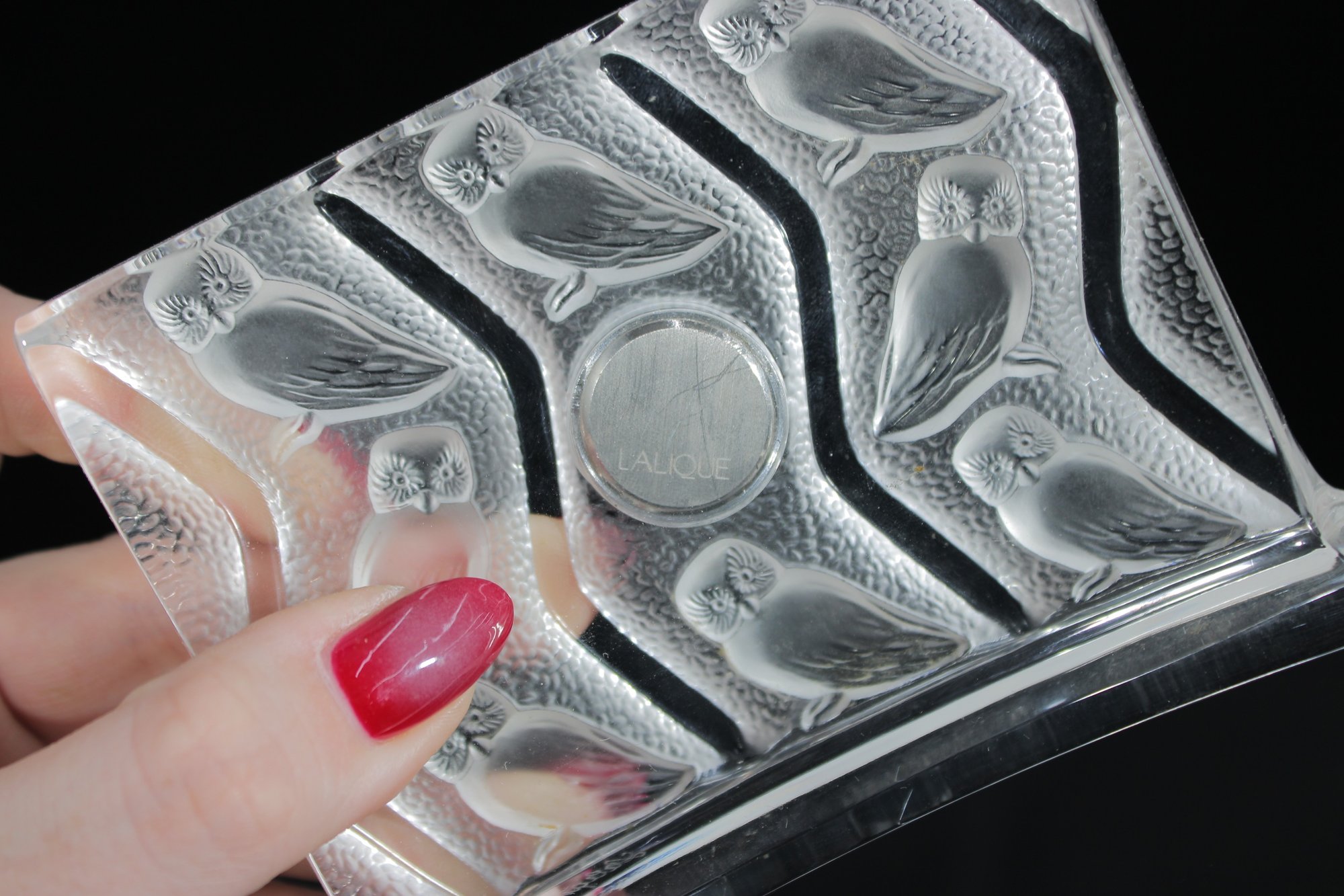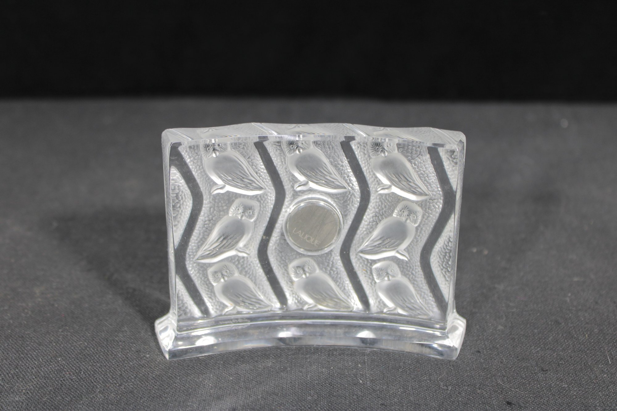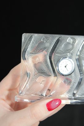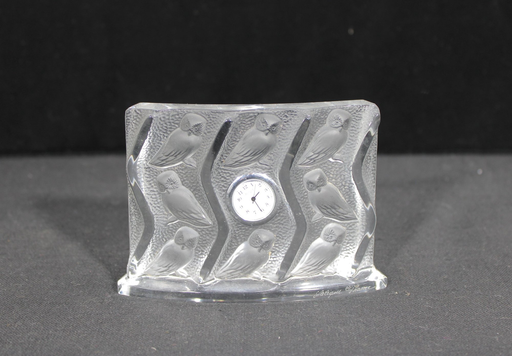 Elegant and collectible Lalique France crystal desk clock featuring the iconic owl motif. This beautifully crafted piece showcases frosted and clear crystal with finely detailed repeating owls in relief, a classic Lalique design known for its texture and depth.