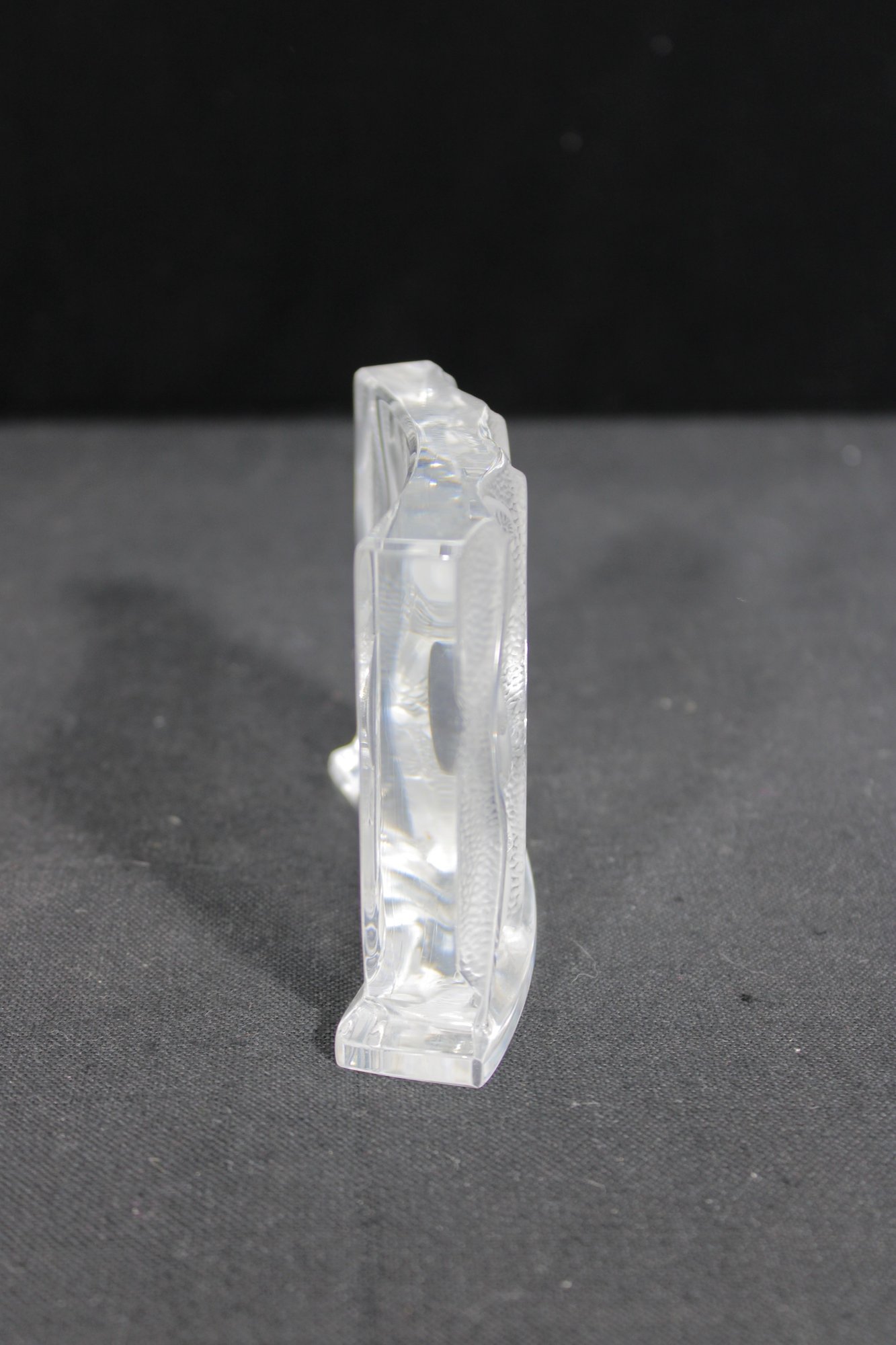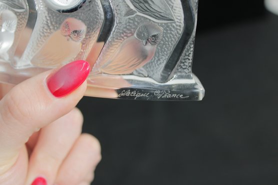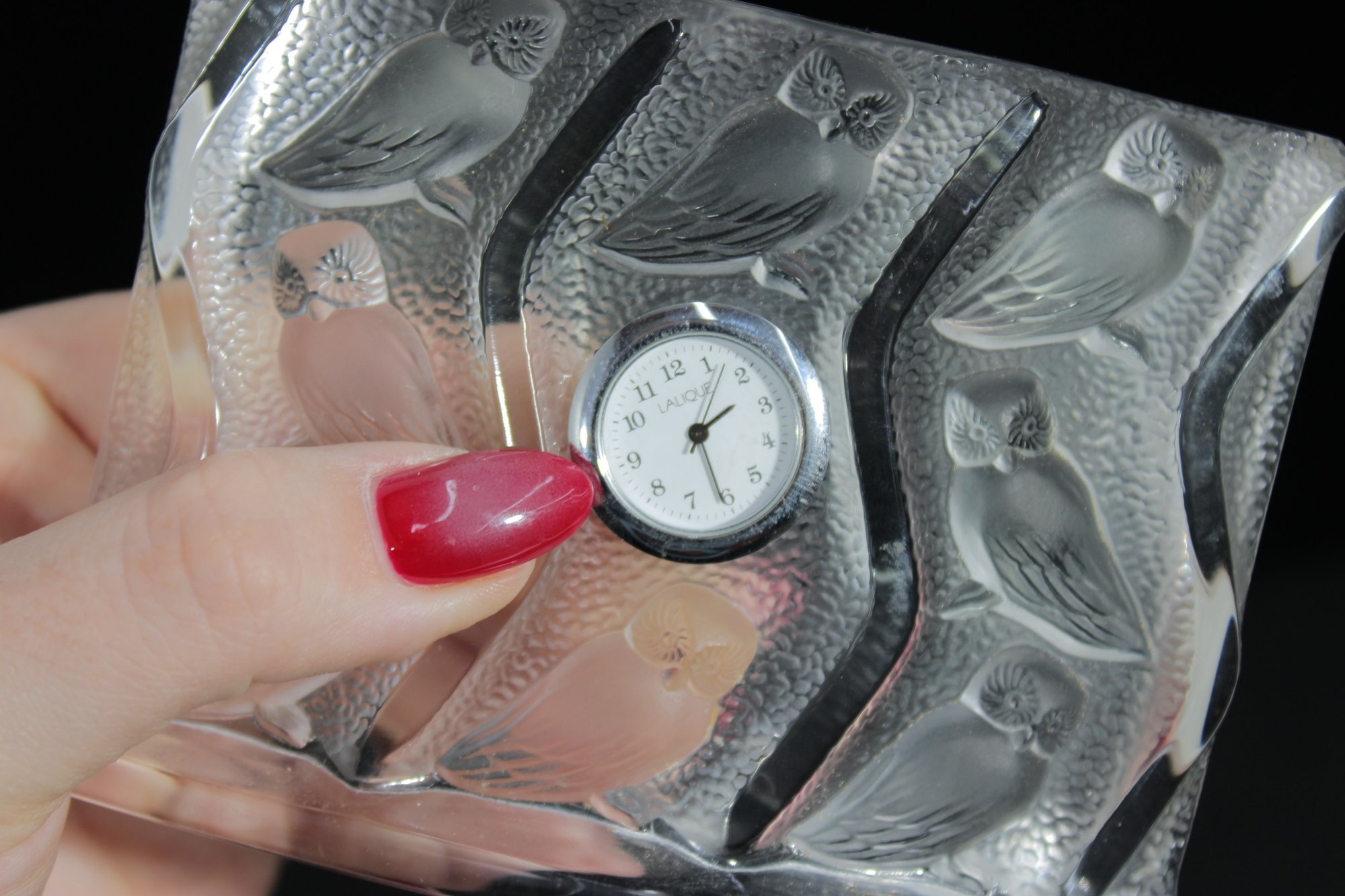 The clock is signed “Lalique France” on the base, confirming authenticity. The small round clock face is set into the crystal, creating a sophisticated and functional decorative object.