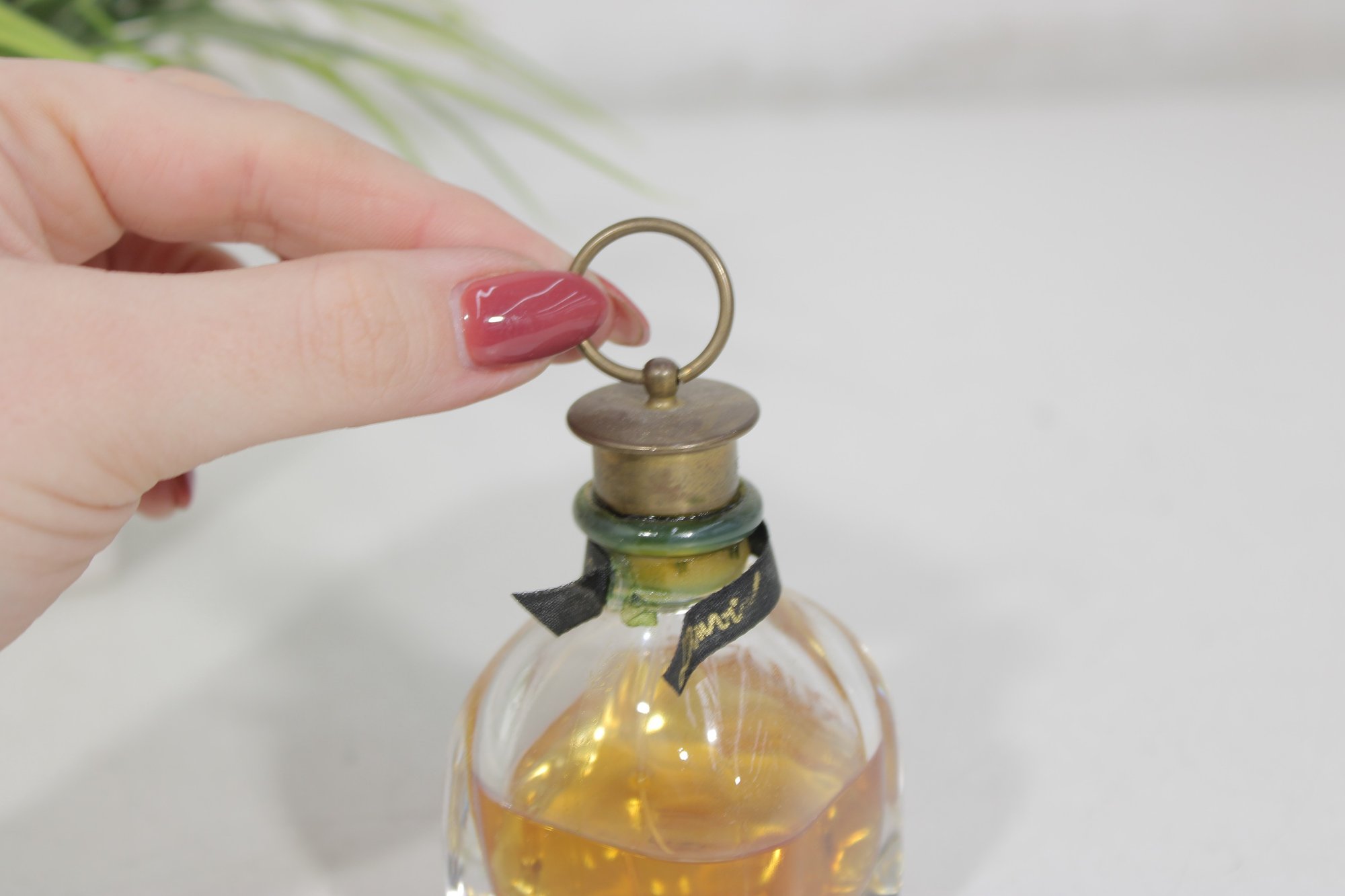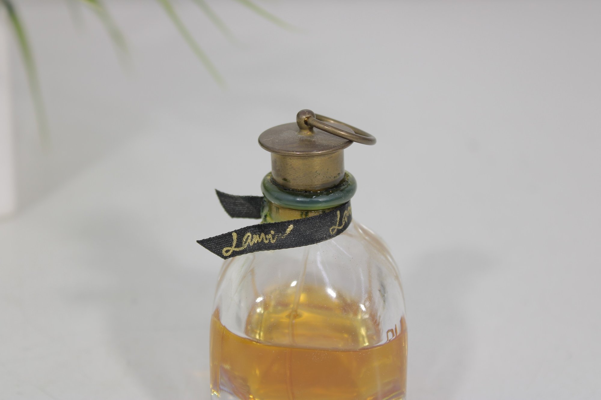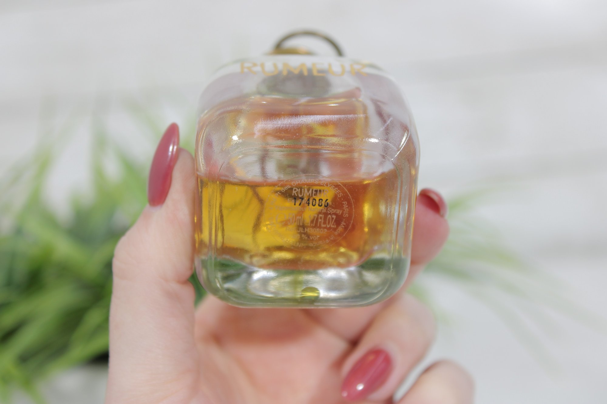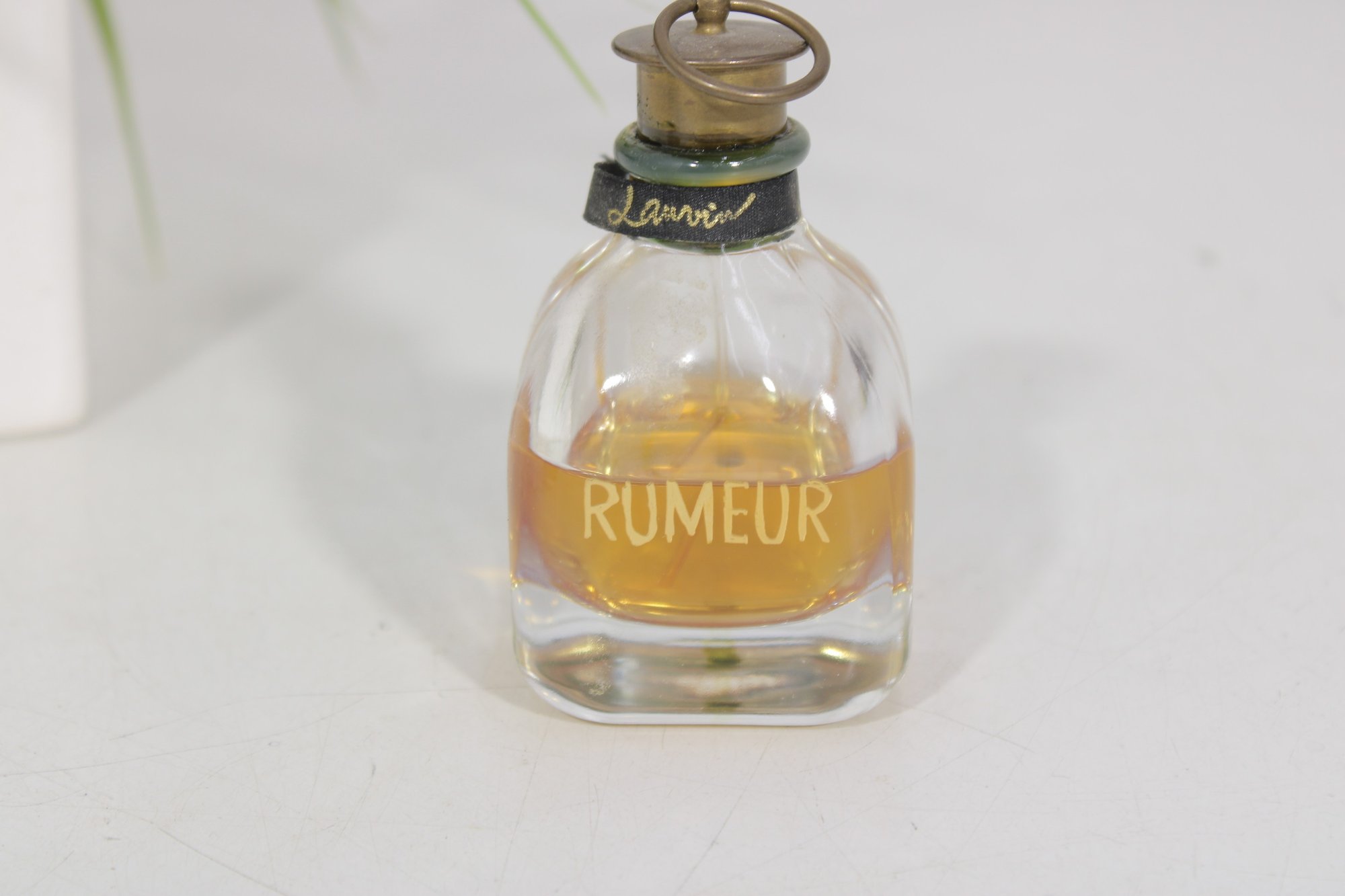 This beautiful fragrance features a rounded clear glass bottle filled with warm amber perfume. The design is accented with a gold-tone front label reading RUMEUR, a dark ribbon at the neck, and a distinctive metal ring detail at the top, giving it a refined vintage-inspired look.
