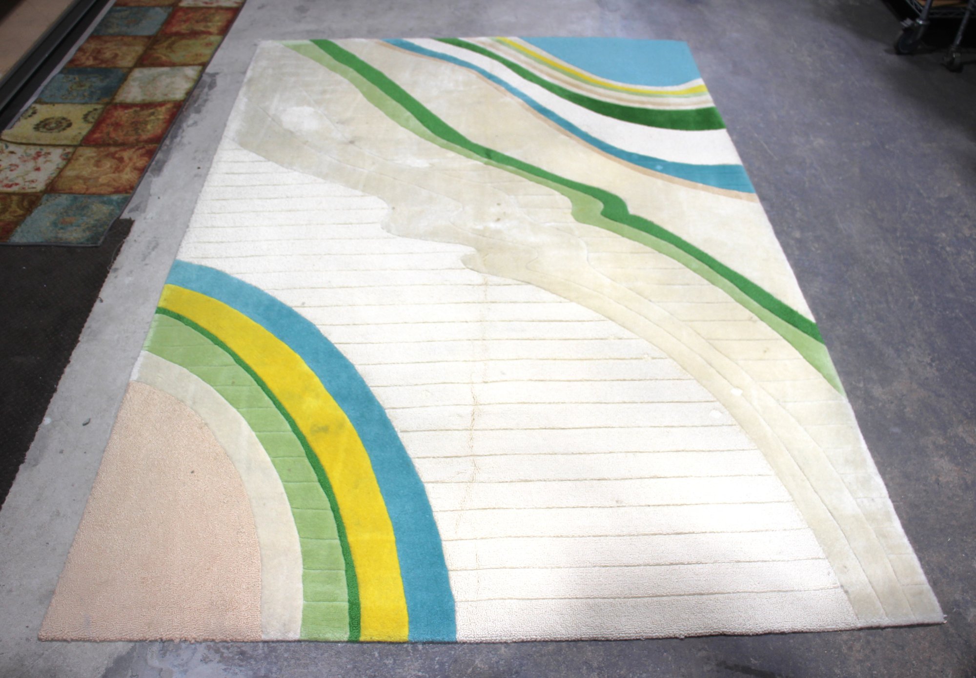 Make a bold statement with this 106" x 71" contemporary abstract area rug, featuring a modern wave-like pattern in shades of blue, green, yellow, and cream. This eye-catching rug blends soft neutrals with vibrant accents, making it perfect for a modern, mid-century, or eclectic space.