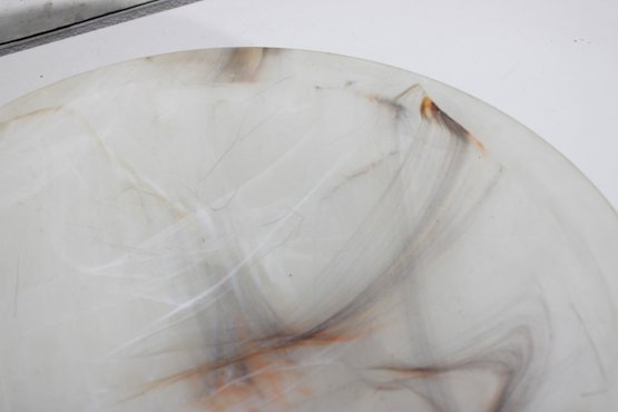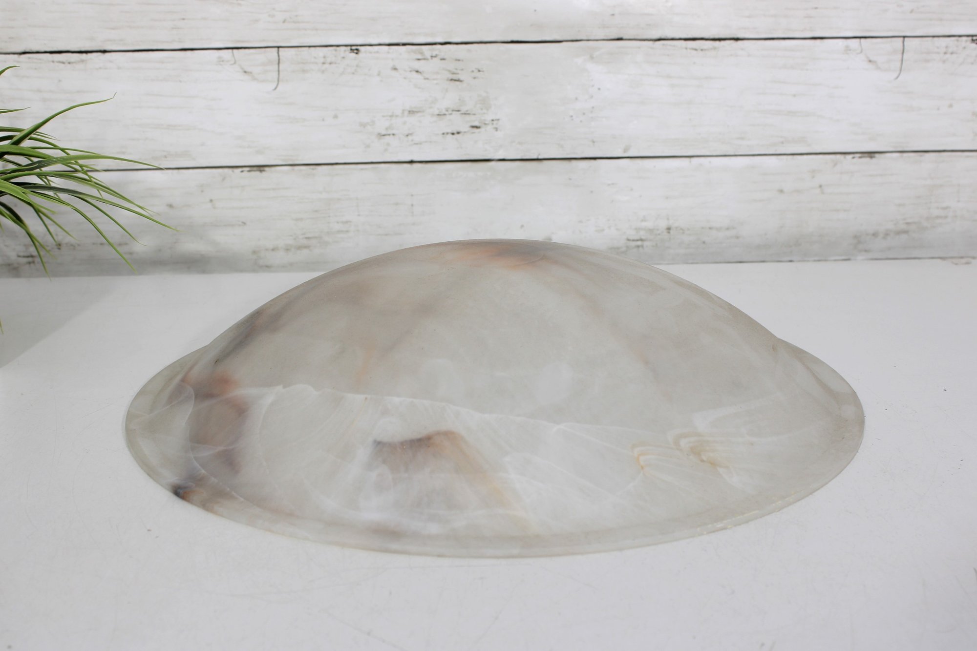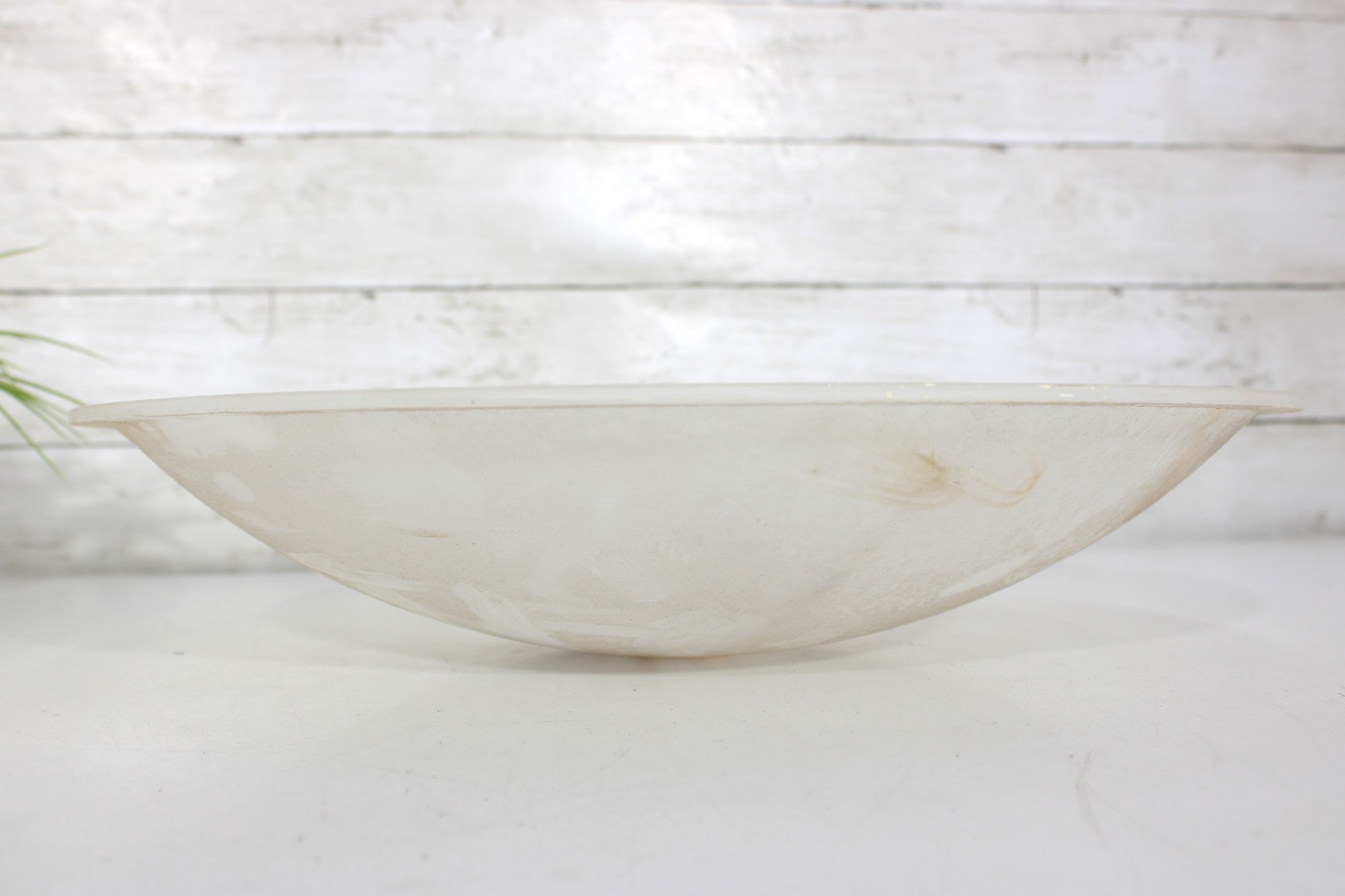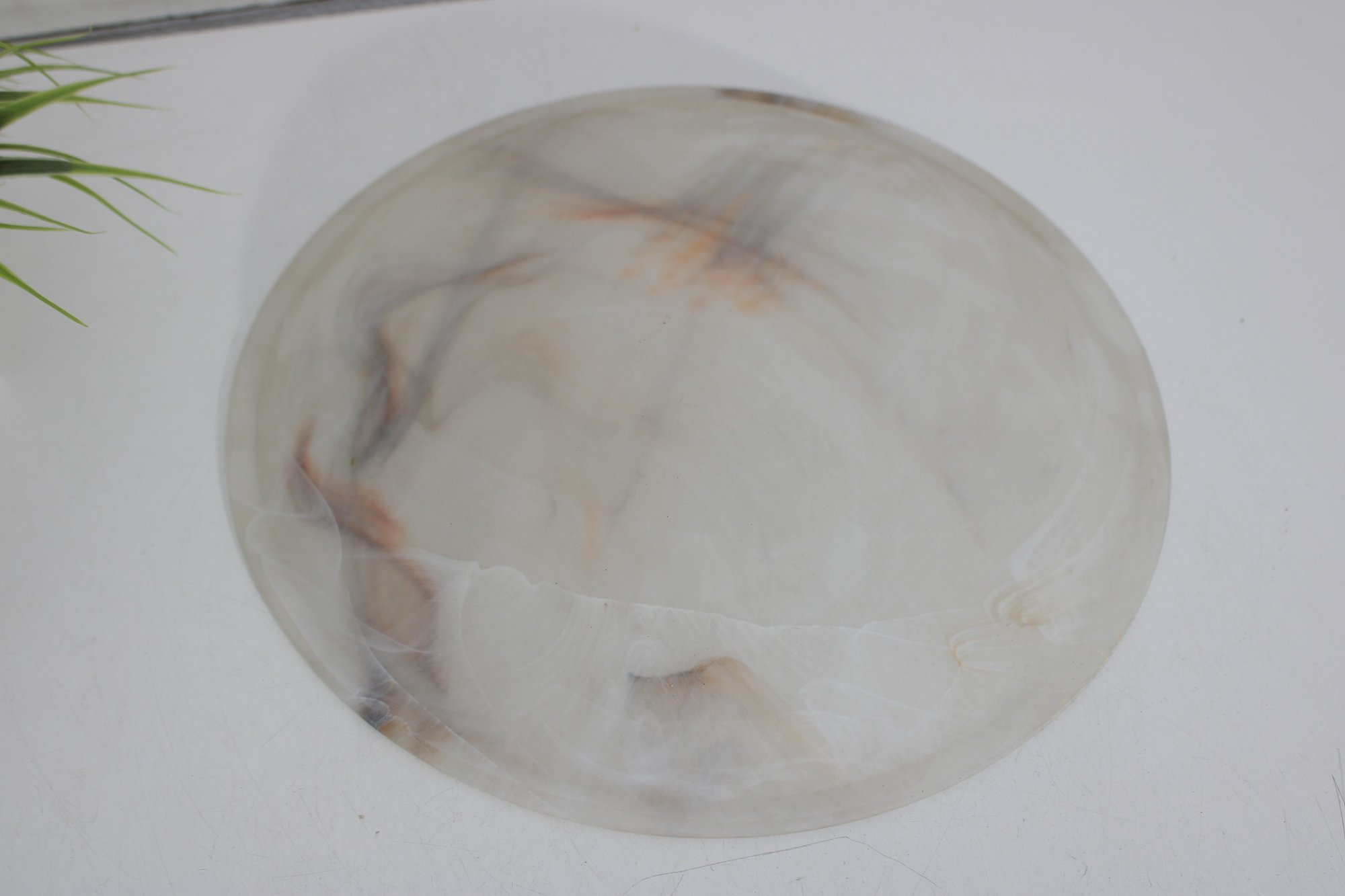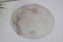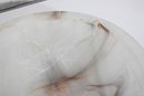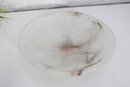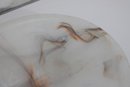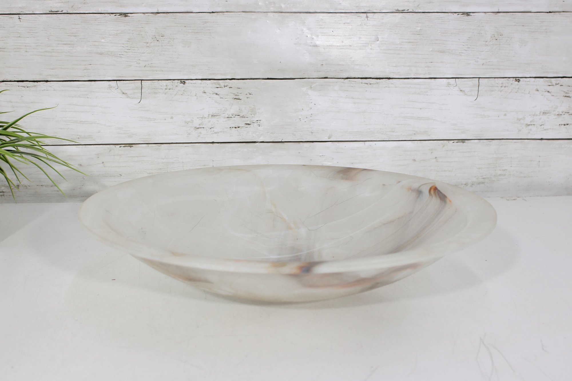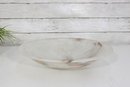 This substantial bowl showcases stunning natural stone patterns throughout, with flowing translucent areas and warm earthy streaks that make each angle unique. The shallow, wide form makes it perfect as a centerpiece bowl, fruit display, or decorative accent.