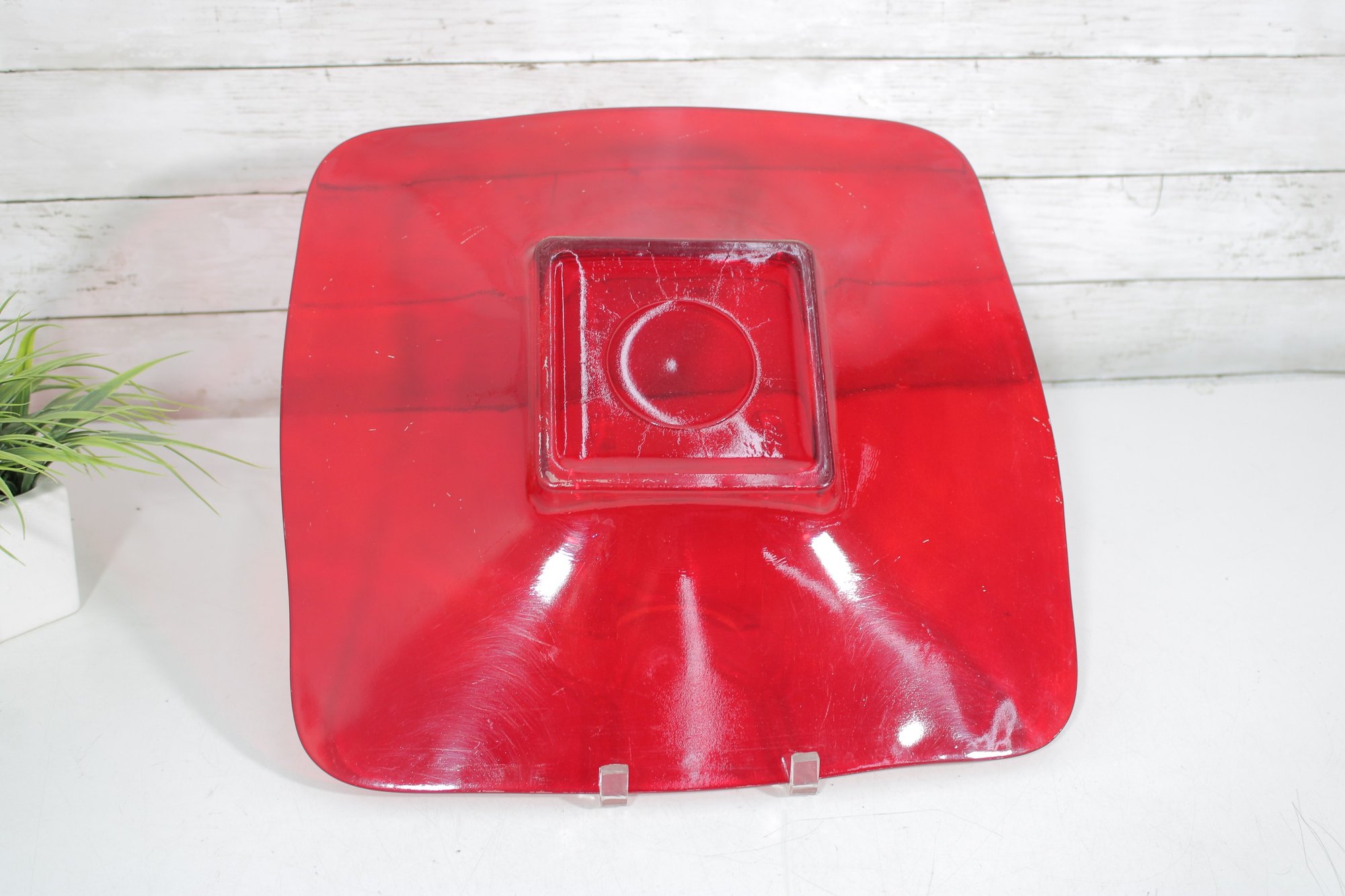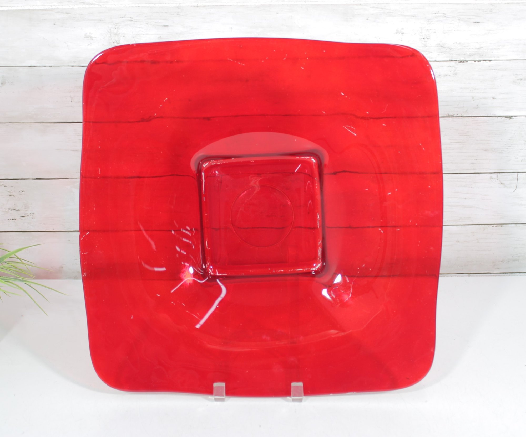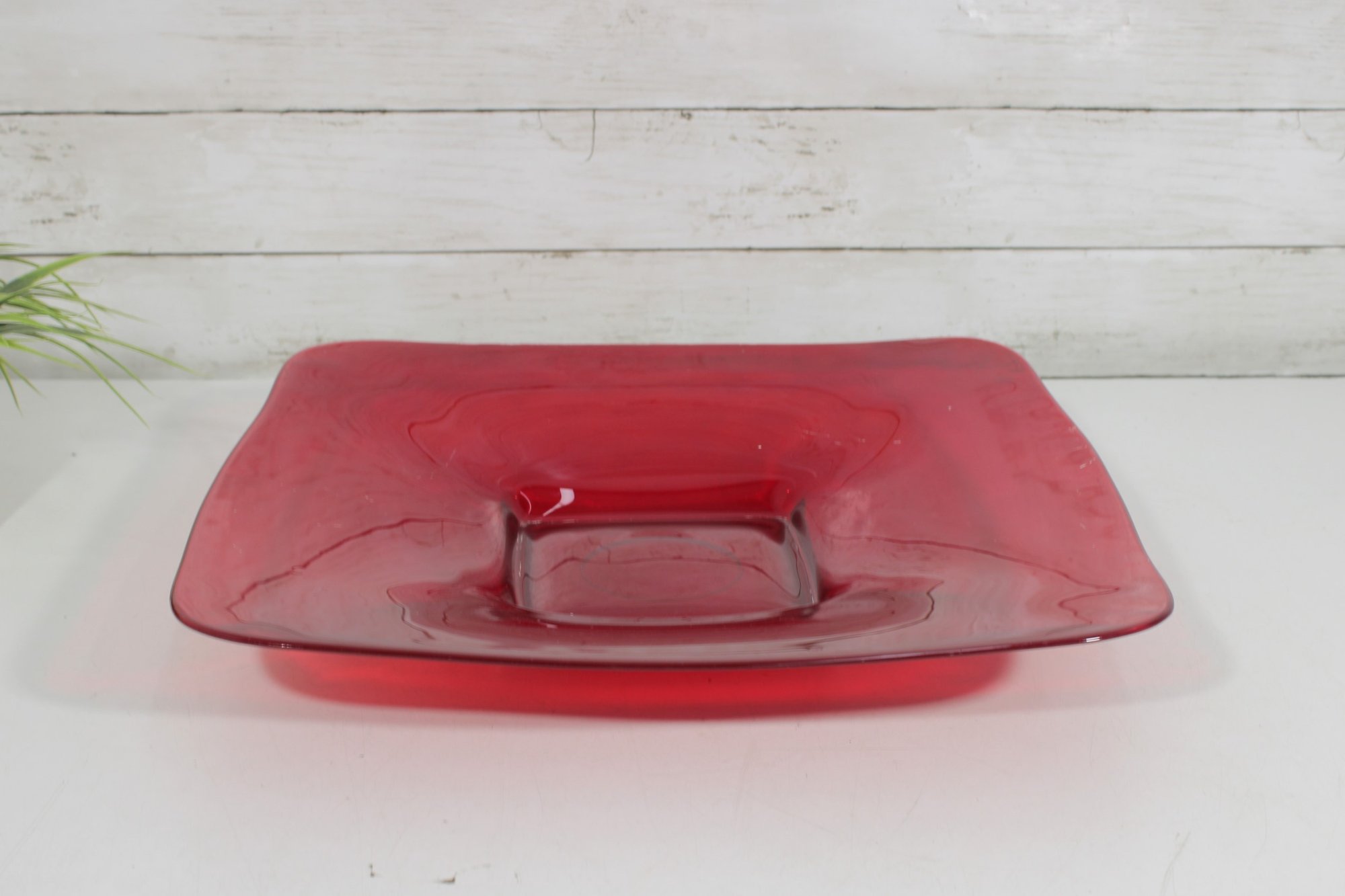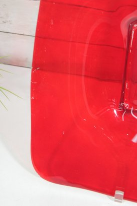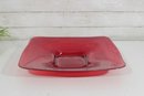 Bold and eye-catching large red glass dish, perfect for modern home décor or as a statement centerpiece. This striking 16” square bowl features gently curved edges and a raised square center, giving it a sleek, contemporary look. The vibrant translucent red glass catches the light beautifully, making it a standout piece on any table, shelf, or display.
