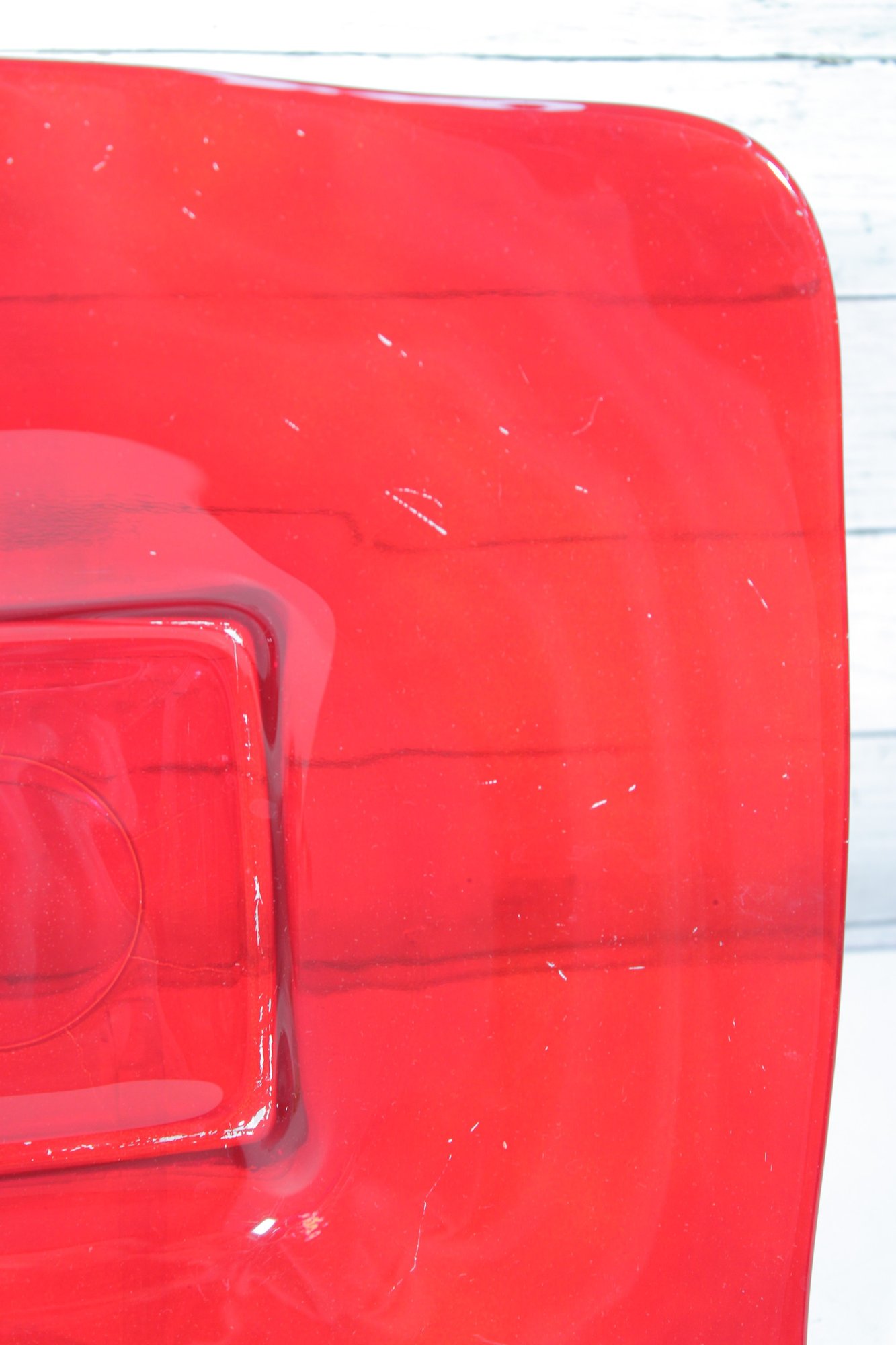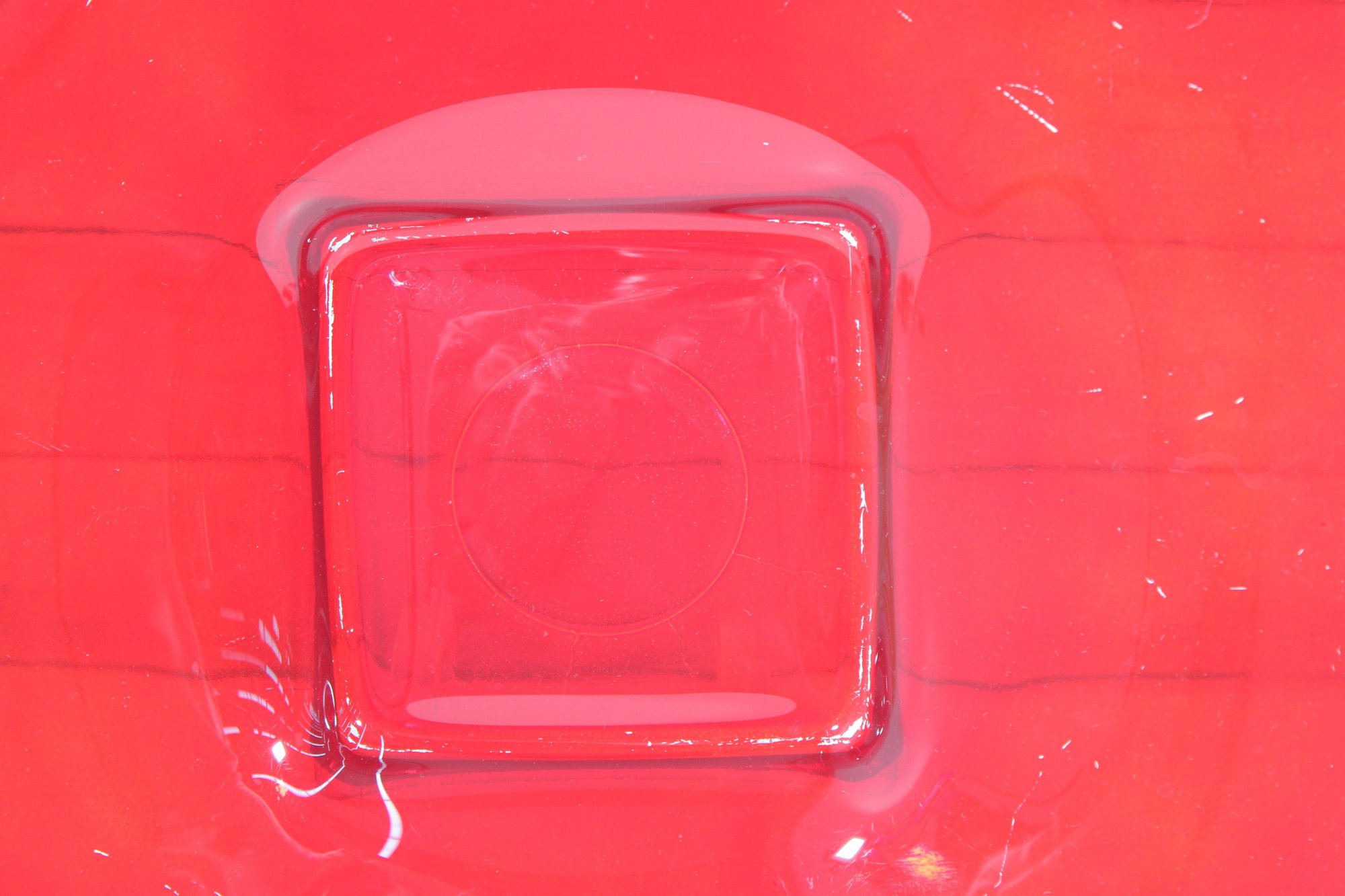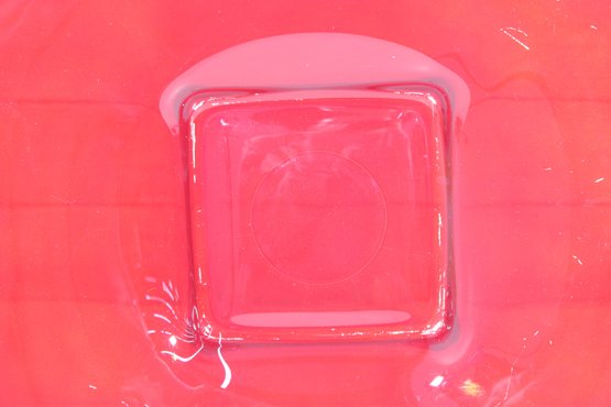 Bold and eye-catching large red glass dish, perfect for modern home décor or as a statement centerpiece. This striking 16” square bowl features gently curved edges and a raised square center, giving it a sleek, contemporary look. The vibrant translucent red glass catches the light beautifully, making it a standout piece on any table, shelf, or display.