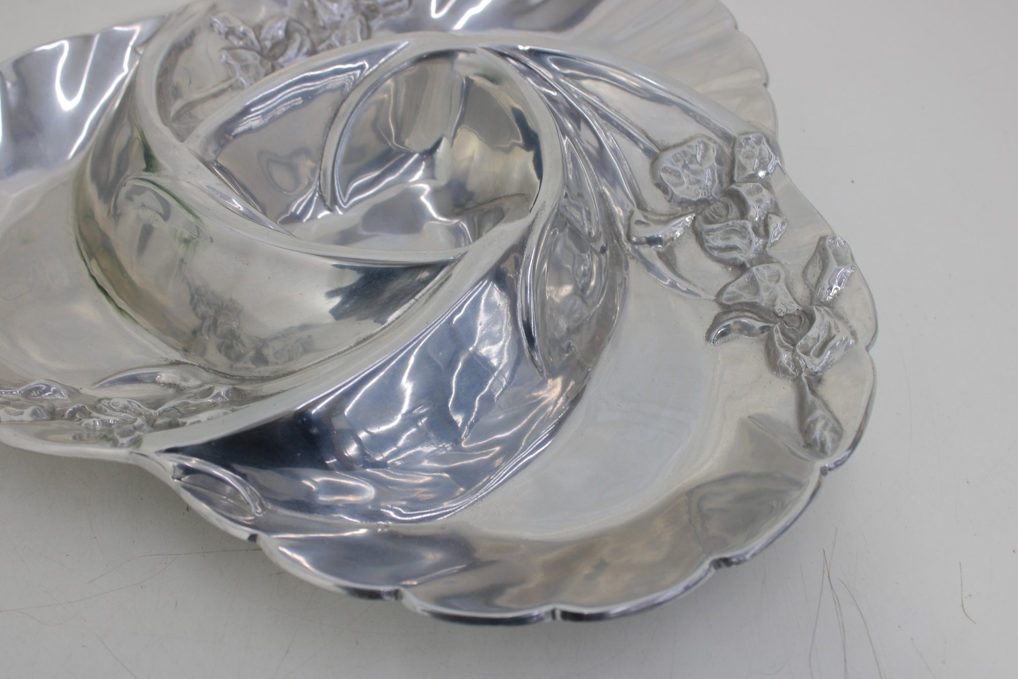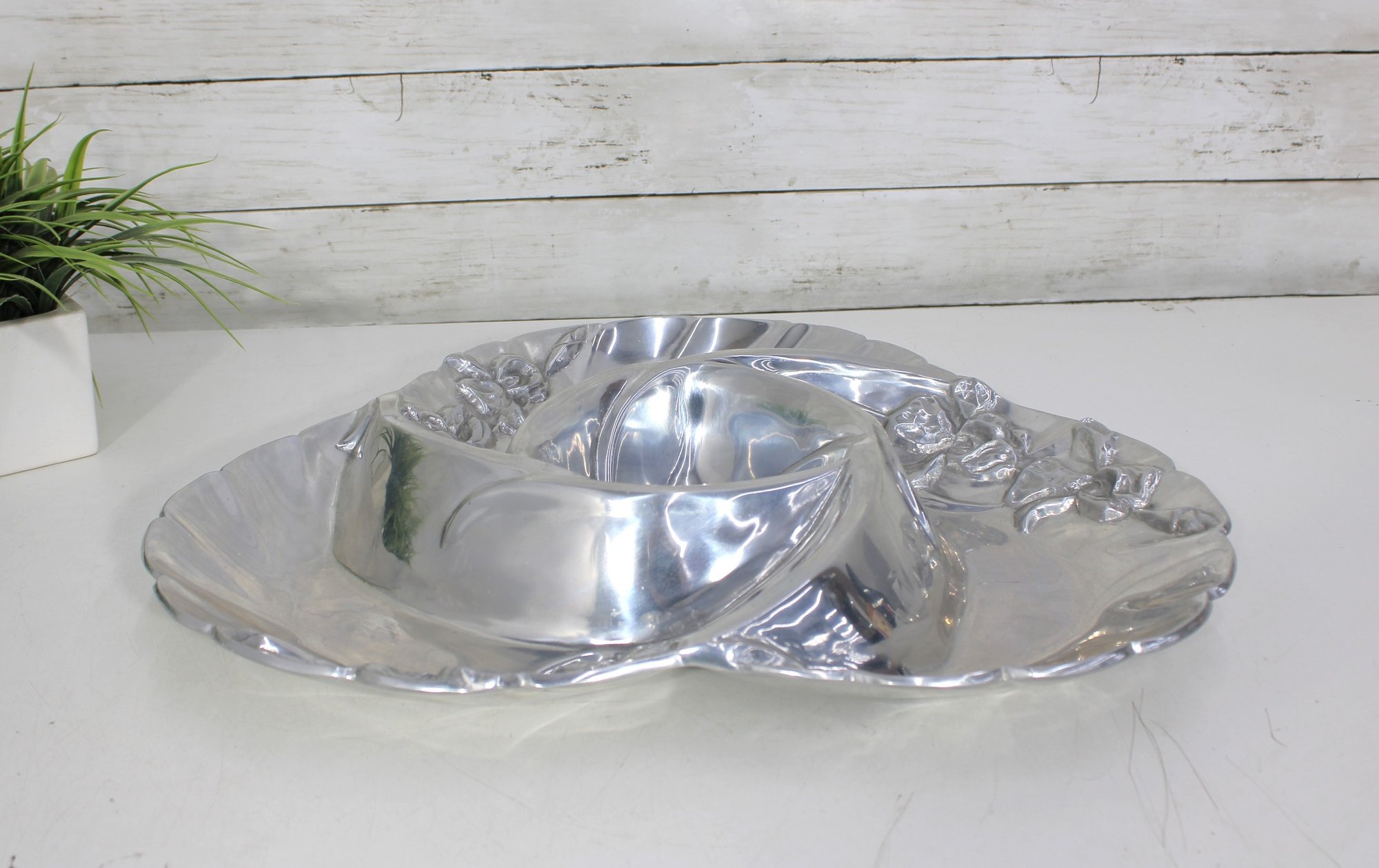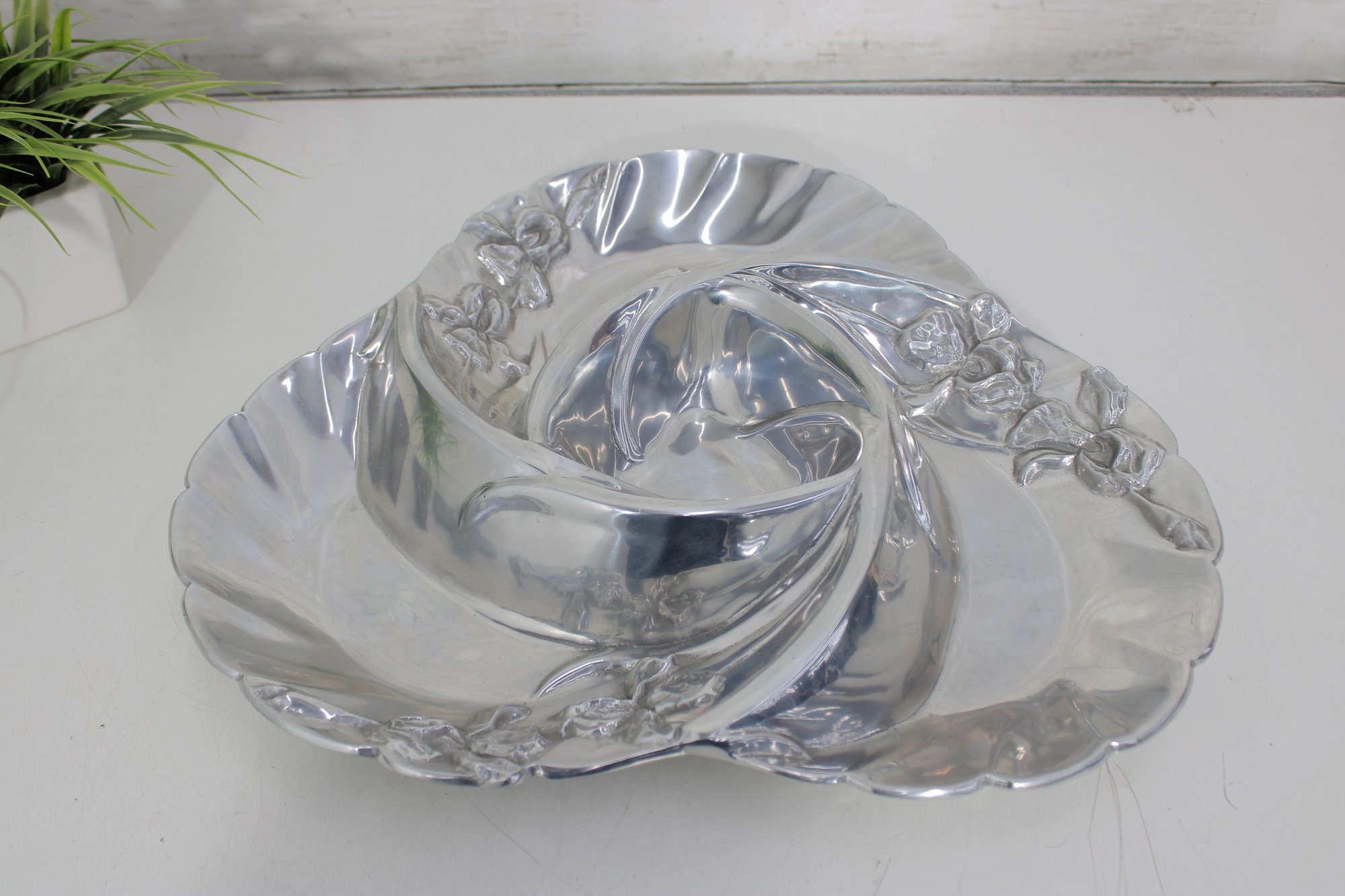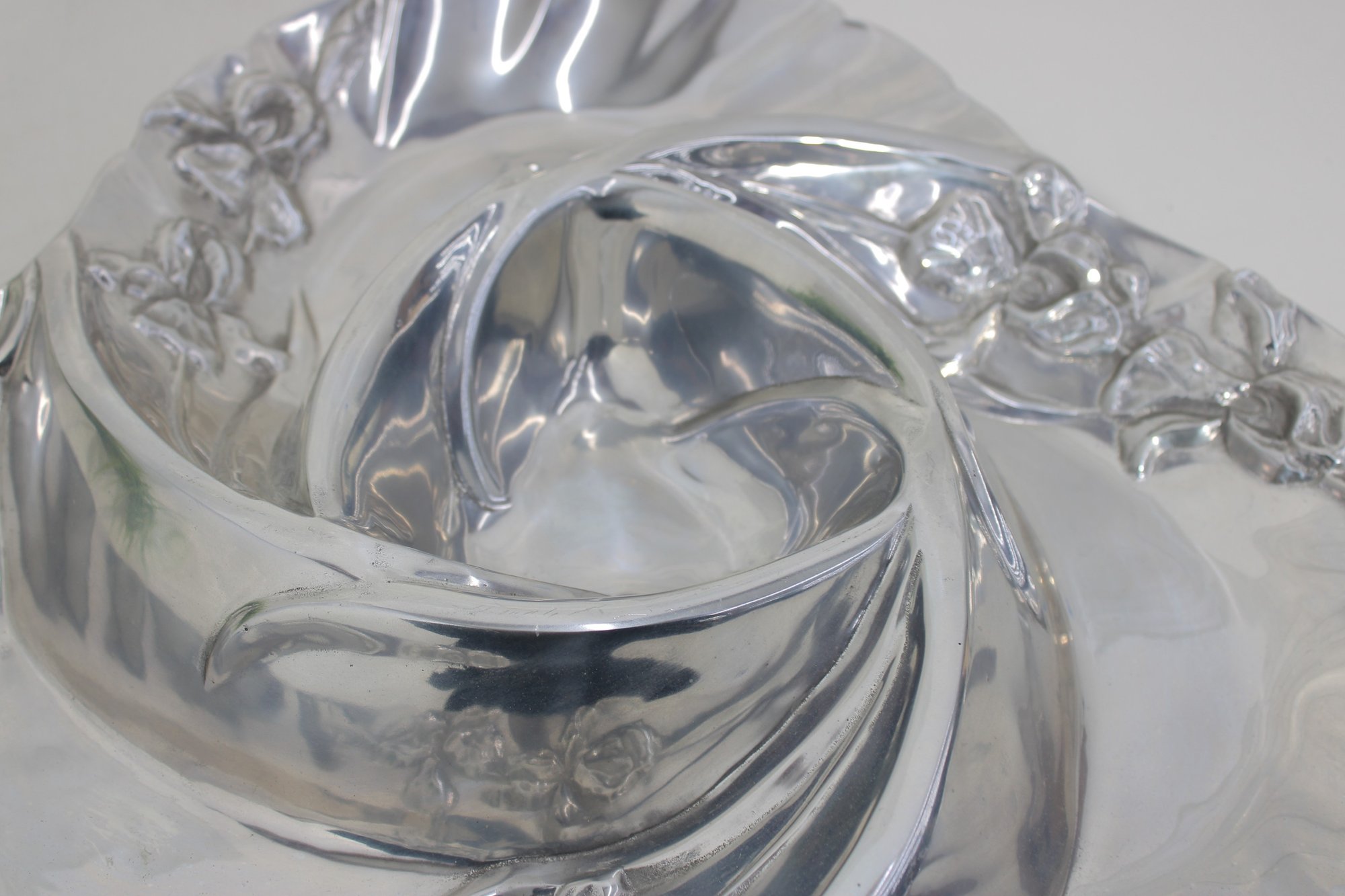 This impressive platter features a beautifully sculpted swirling form with raised iris flowers and flowing petal details along the rim. The high-polish aluminum finish gives it a bright, reflective surface that enhances the dimensional floral design.