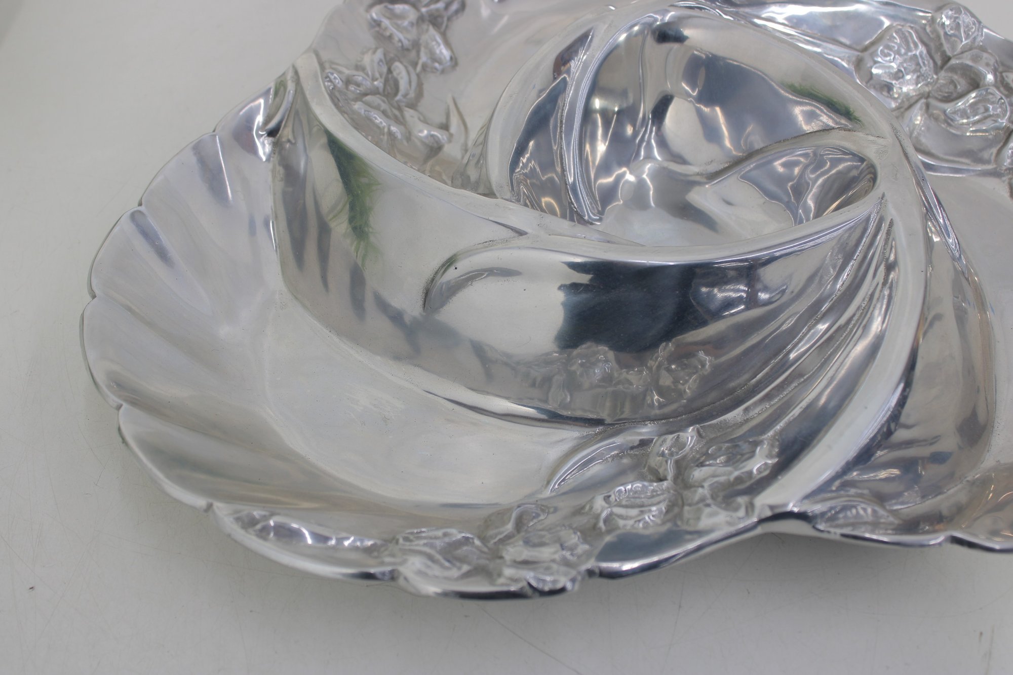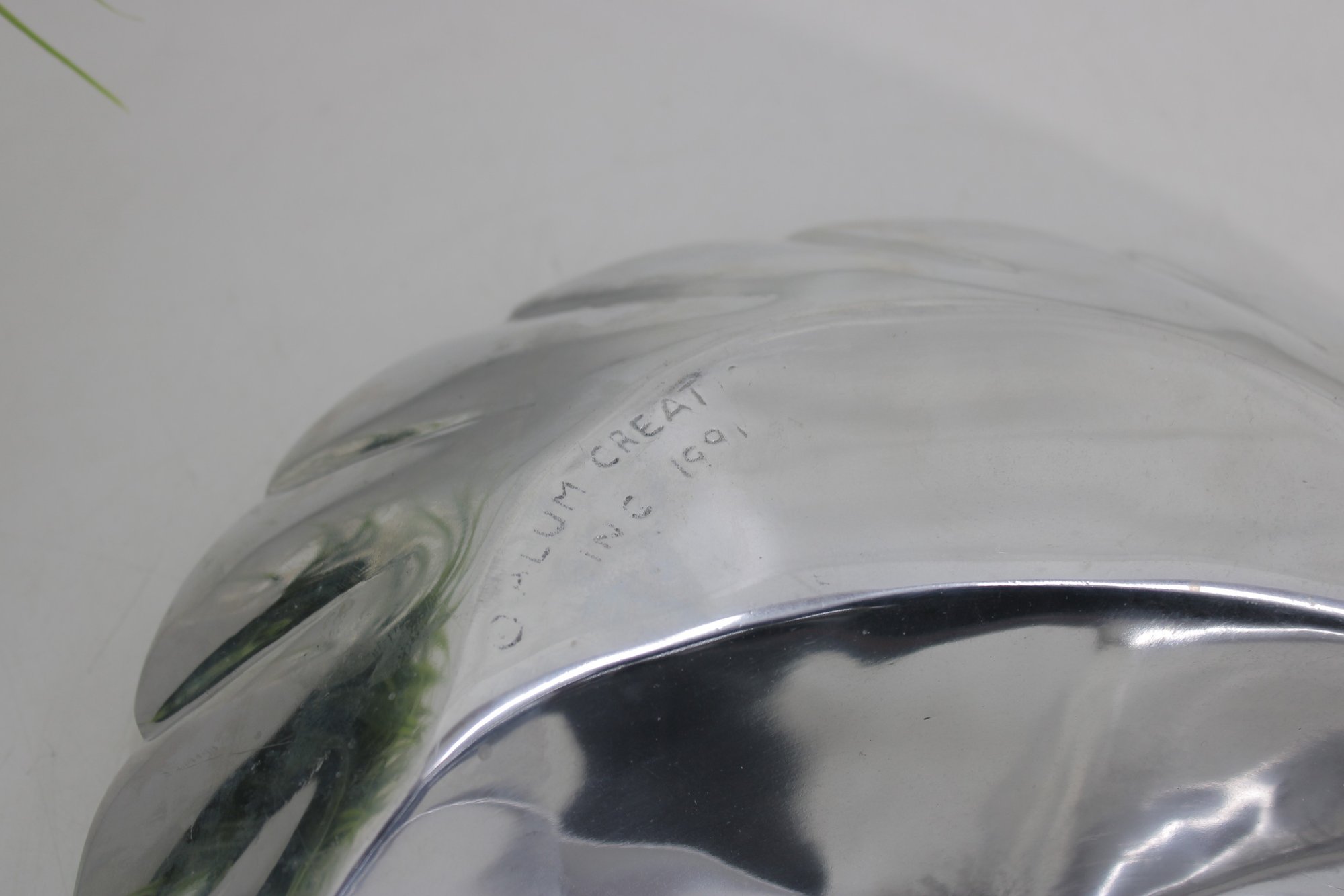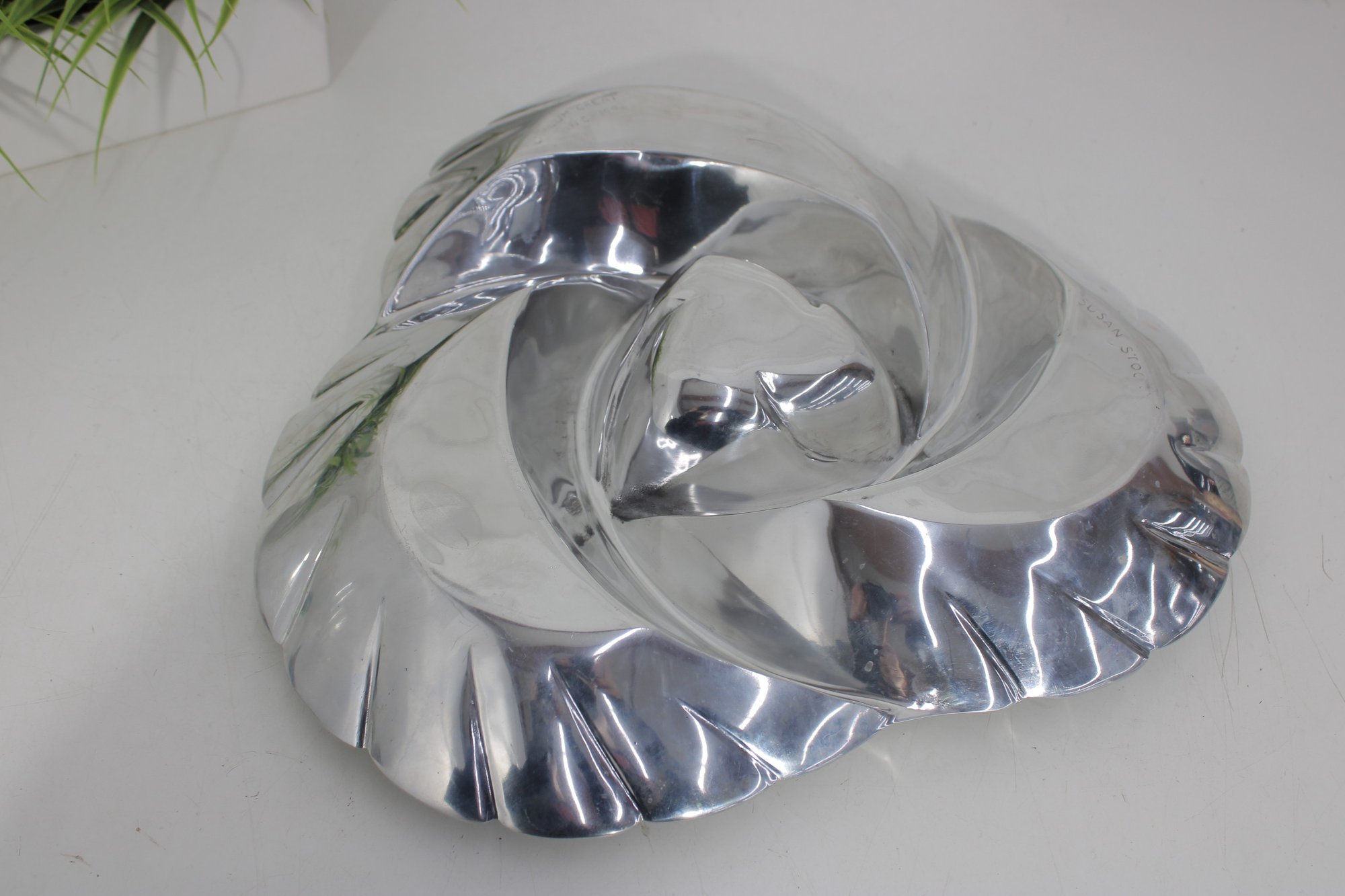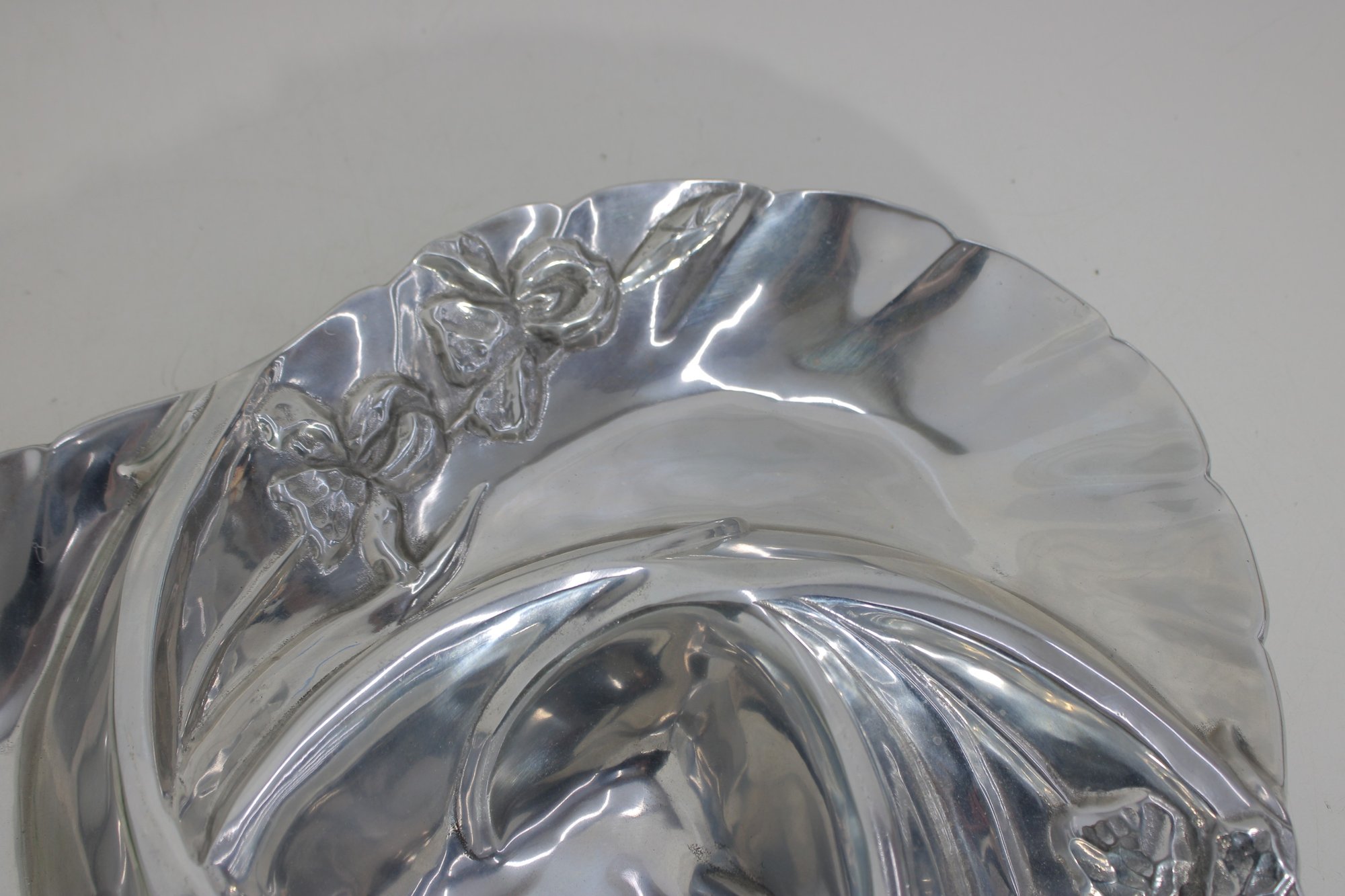 This impressive platter features a beautifully sculpted swirling form with raised iris flowers and flowing petal details along the rim. The high-polish aluminum finish gives it a bright, reflective surface that enhances the dimensional floral design.