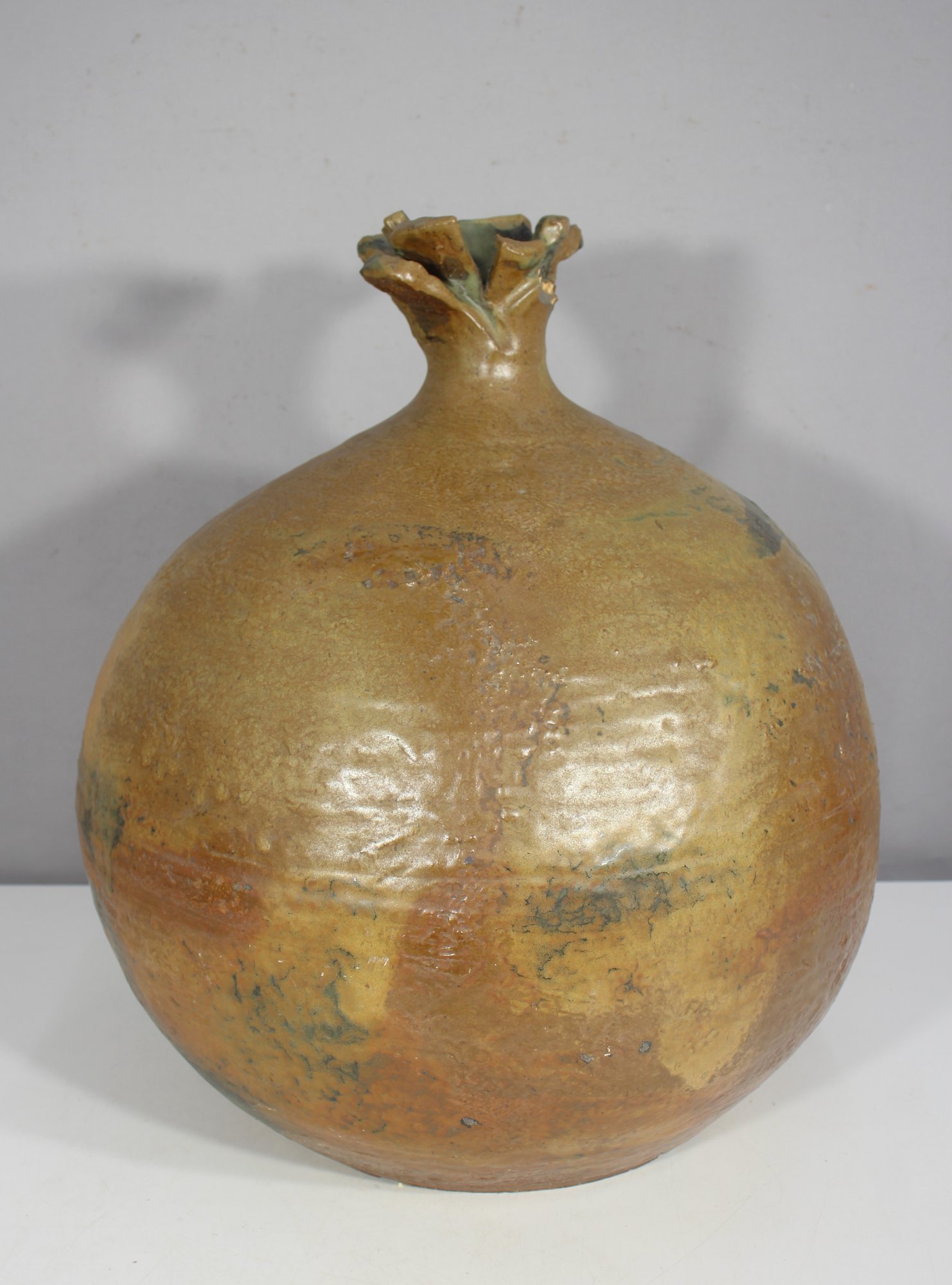 This stunning 20-inch tall handcrafted pottery vase features a beautifully organic form with a rich, earthy glaze. Its rounded body and uniquely sculpted, crimped opening create a striking visual appeal, perfect for collectors of fine ceramics or those seeking a distinctive decorative piece. The vase’s textured surface displays a natural blend of warm, earthy tones with subtle green and brown accents, adding to its rustic charm.