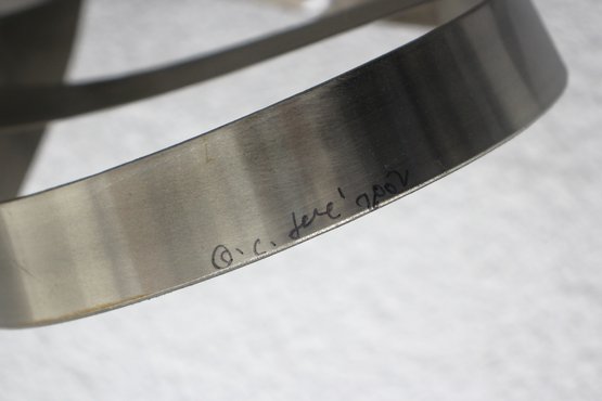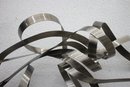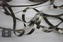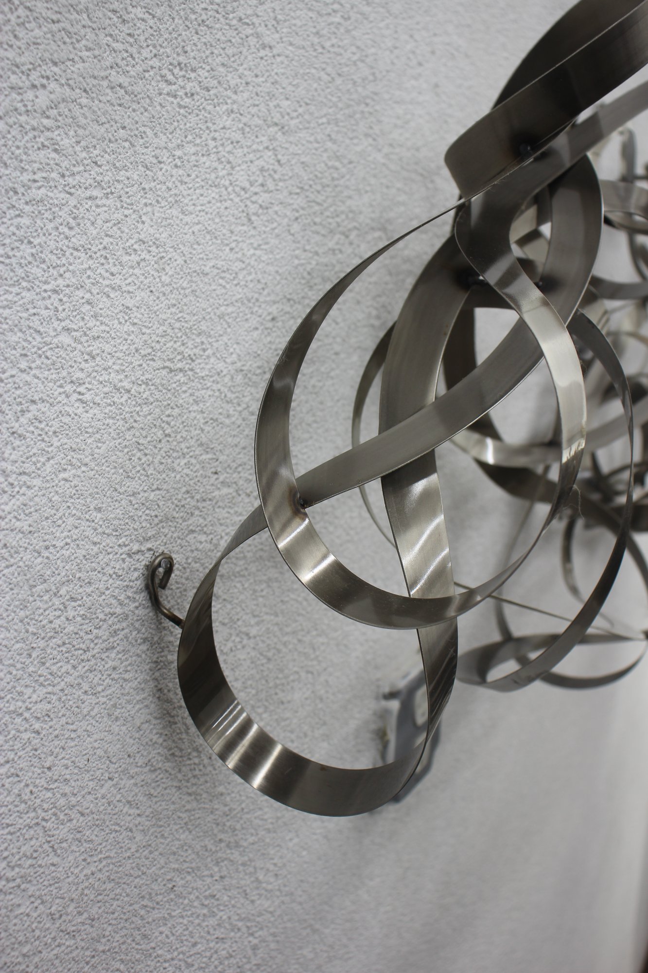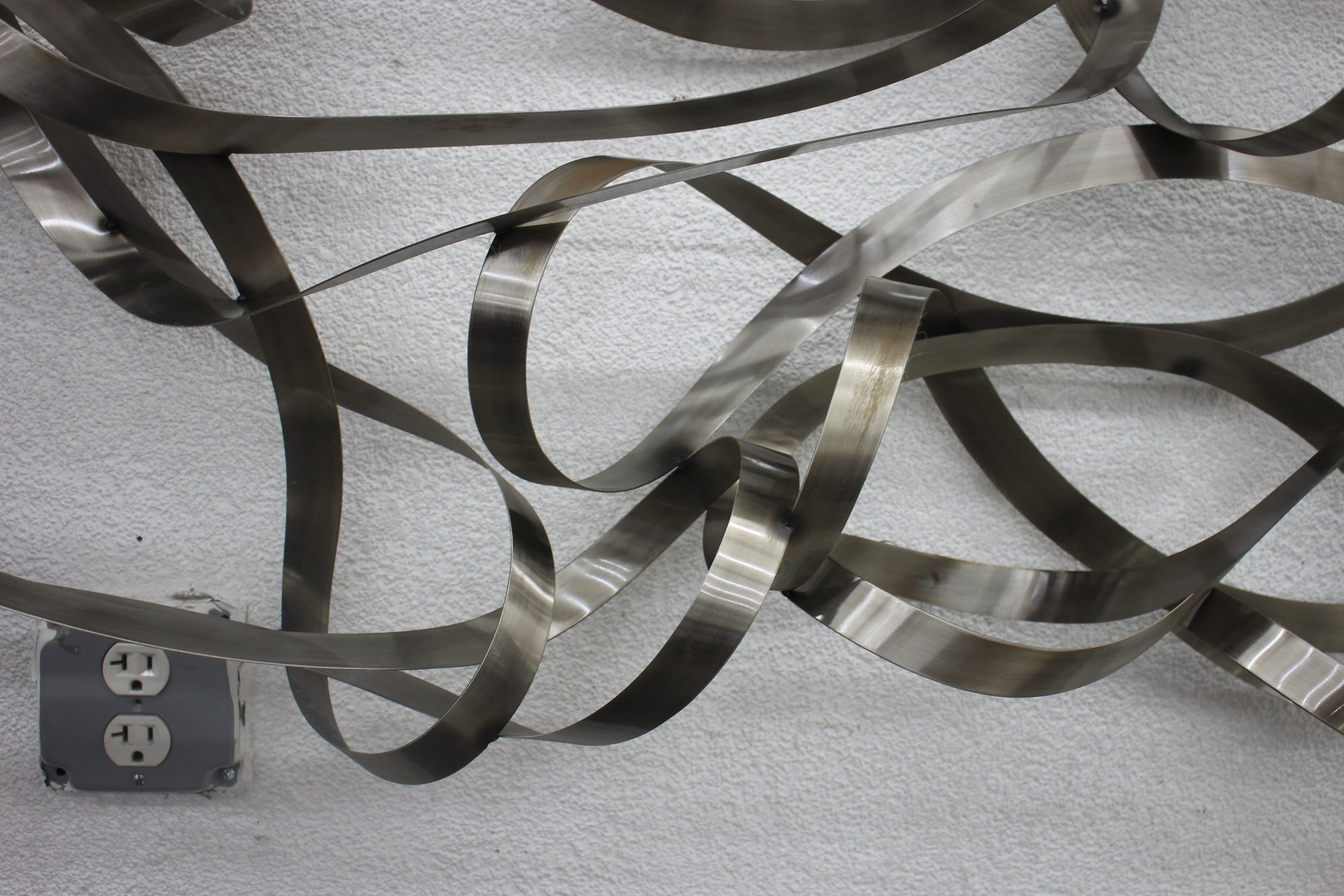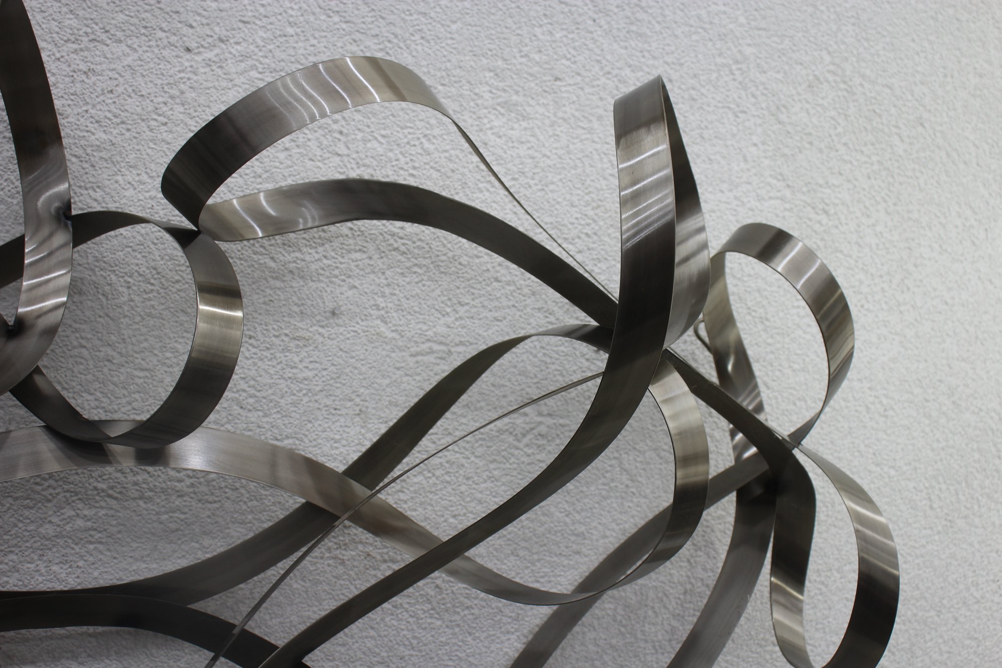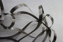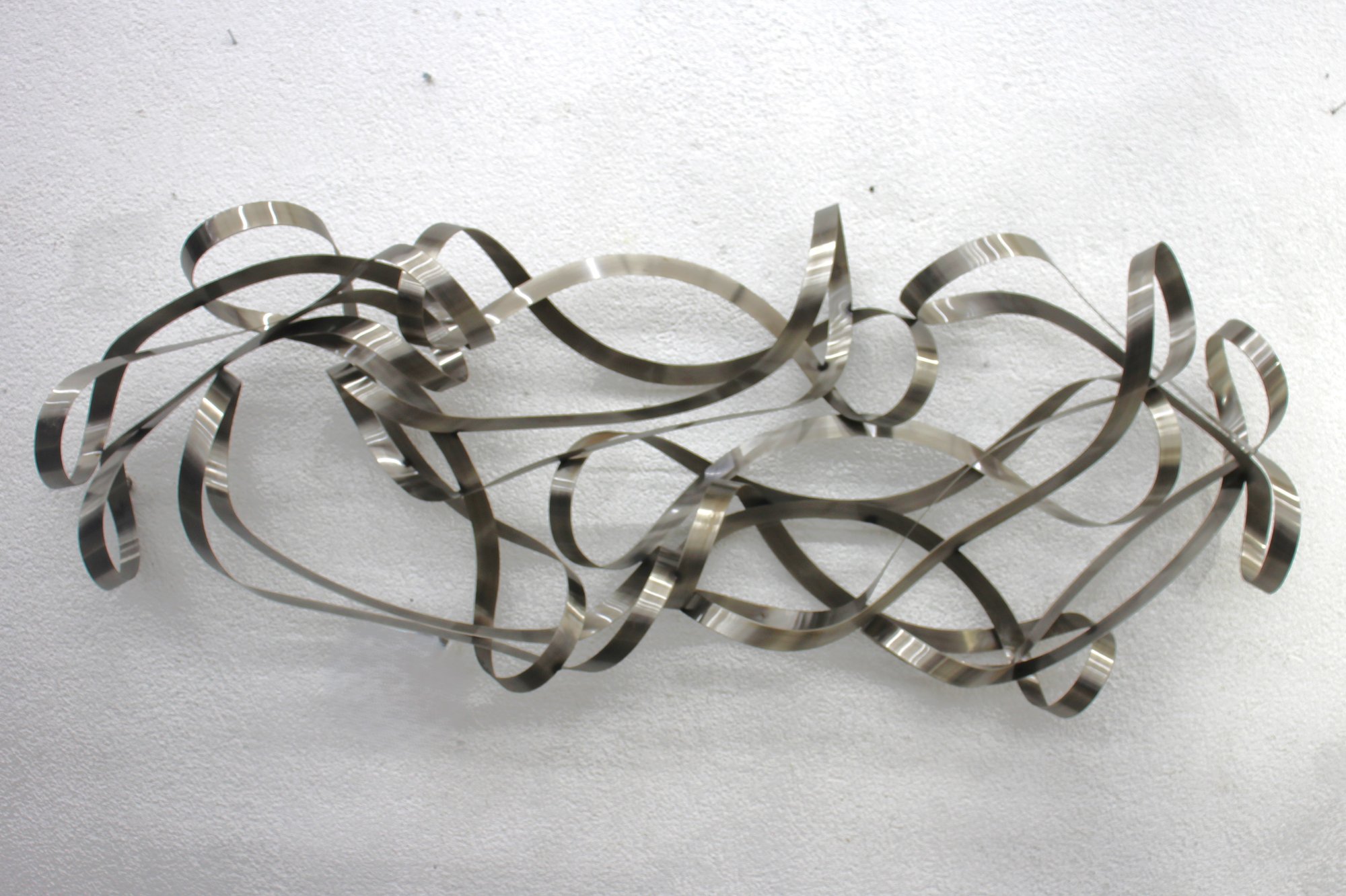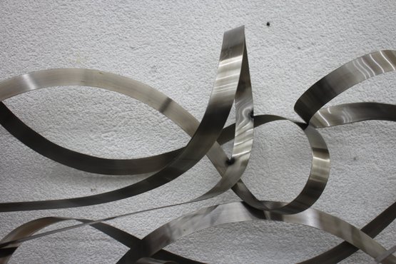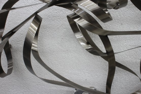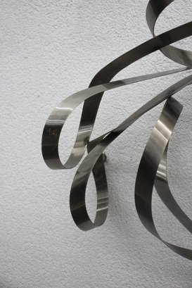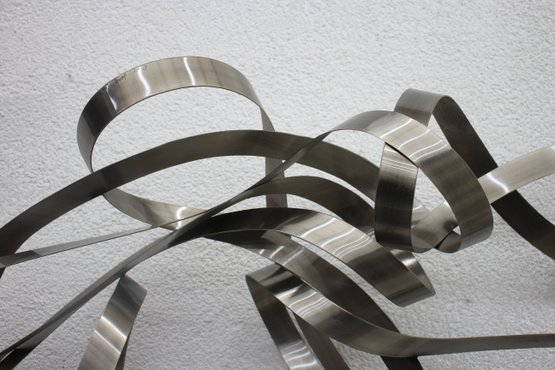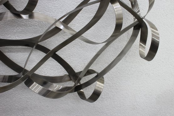 This stunning large-scale abstract metal ribbon sculpture is a true statement piece, featuring flowing, interwoven stainless steel ribbons that create a dynamic and modern aesthetic.
