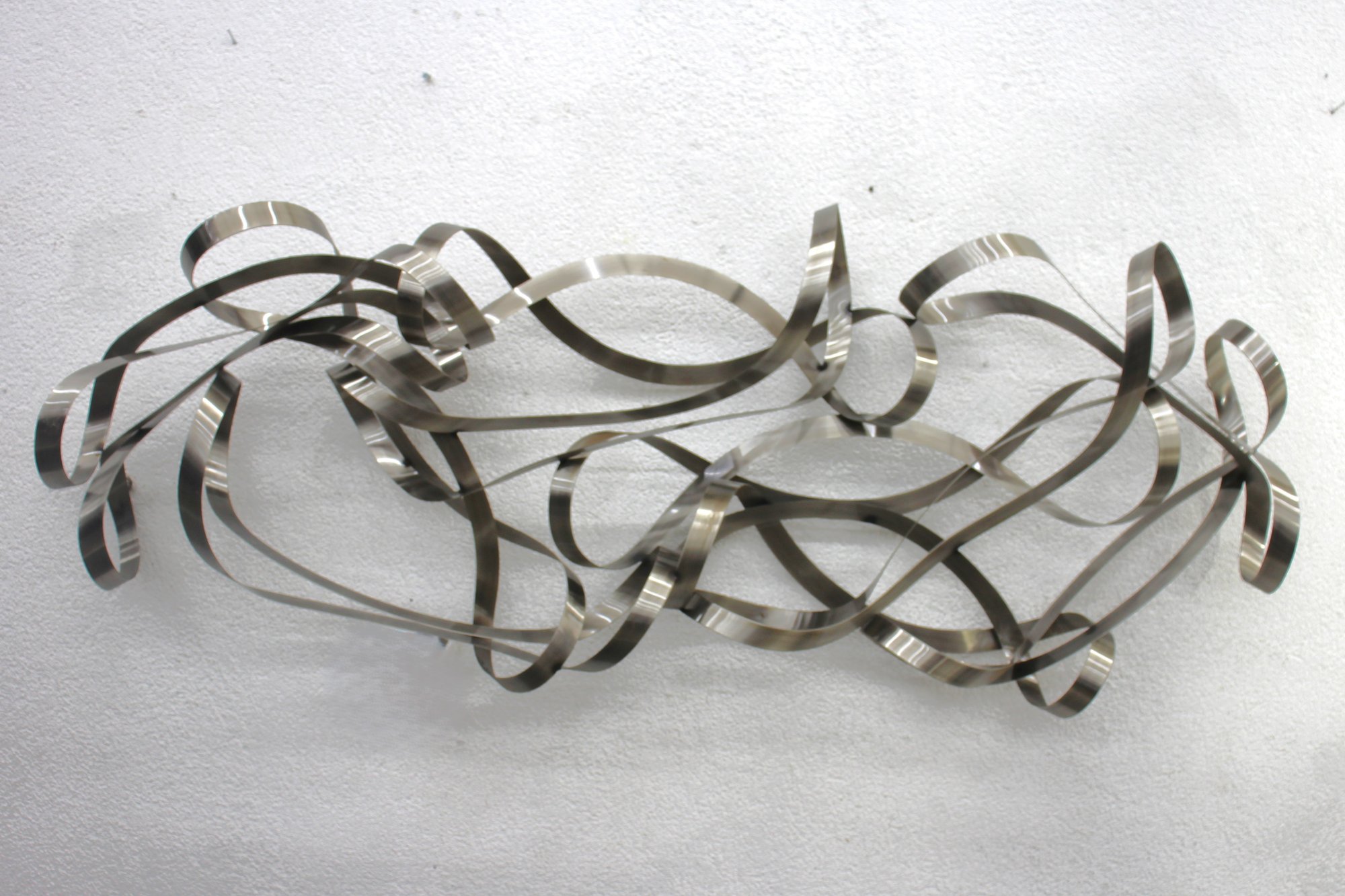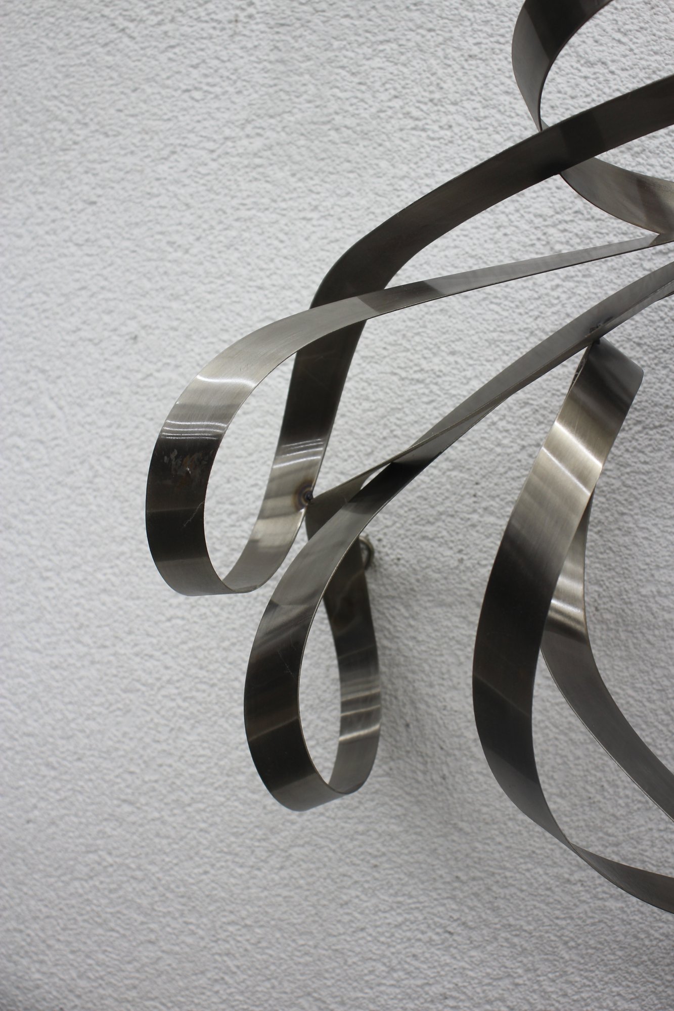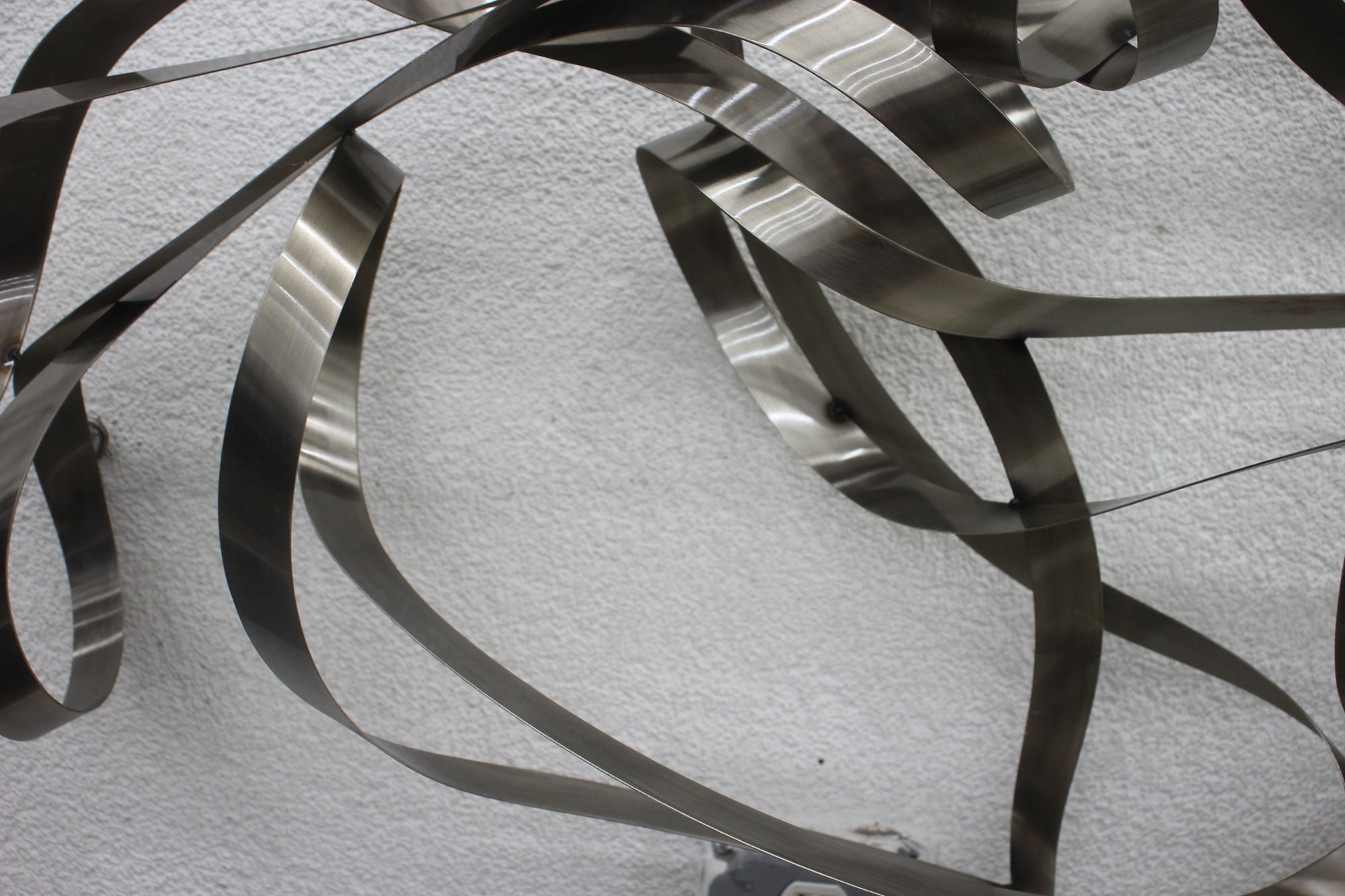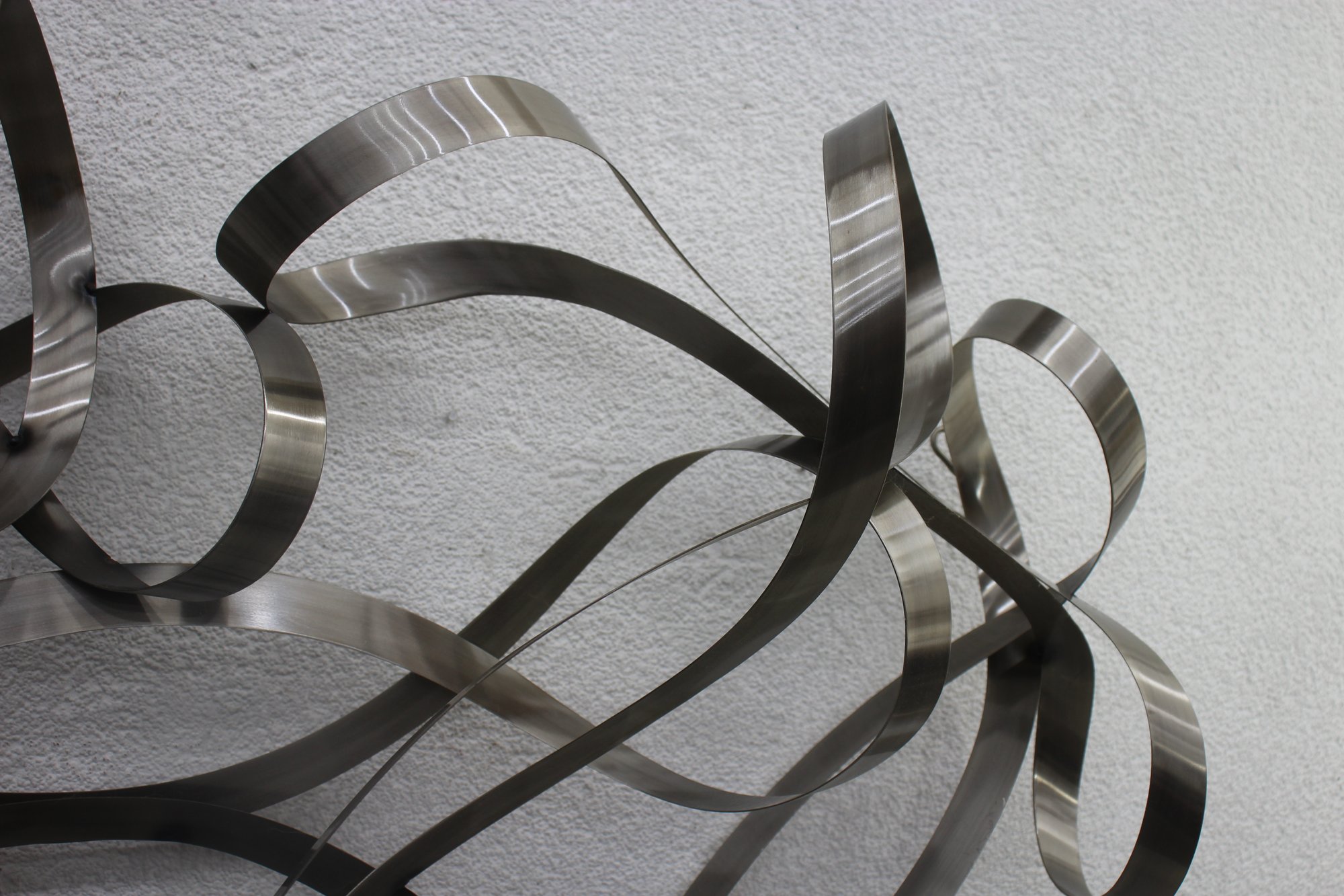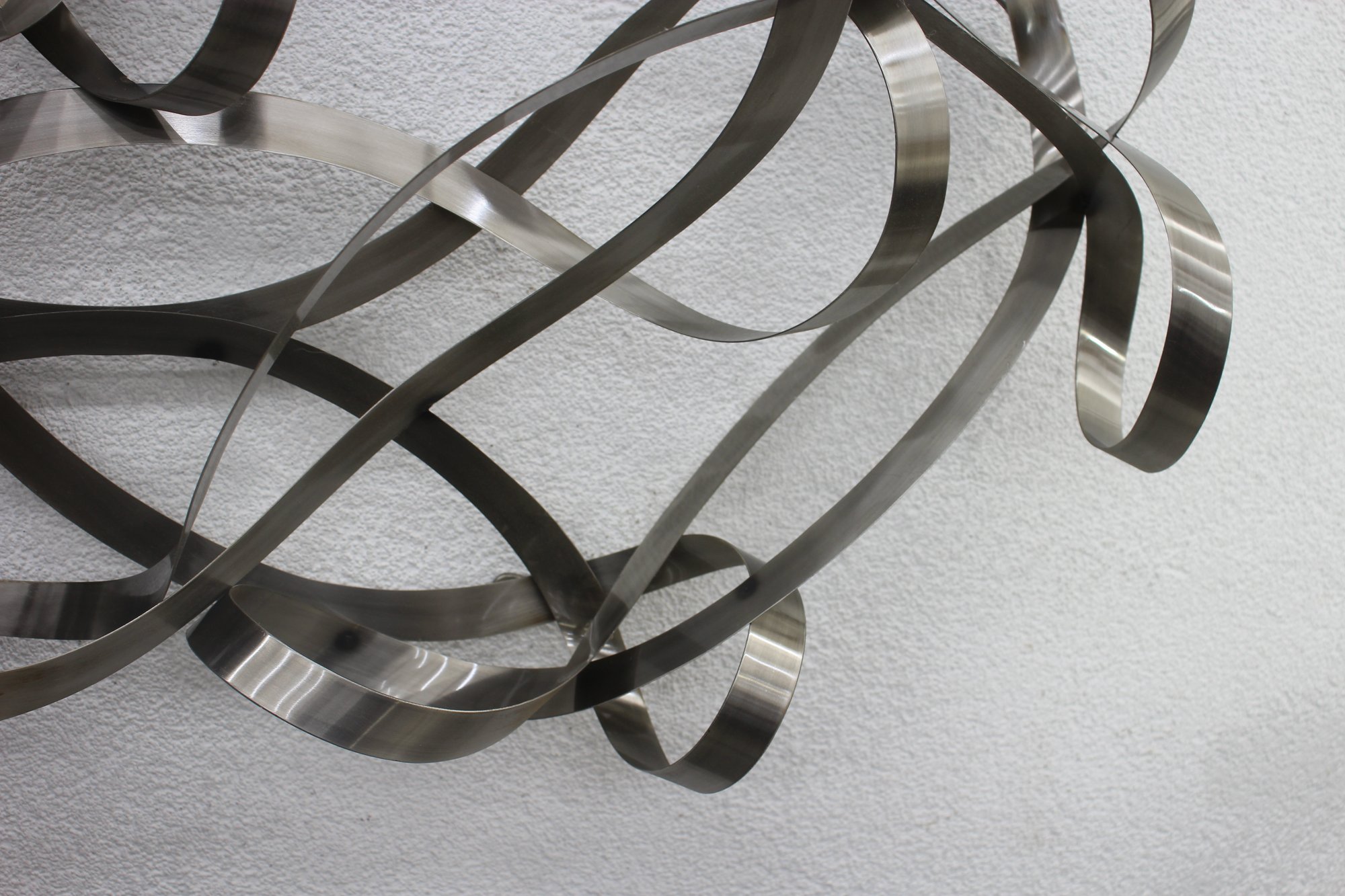stunning large-scale abstract metal ribbon sculpture is a true statement piece, featuring flowing, interwoven stainless steel ribbons that create a dynamic and modern aesthetic.