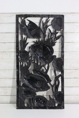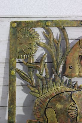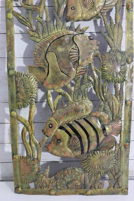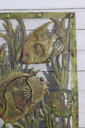 Beautiful large metal wall art hanging featuring an underwater tropical fish scene with multiple fish swimming among coral, sea plants and reef foliage. This piece has wonderful texturing, layered cut-out detailing and a rustic patina style finish that gives it depth and visual movement.