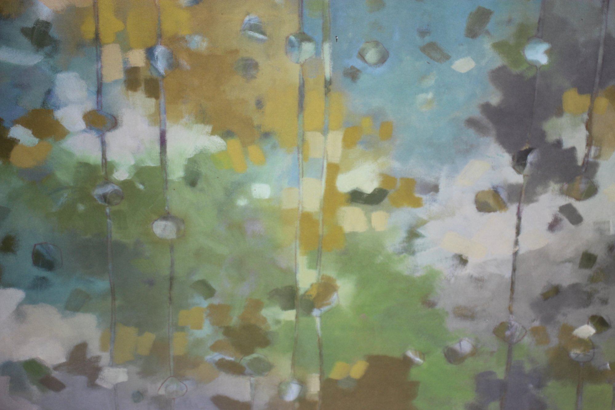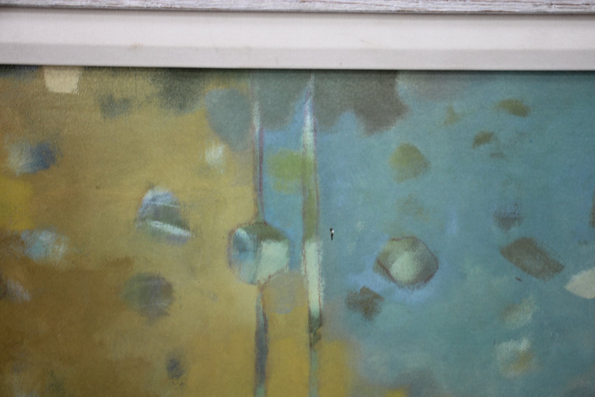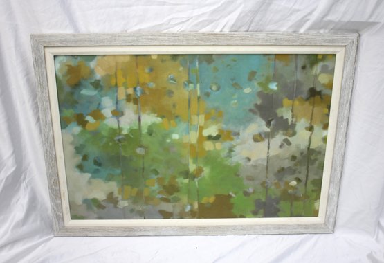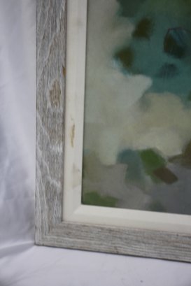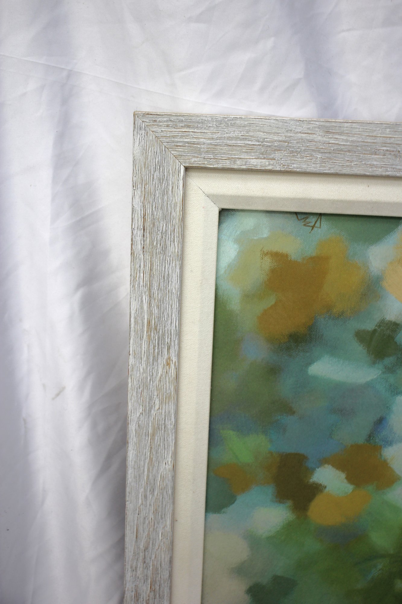 Add a touch of modern elegance to your space with this stunning abstract impressionist painting. Featuring a mesmerizing blend of blues, greens, and earthy gold tones, this piece evokes the serene essence of nature with a contemporary flair. The artwork is beautifully framed in a rustic, whitewashed wood frame with an inner cream border, enhancing its sophisticated aesthetic.