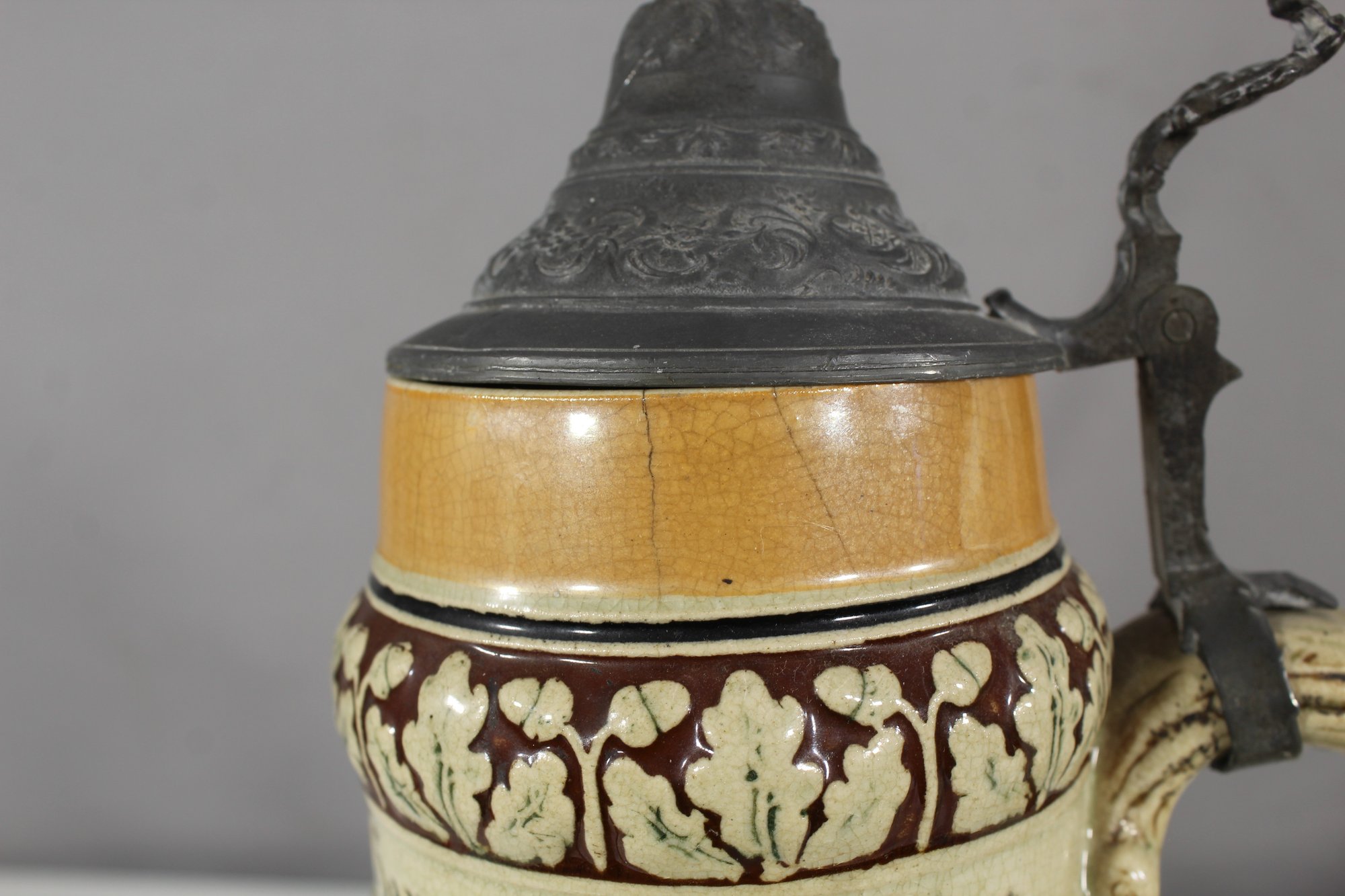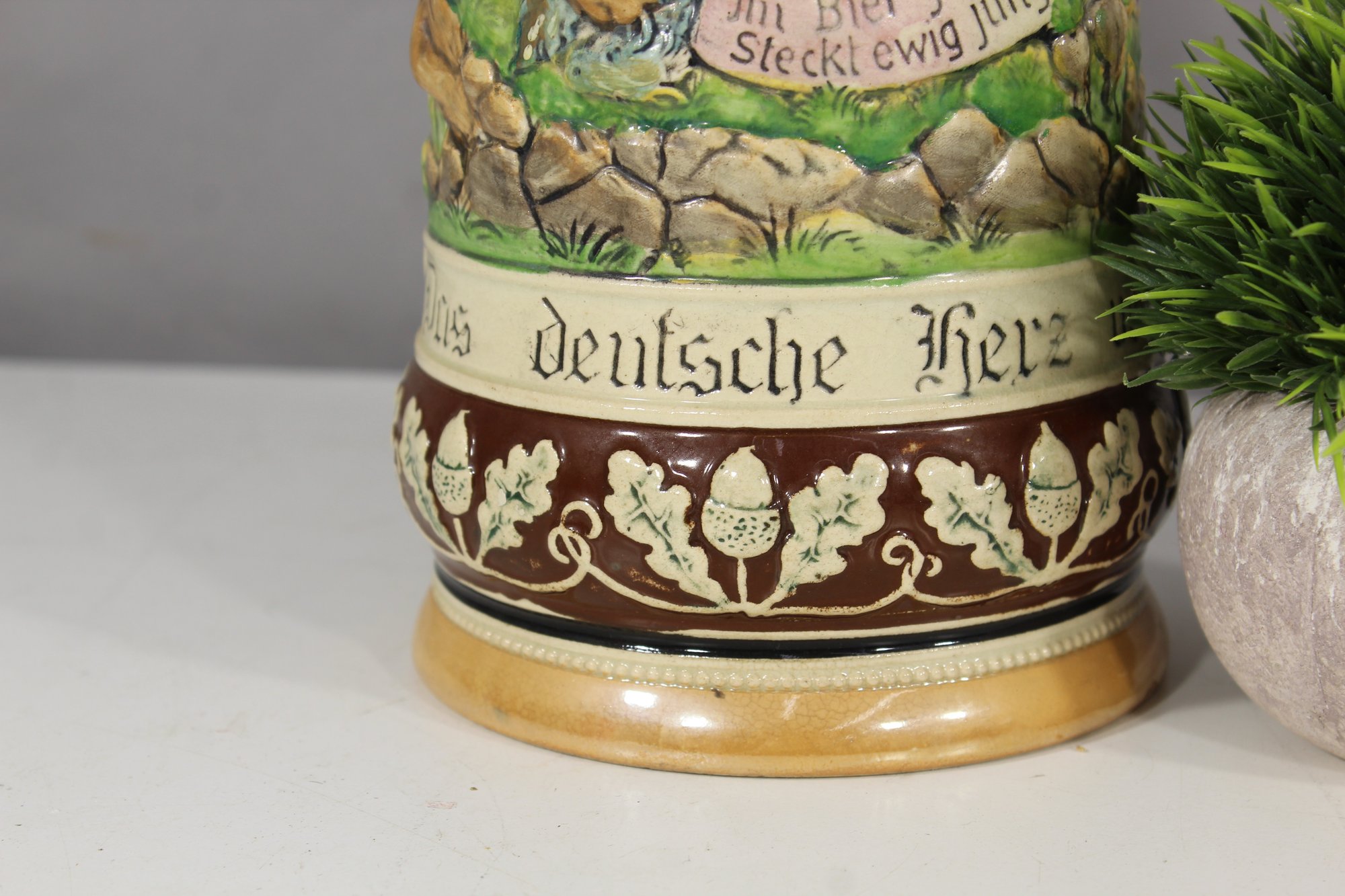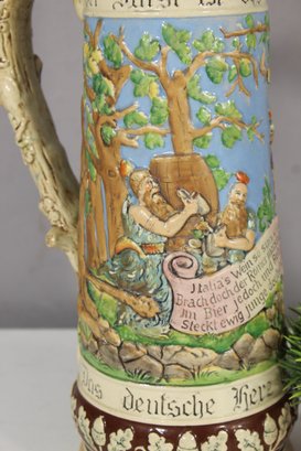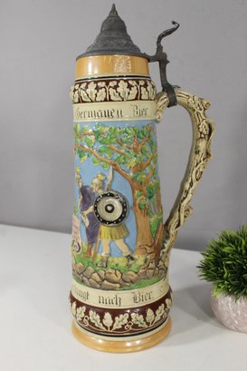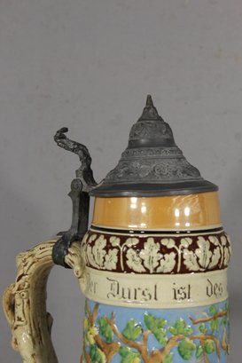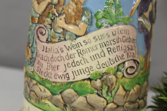 This remarkable antique German beer stein is a masterful blend of artistry and tradition. Featuring a vibrant, hand-painted relief scene, it celebrates German heritage with intricate detailing and craftsmanship.
