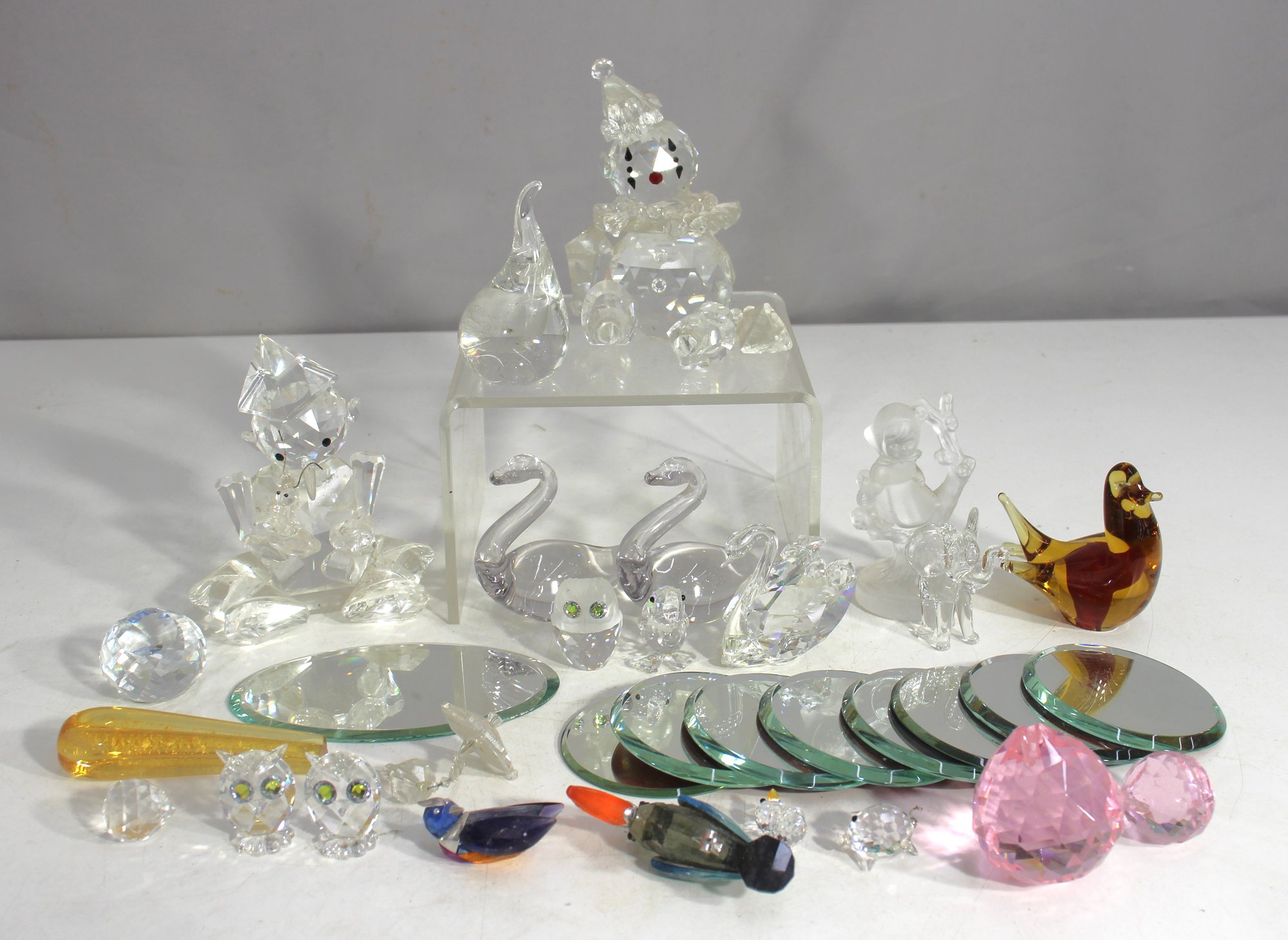 This large assorted lot of crystal and glass figurines includes a variety of beautifully crafted pieces, featuring owls, swans, birds, and decorative accents. Some pieces are in excellent condition, while others may have minor flaws or signs of wear, making this an ideal lot for collectors, crafters, or restoration enthusiasts.