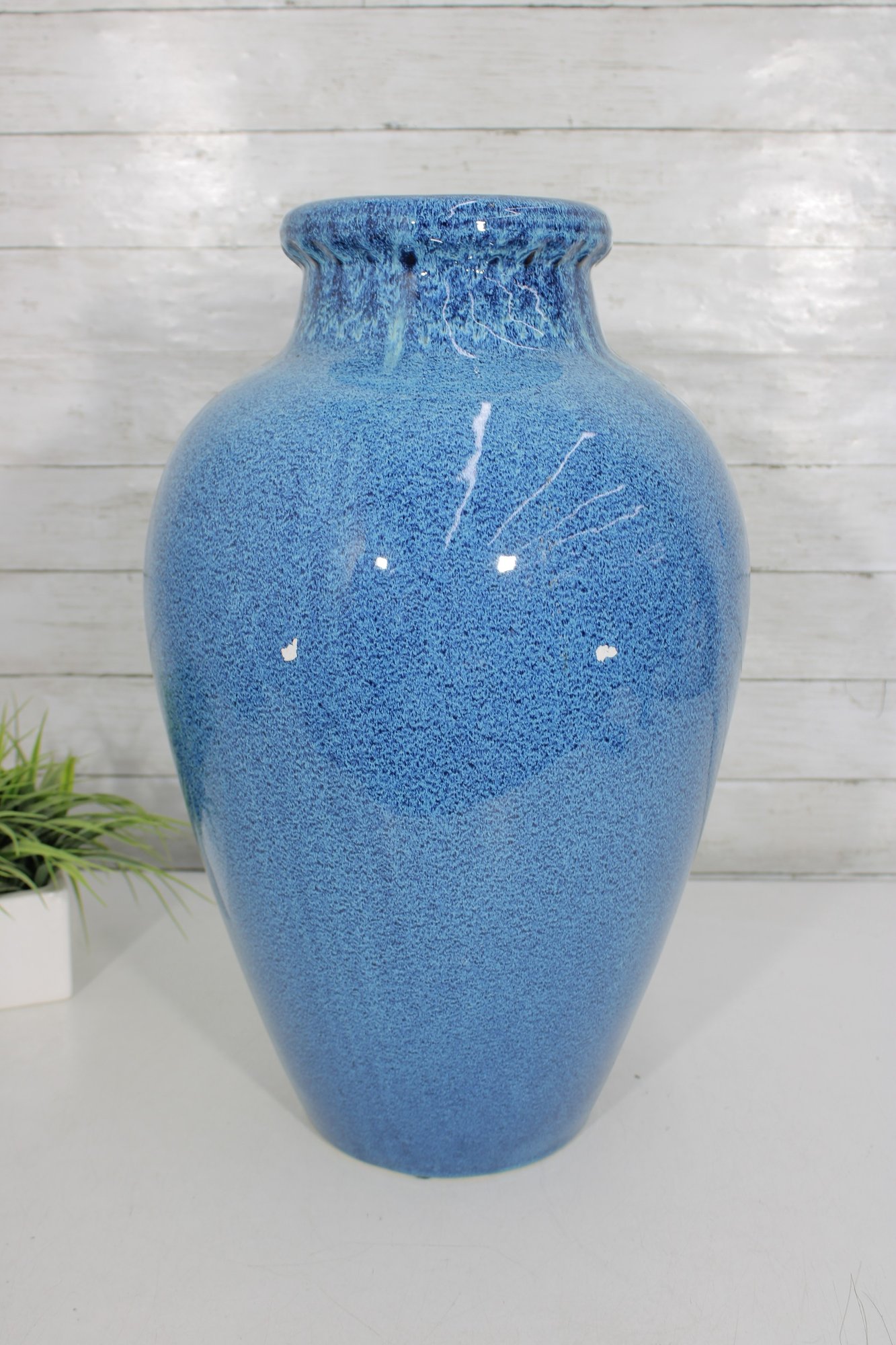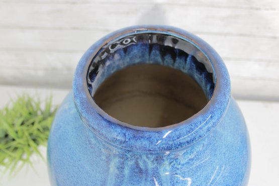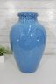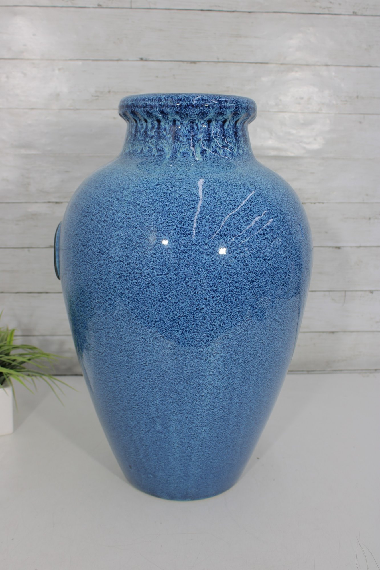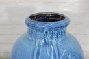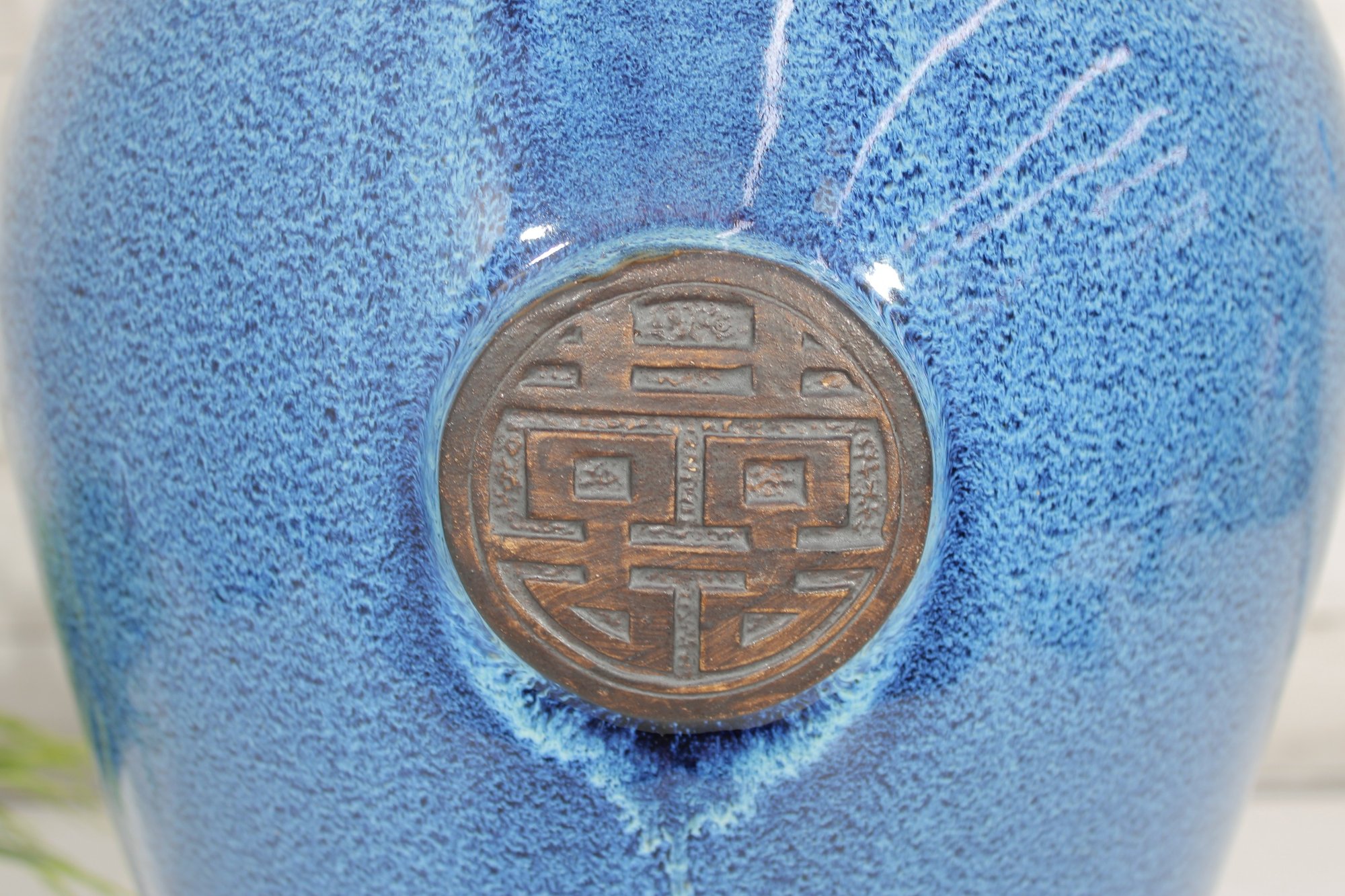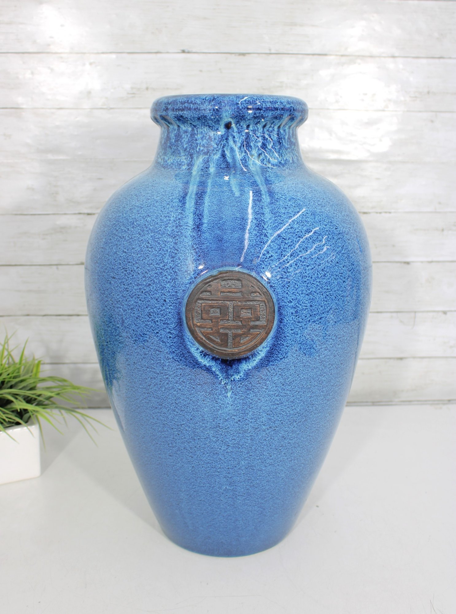 Striking large ceramic floor vase featuring a vibrant blue speckled glaze and elegant tapered form. The body is accented with a decorative medallion motif, giving the piece an Asian-inspired aesthetic that works beautifully in both modern and traditional interiors. Its substantial 21" height makes it a standout decorative accent for entryways, living rooms, or display settings.