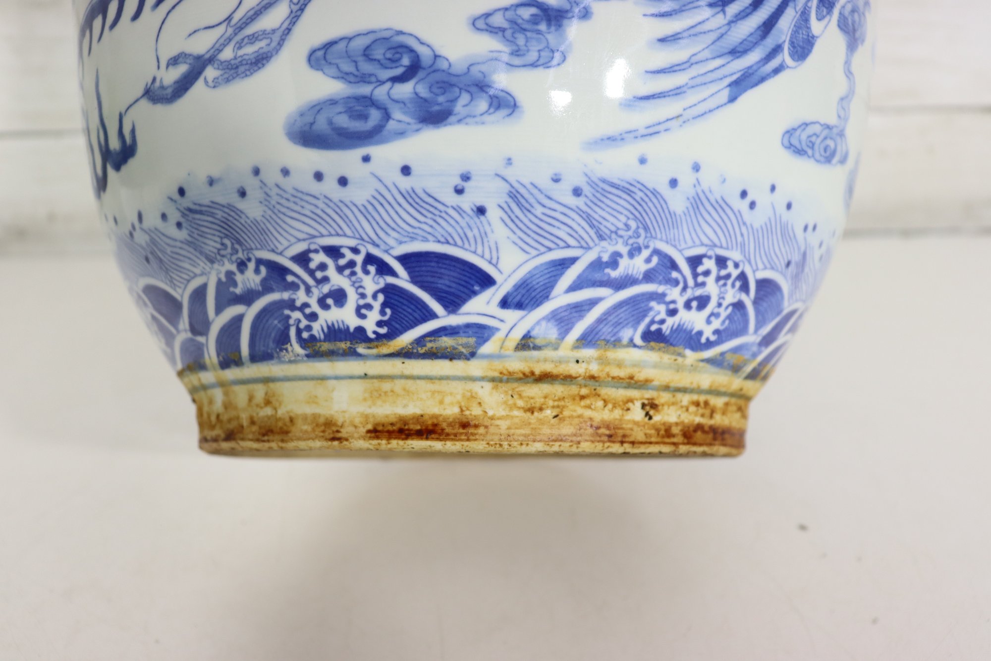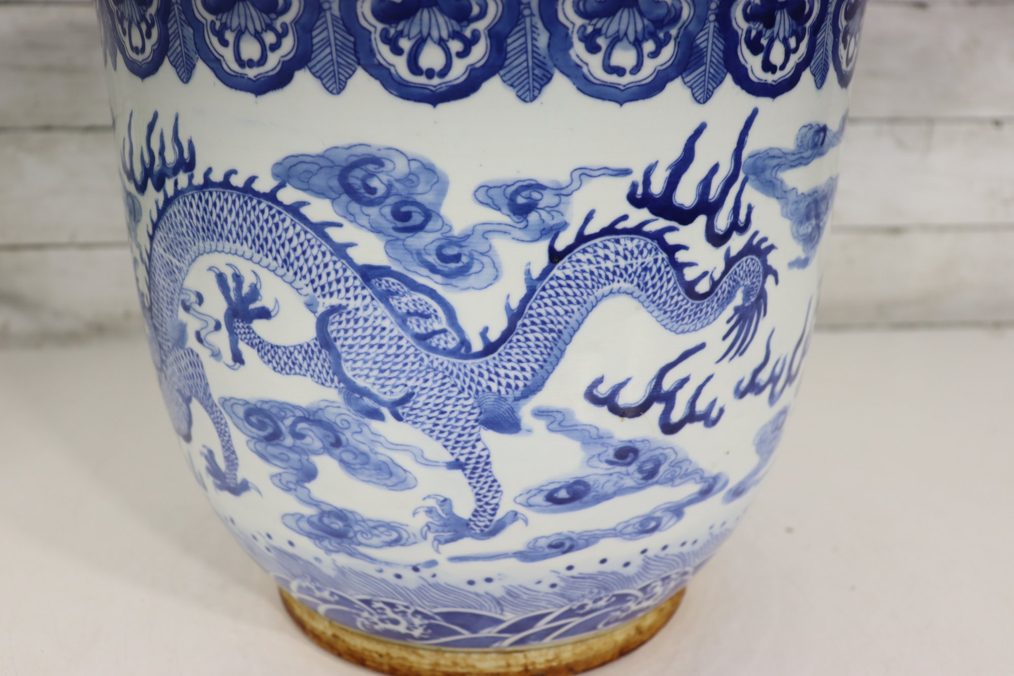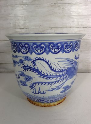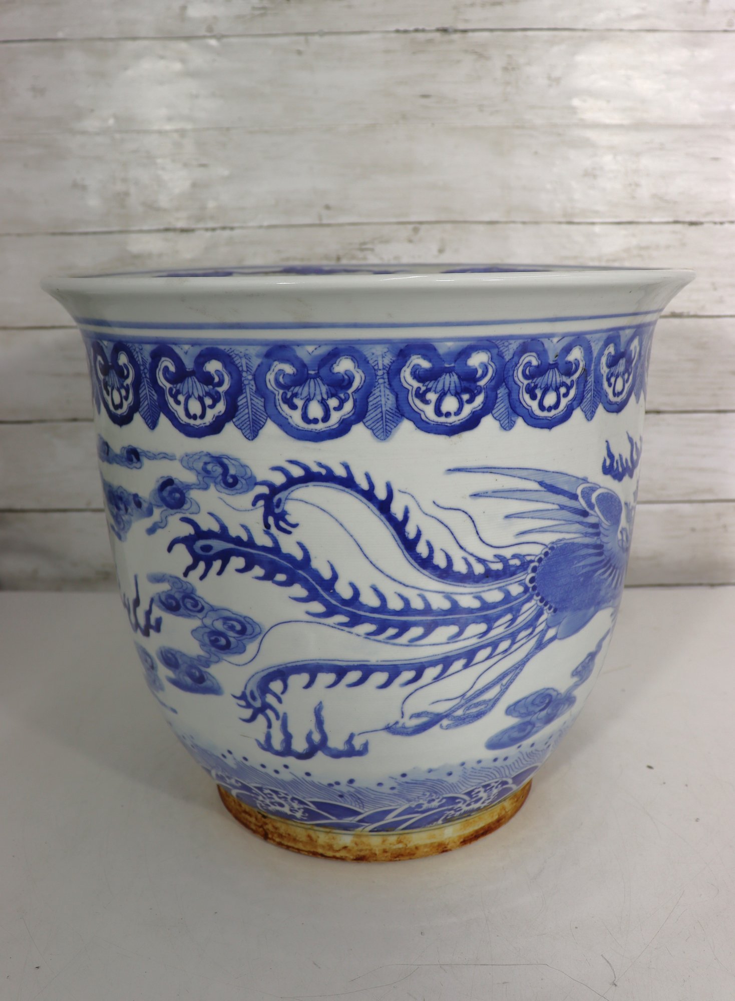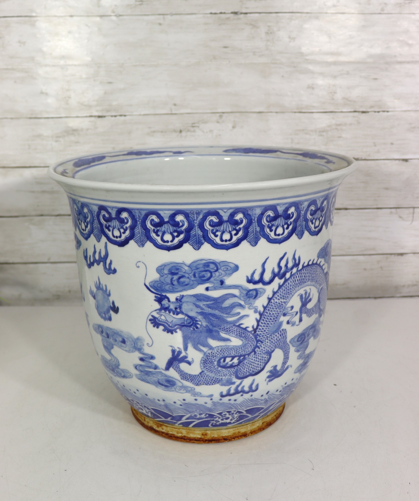 Beautiful large blue & white porcelain planter pot featuring detailed dragon design all around. Classic Asian decorative styling with wave & cloud border pattern. Great size for indoor plants, palms, fig trees, decorative display, or use as a statement cachepot.
