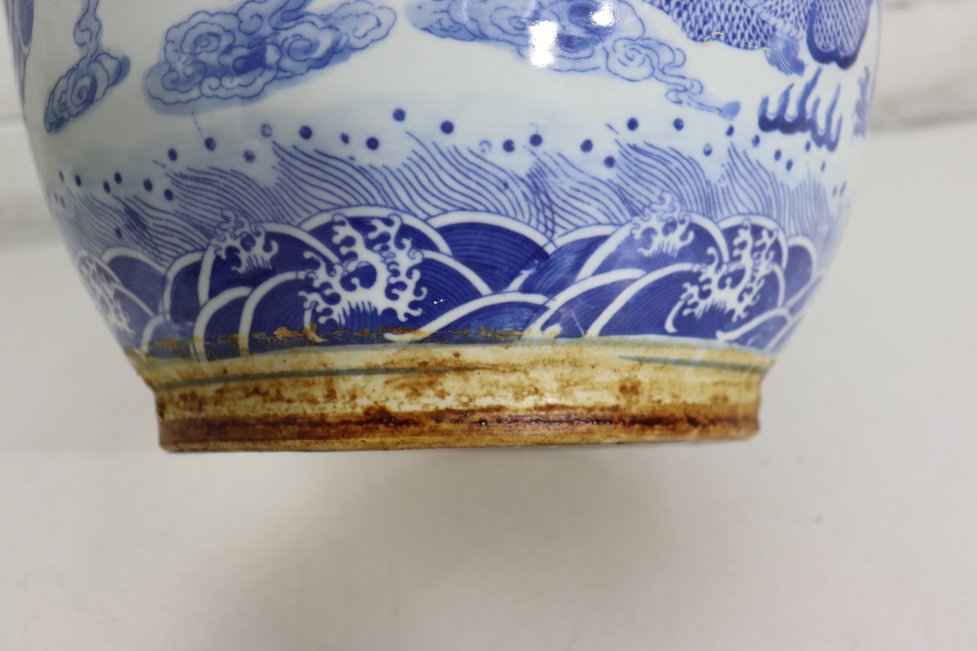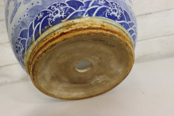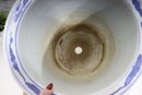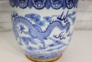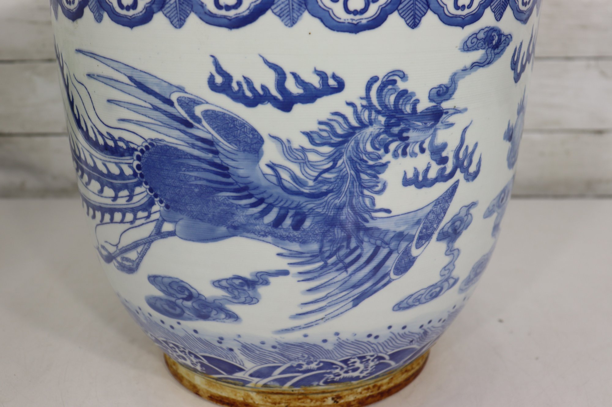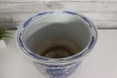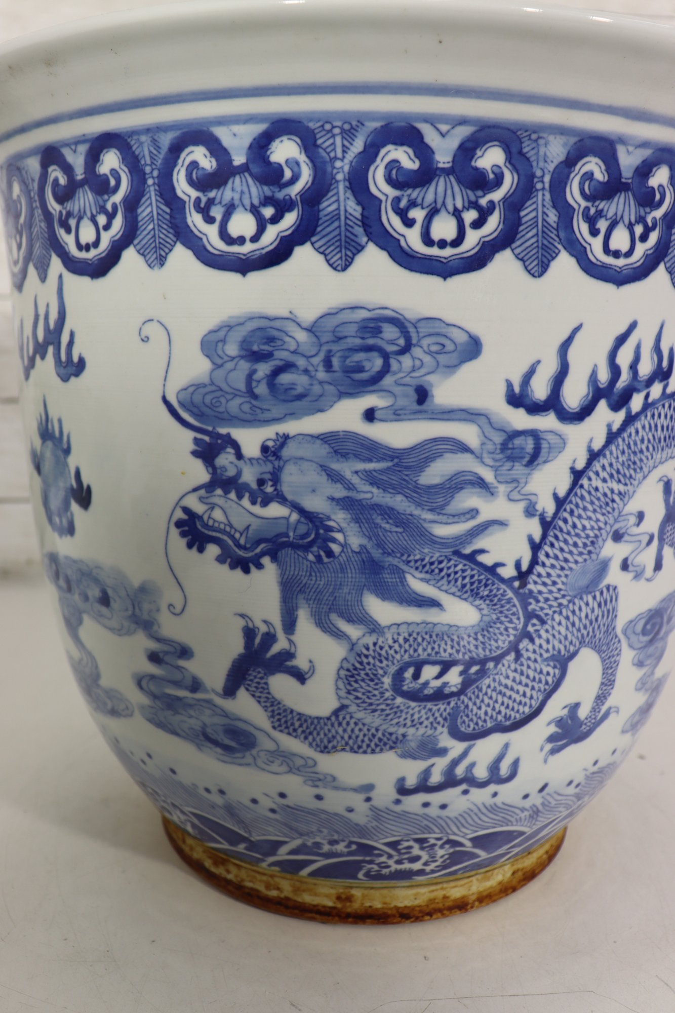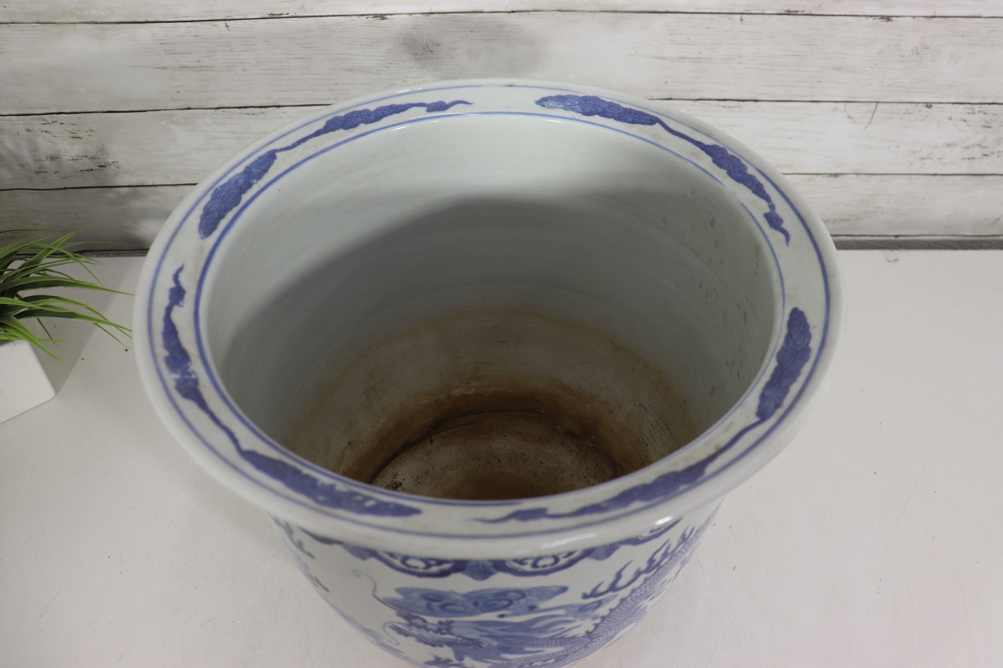 Beautiful large blue & white porcelain planter pot featuring detailed dragon design all around. Classic Asian decorative styling with wave & cloud border pattern. Great size for indoor plants, palms, fig trees, decorative display, or use as a statement cachepot.