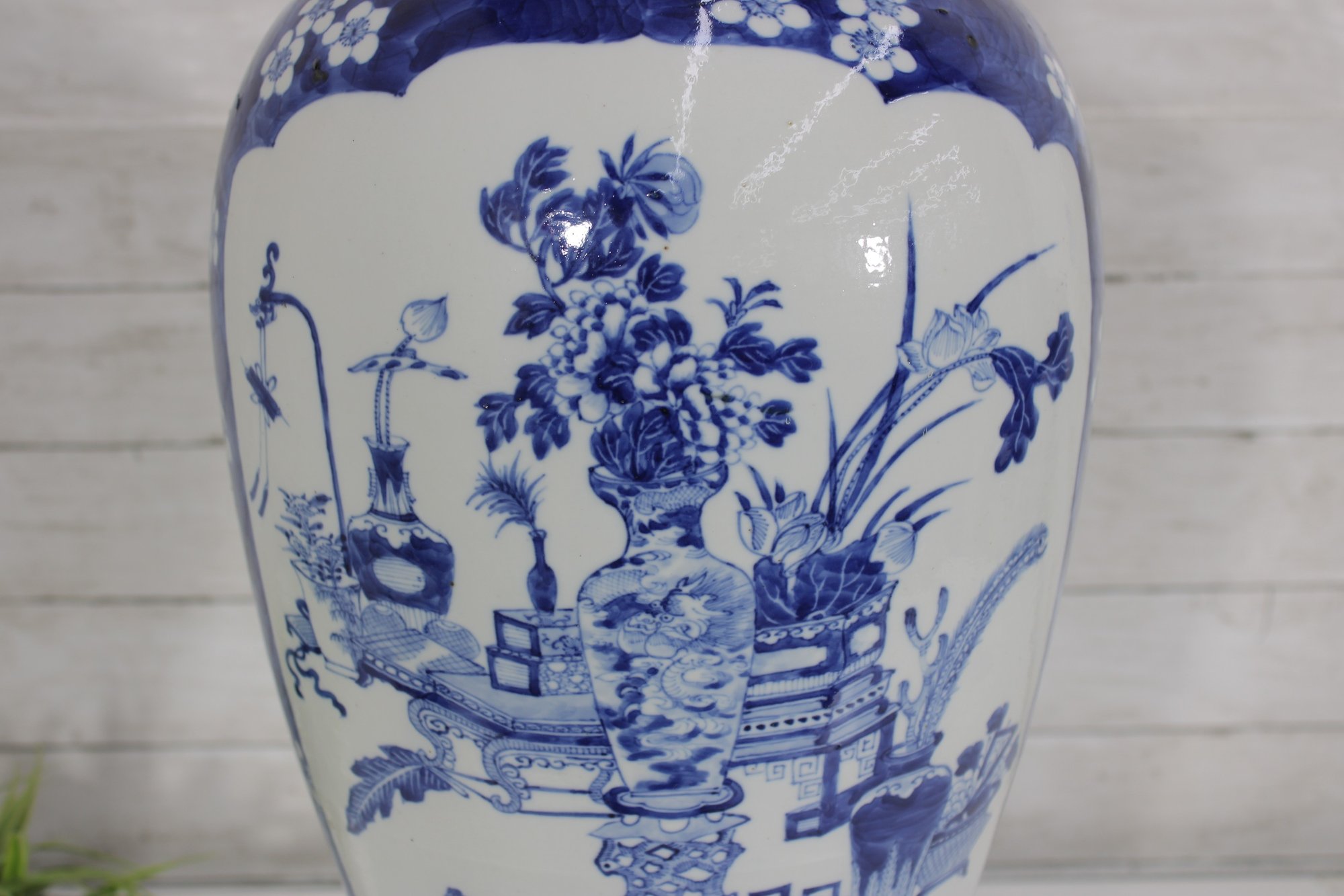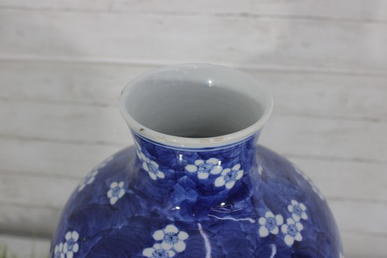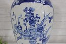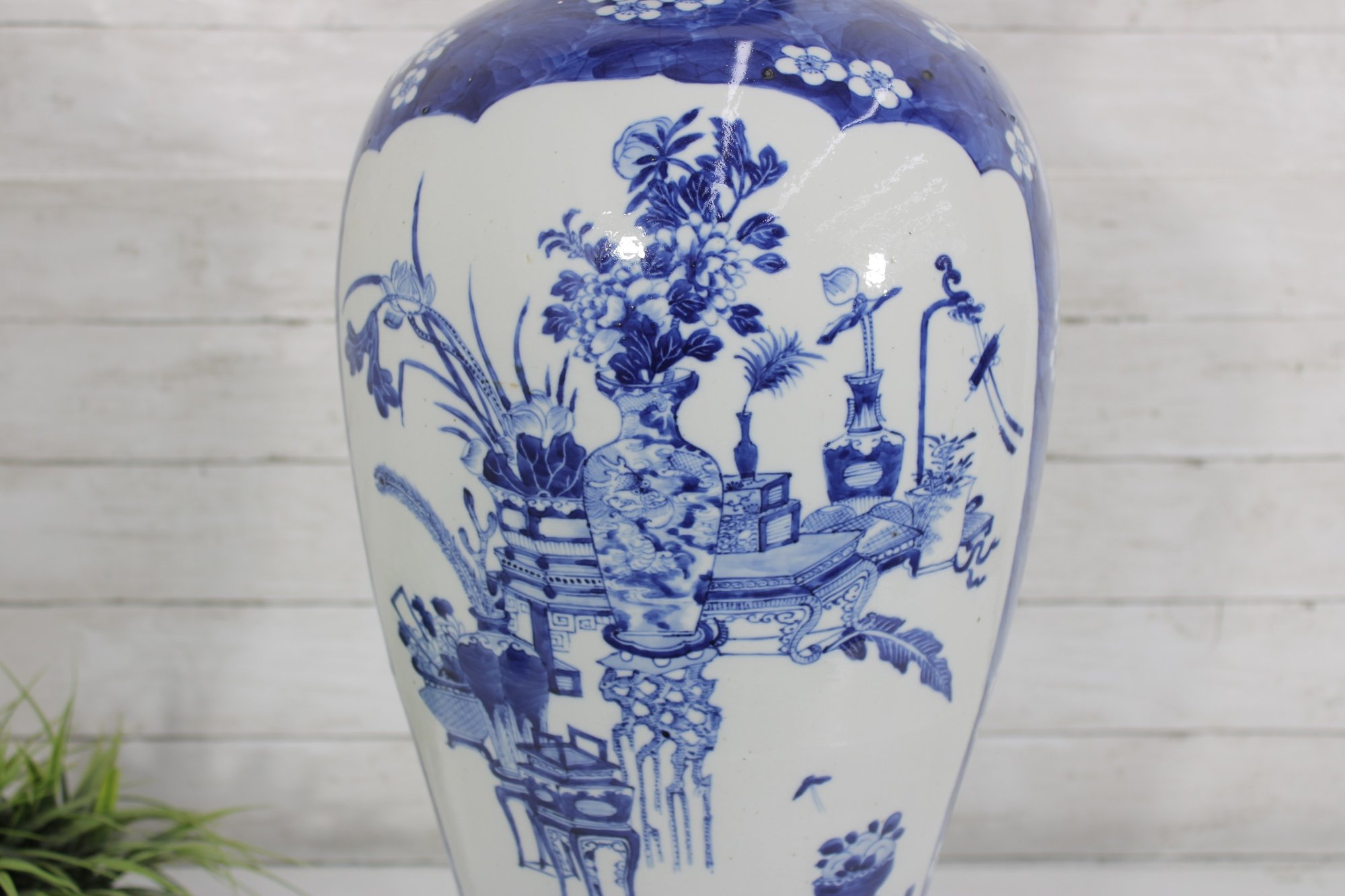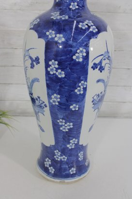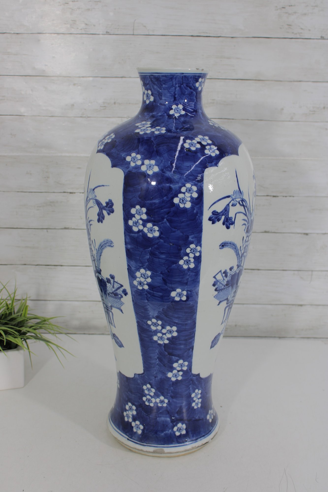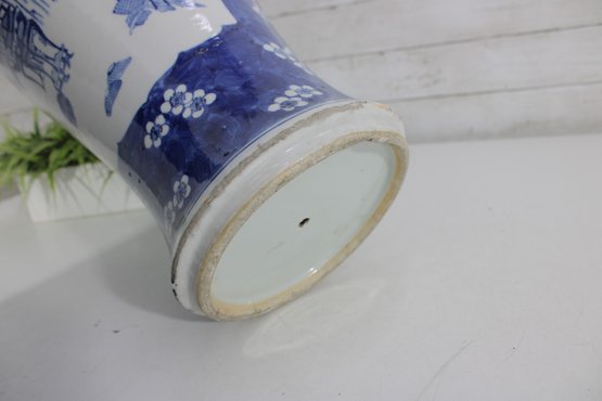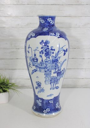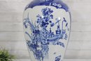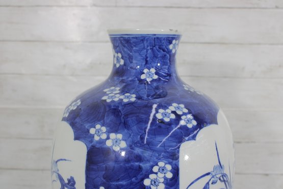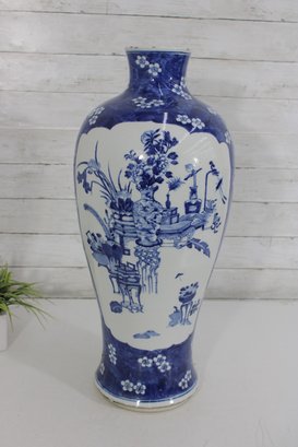an impressive large blue and white porcelain floor vase featuring traditional Asian-inspired scenic and floral motifs. This striking piece measures approximately 24 inches tall, making it a bold decorative statement.